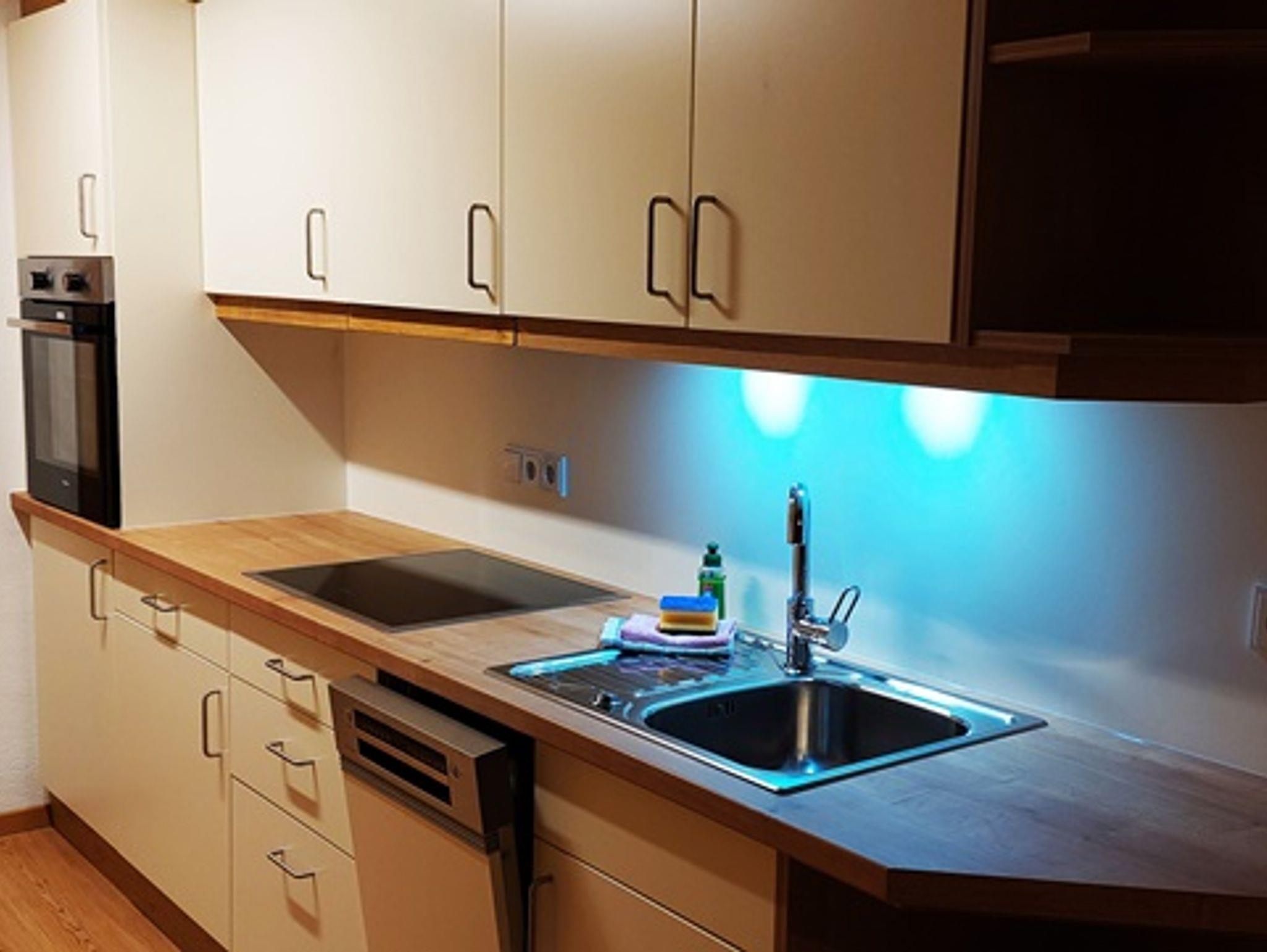 Küchenzeile mit Spülmaschine und Vollausstattung.