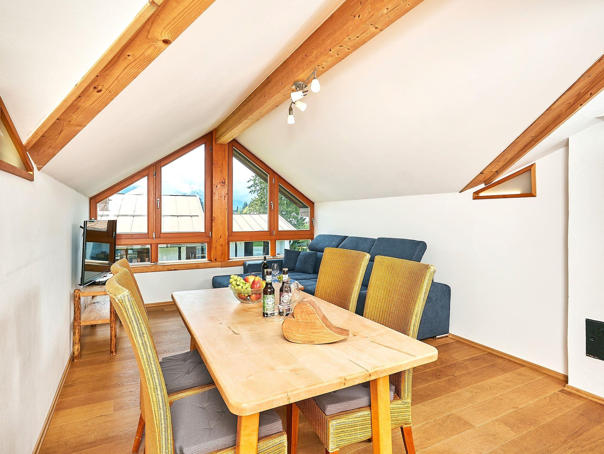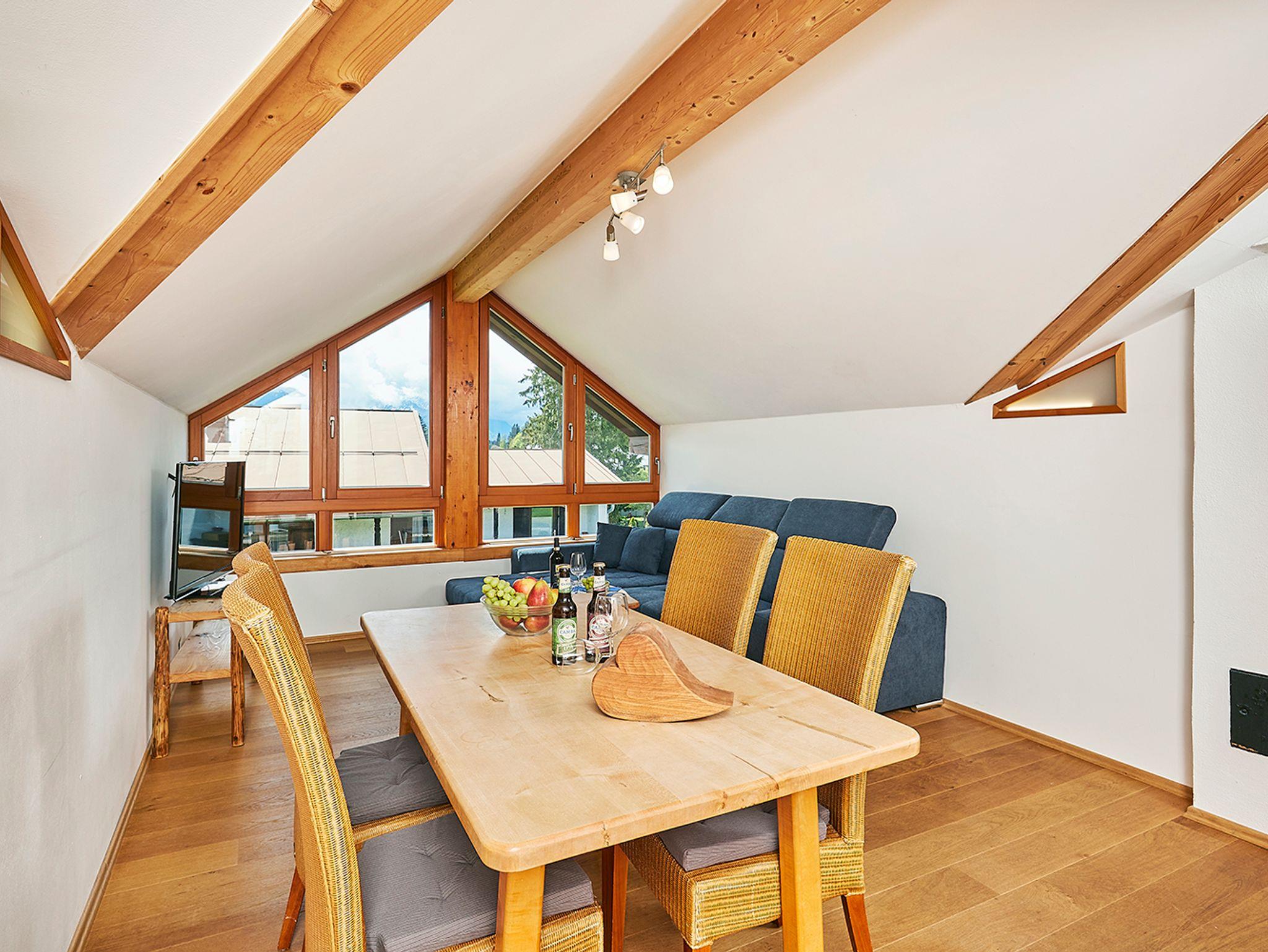 Treten Sie ein in diese großzügige Dachwohnung, die auf einer eigenen Etage Ihre ganz persönliche Auszeit verspricht. Zwei Schlafzimmer, zwei Balkone und ein wunderschöner Ausblick auf die majestätischen Berge schaffen eine Atmosphäre, in der Sie sich rundum wohlfühlen werden. Die komplett ausgestattete Küche lässt keine Wünsche offen und lädt zu gemeinsamen Kochabenden ein. Der große Wohnbereich mit einem gemütlichen Ecksofa und einem Flachbild-TV ist der perfekte Ort, um den Tag bei einem guten Film oder einem spannenden Buch ausklingen zu lassen. Die beiden Schlafzimmer bieten nicht nur Ruhe, sondern auch einen Platz für Entspannung – sei es im gemütlichen Doppelbett oder auf der Couch mit Blick auf die Natur. Das Badezimmer ist ein Ort der Erfrischung mit einer modernen Dusche und einem Fön. Genießen Sie die frische Bergluft auf den Balkonen – einer nach Osten, der andere nach Westen – und lassen Sie sich von den wechselnden Lichtstimmungen verzaubern.