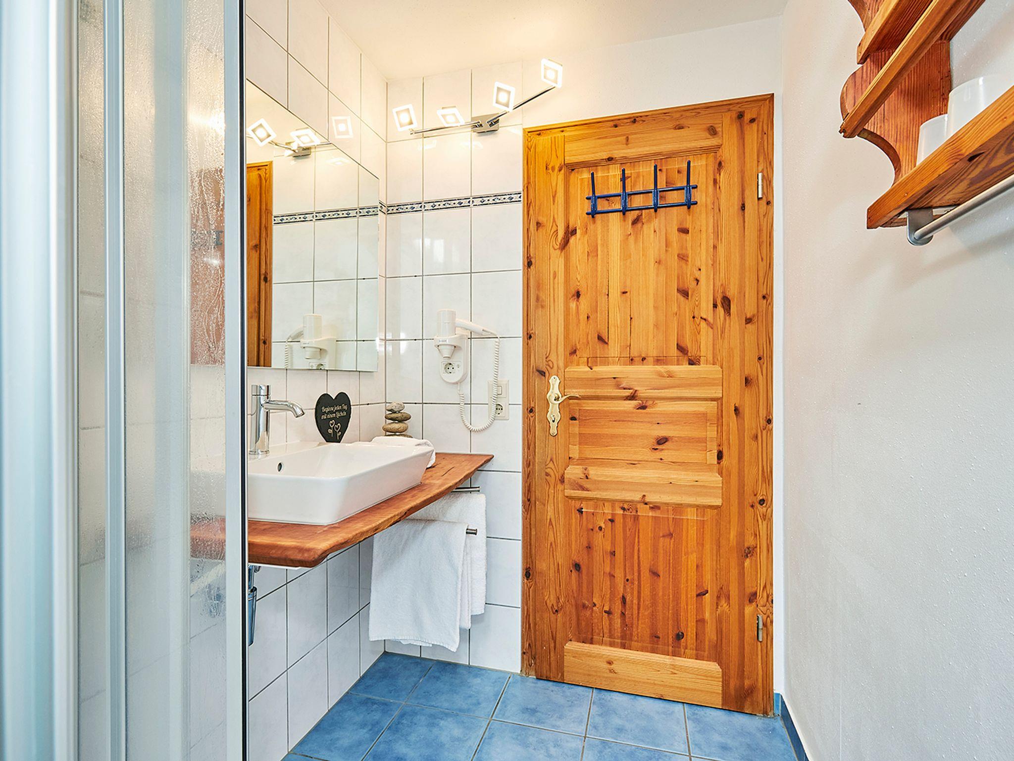 Das Bad ist mit Dusche, WC, Waschtisch und Fön ausgestattet.