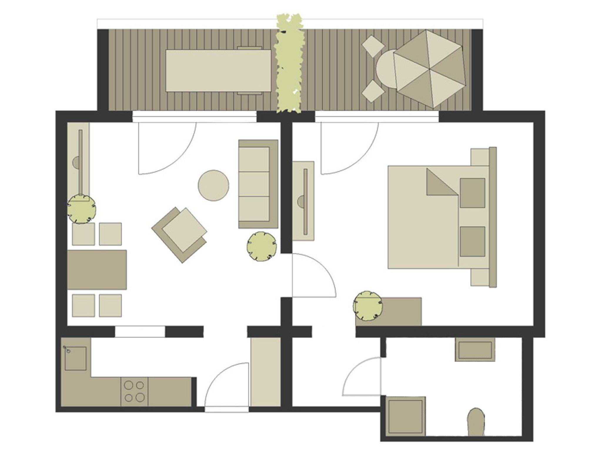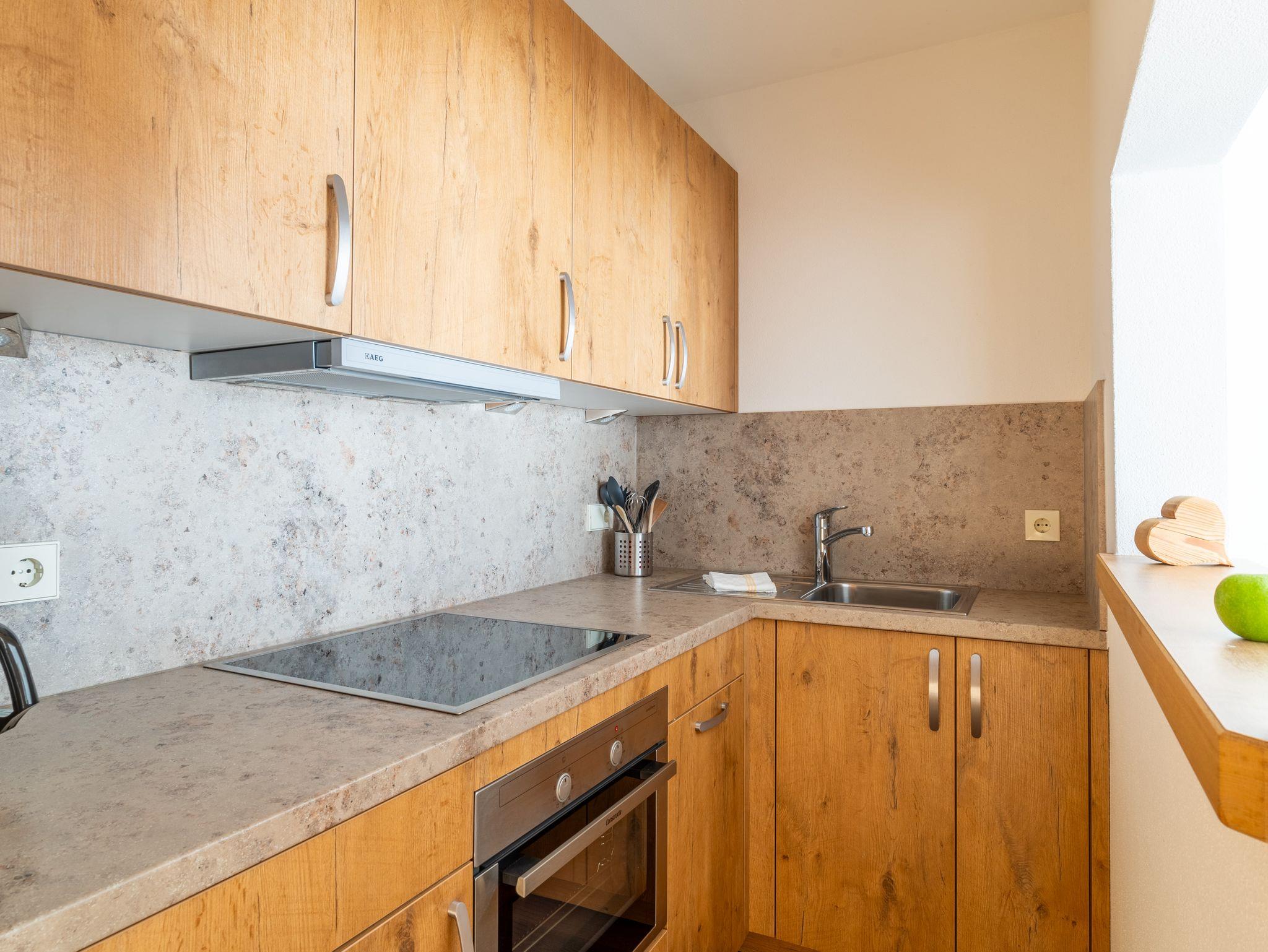 Die neu renovierte, großzügige 2-Raumwohnung im 2. OG hat eine Größe von ca. 55 qm. Die exklusive Wohnung verfügt über ein Schlafzimmer mit DU/WC (Fußbodenheizung), eine hochwertige moderne Küche (mit Geschirrspüler, Backofen, 4-Platten-Ceranfeld, Kaffeemaschine, Toaster, uvm.) und ein schönes helles Wohn/Esszimmer mit Panoramafenster, gemütlicher Essecke und einer hochwertigen Ausziehcouch. Von den großen West-Balkonen hat man einen traumhaften Blick auf das Kaisergebirge und den Unterberg.