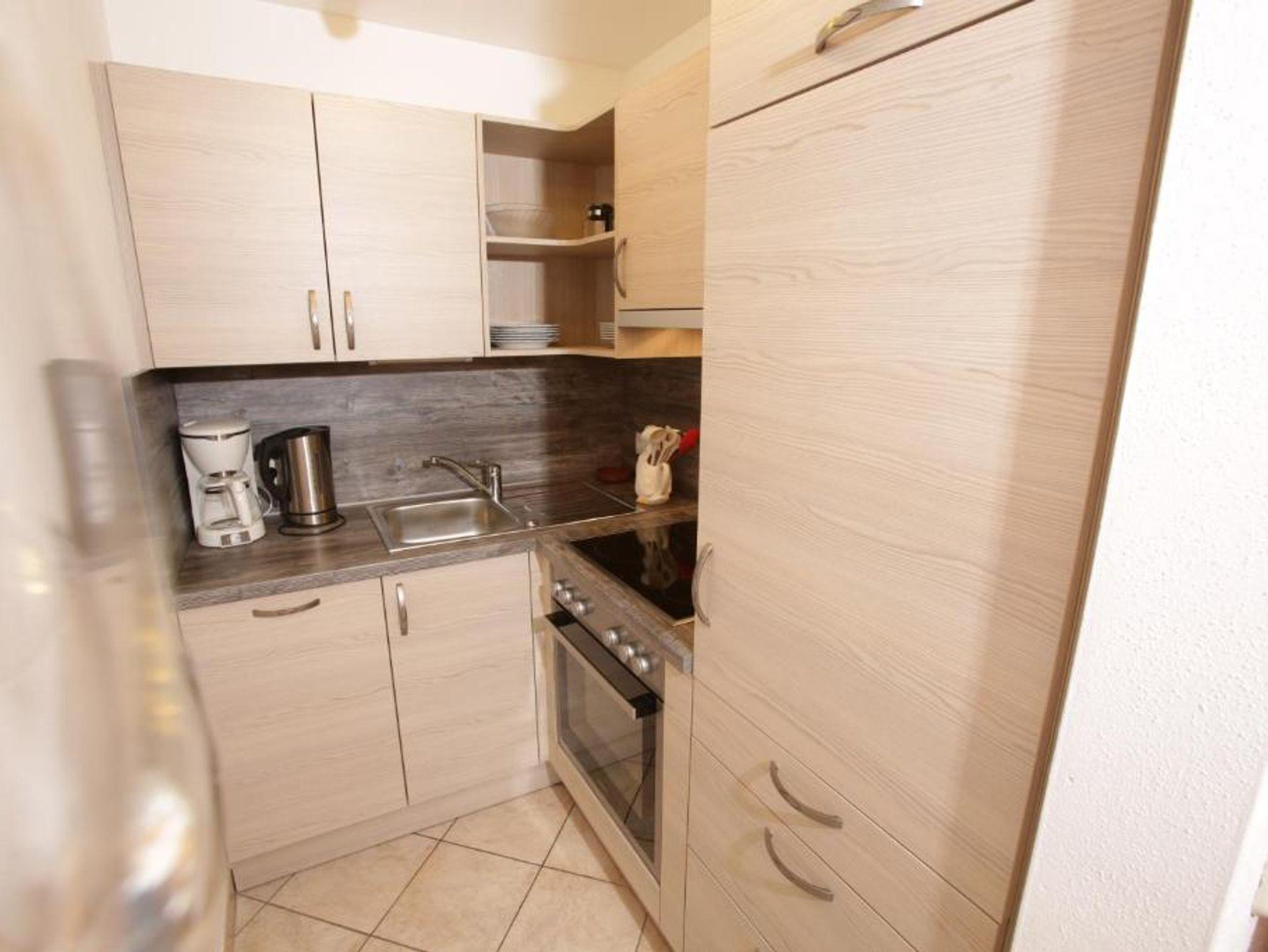 Die Zwei-Raum-Ferienwohnung ist ausgestattet mit Doppelbett, Polstergarnitur mit Lattenrost, Sitzecke sowie Dusche/WC. Die Küche ist mit 2 Kochplatten, Kühlschrank sowie einer Kaffeemaschine ausgestattet. Ein Toaster kann ausgeliehen werden. Durchwahltelefon und Kabel-TV komplettieren die Ausstattung dieser Wohnung.