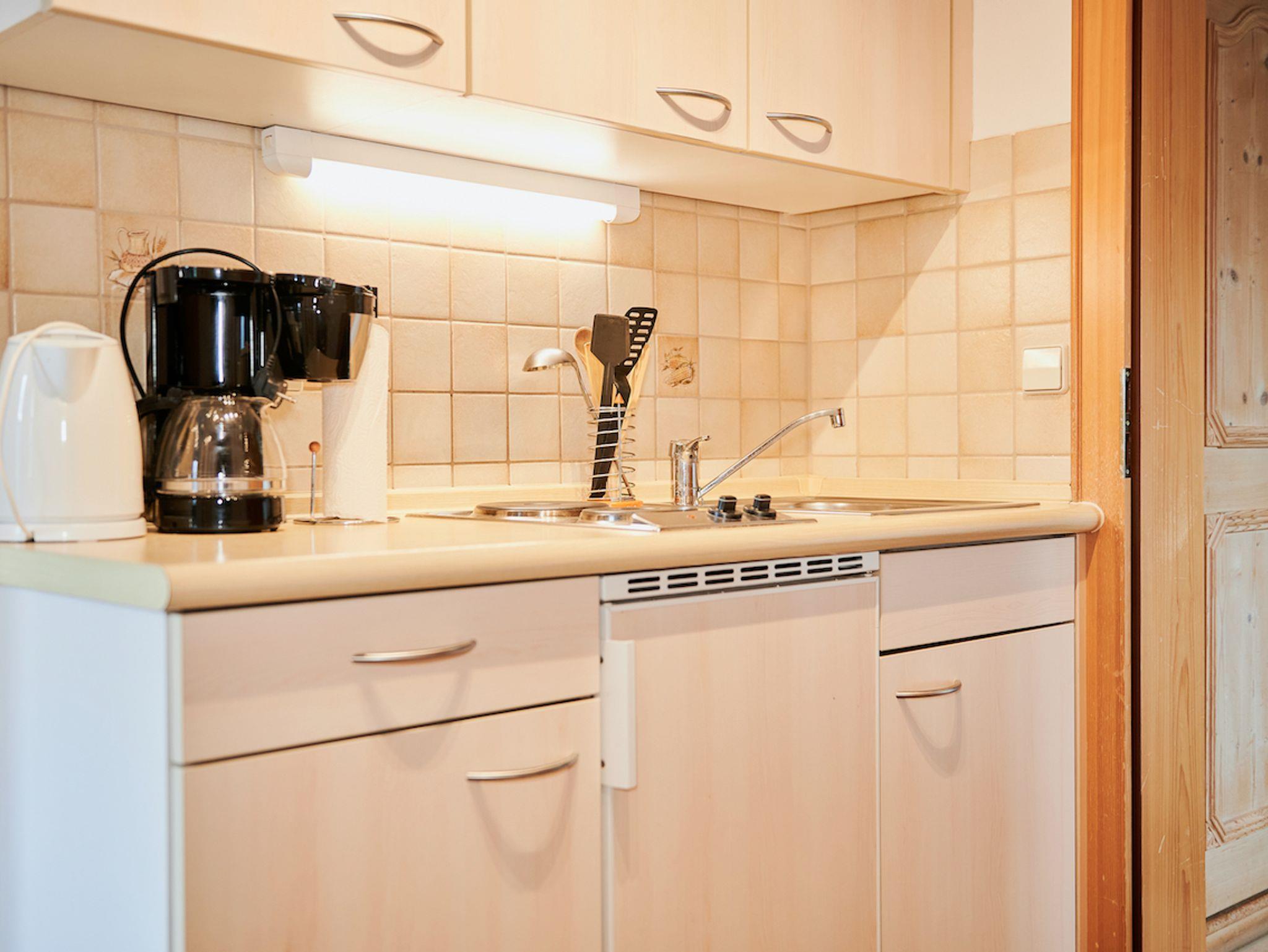 • Gut ausgestattete, kleine Küchenzeile im Flur mit 2-Plattenherd und Mikrowelle