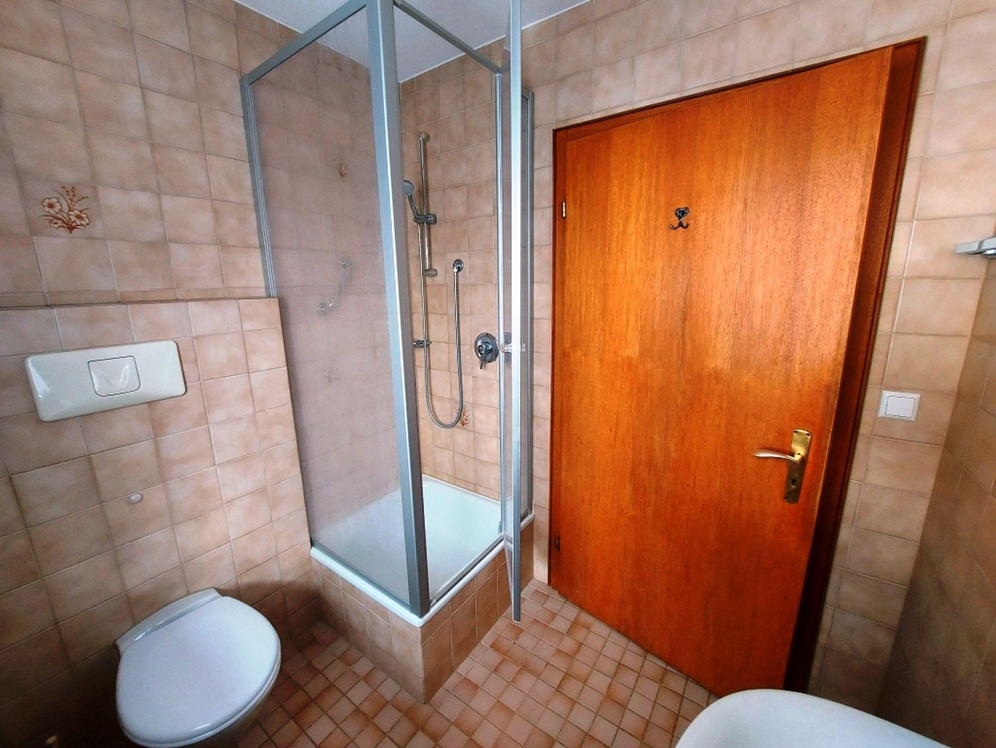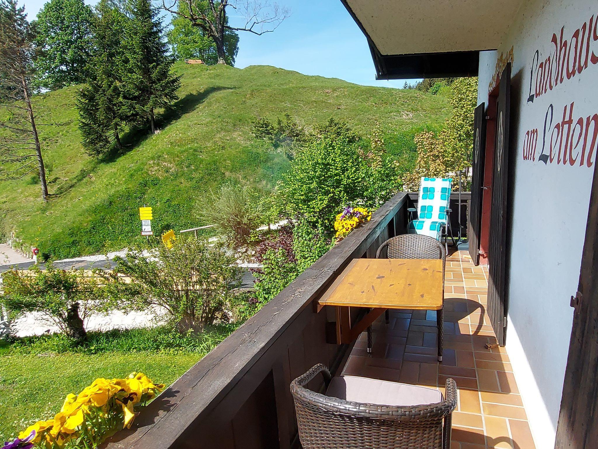 Der 9 qm große Südbalkon lädt mit schöner Aussicht zum Entspannen ein. Die Einrichtung ist im ländlichen Stil. Im Wohnzimmer gibt es eine gemütliche Sitzecke und eine ausziehbare Couch.