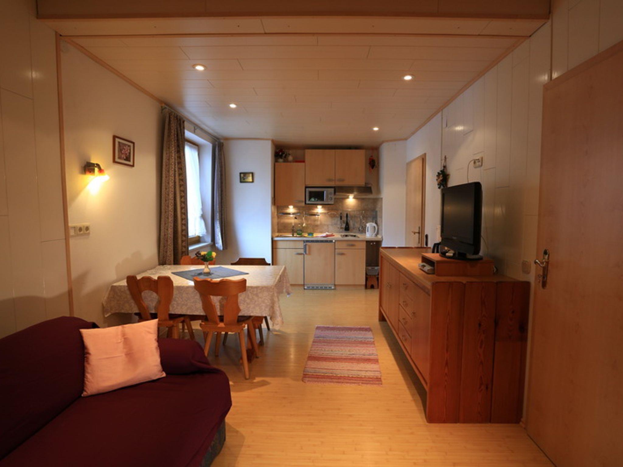 Diese Zwei-Raum-Wohnung mit 46 m² befindet sich im 2. Obergeschoß und bietet Platz für zwei Personen. Die Wohnküche ist ausgestattet mit Mikrowellenherd, 2-Platten-Herd, Kühlschrank mit Gefrierfach, Kaffeemaschine, Toaster, Eier- und Wasserkocher und verfügt über eine Essecke. Im Wohnbereich befindet sich eine gemütliche Schlafcouch sowie ein Flachbildfernseher. Das Schlafzimmer ist ausgestattet mit Doppelbett und einer gemütlichen Sitzgelegenheit. Bad mit Dusche/WC. Der eigene Balkon bietet einen herrlichen Blick auf das Kaisergebirge.