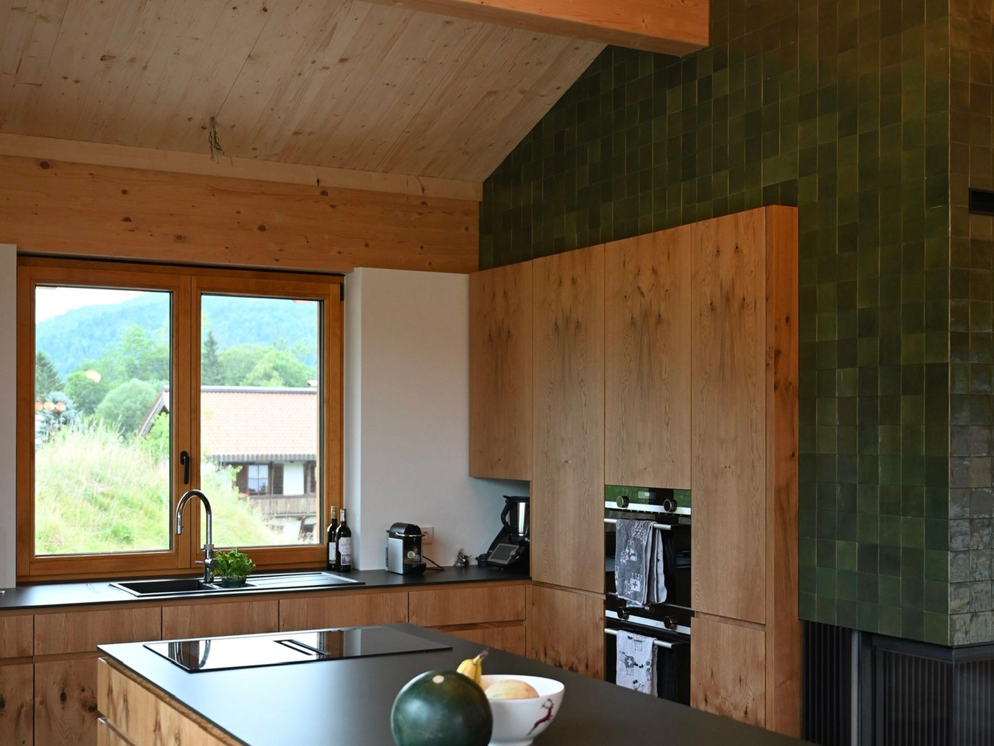 Das Haus hat im Obergeschoss einen offenen und hohen Wohnbereich mit Küche, Kochinsel und Wohnraum, bis zu 10 Personen können am großzügigen Tisch der Essecke Platz finden.