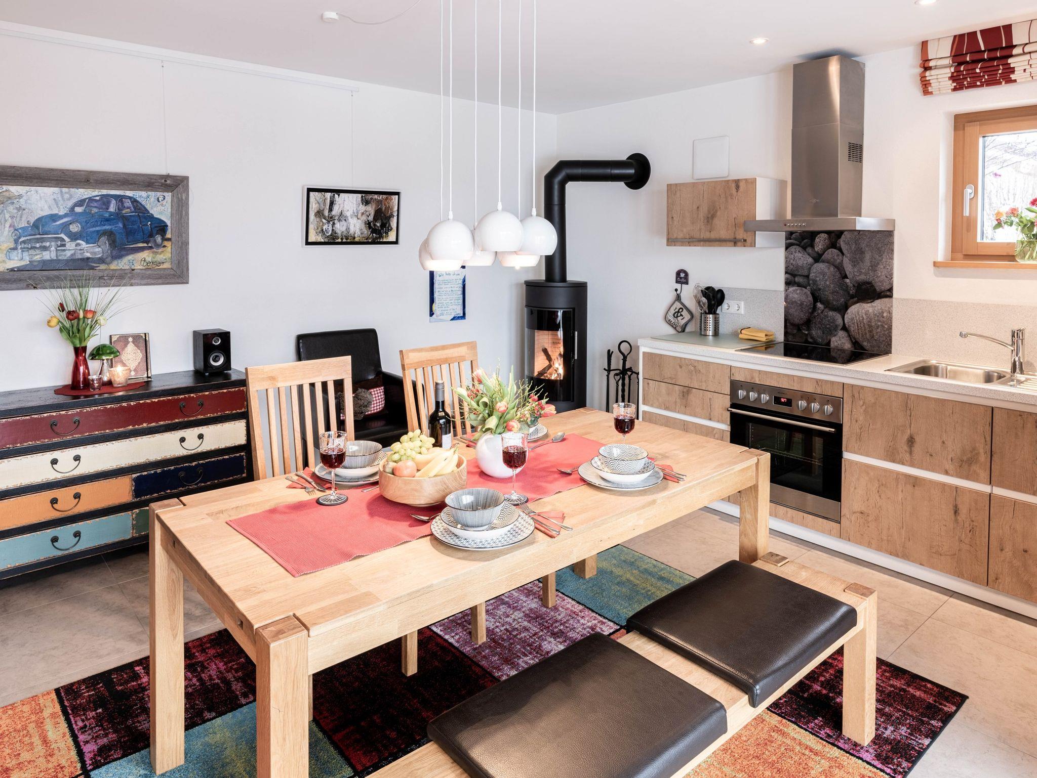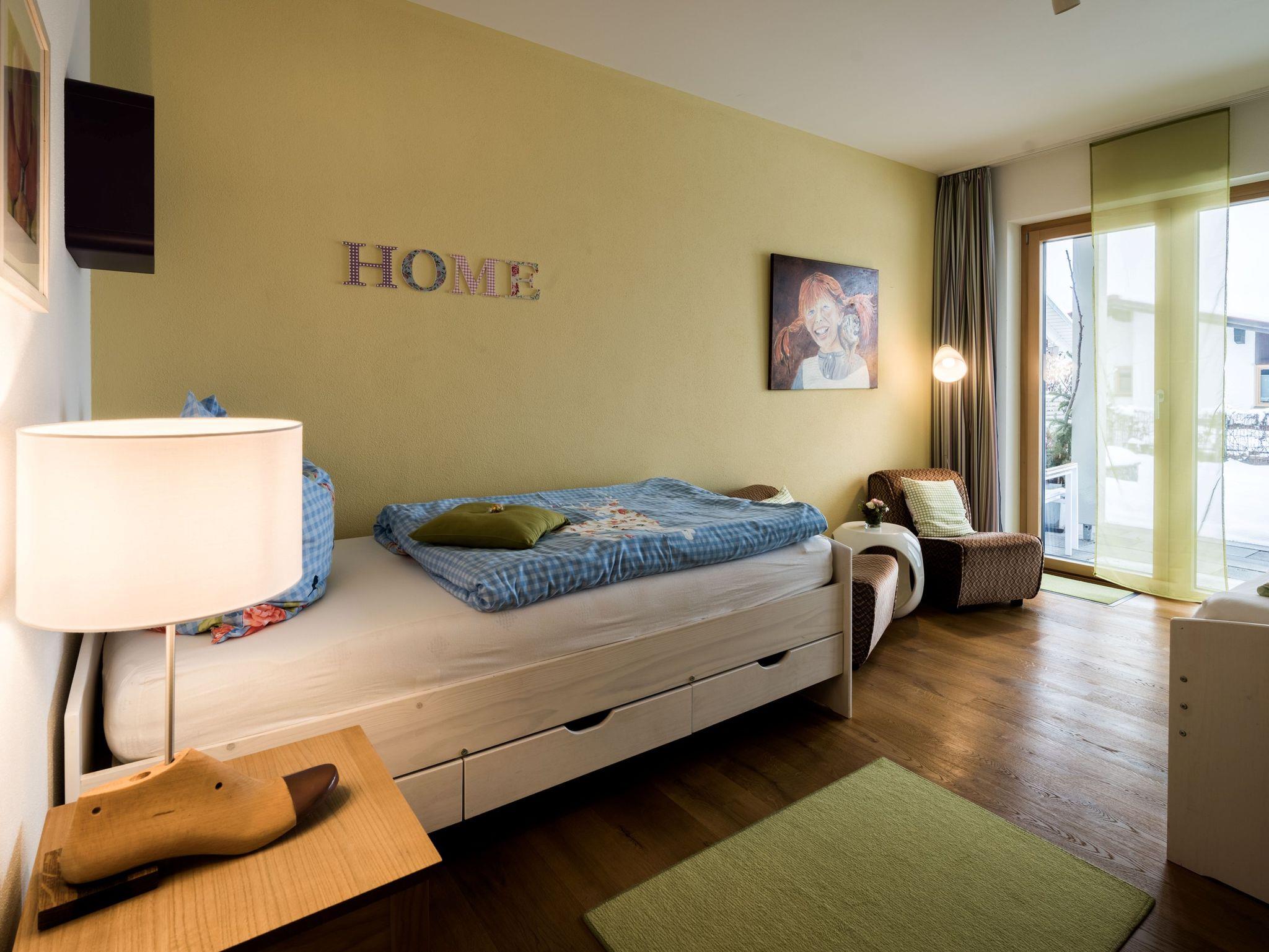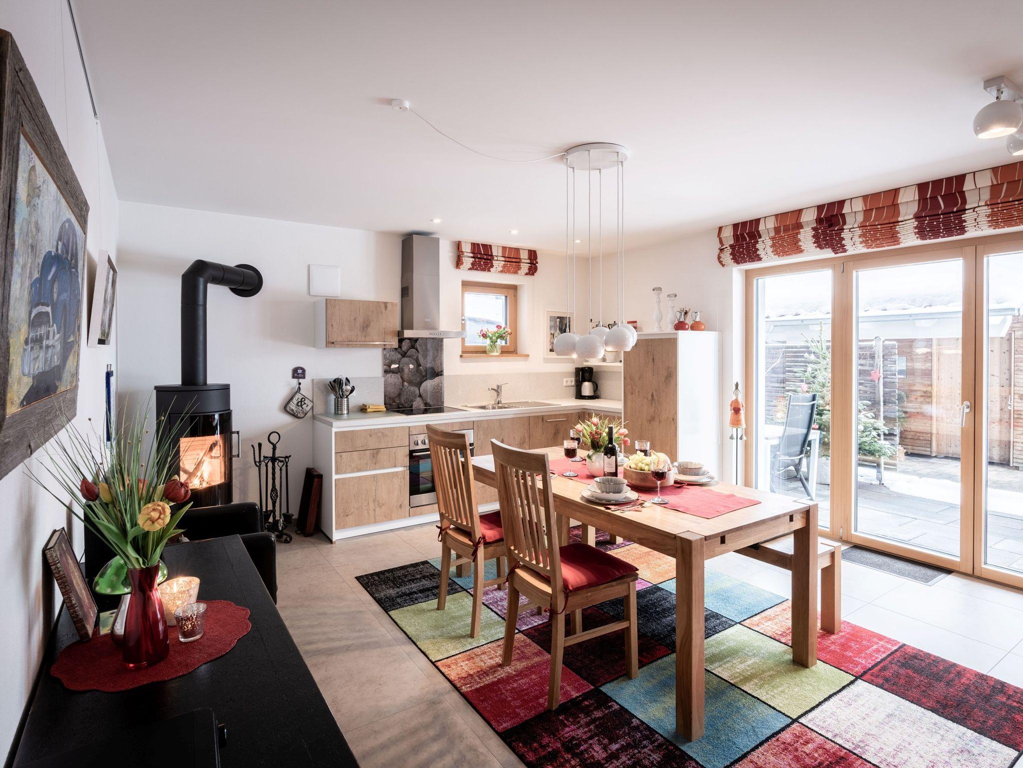 Die moderne Wohnküche (25m²) ist ausgestattet mit Geschirrspülmaschine, Backofen, Ceran- Kochfeld, Kühlschrank mit Gefrierfach, Kaffeemaschine und Espressokocher, Toaster und Rührgerät. Außerdem befinden sich hier ein SAT- TV mit DVD- Player, Stereoanlage, Internetanschluss, Holzofen, Couch und großer Esstisch. Direkter Zugang von der möblierten Terrasse in den weitläufigen Garten. Sonnenliegen und Schirm sind vorhanden. Das Schlafzimmer Alpenhipp (13m²) ist mit Kofferablage, SAT- TV und Safe ausgestattet. Im zweiten Schlafzimmer Home befinden sich 2 Einzelbetten mit zusätzlichem Ausziehbett und Sitzecke. Das Badezimmer im italienischen Design bietet eine barrierefreie Regendusche, WC und Bidet und einen Handtuchheizkörper.