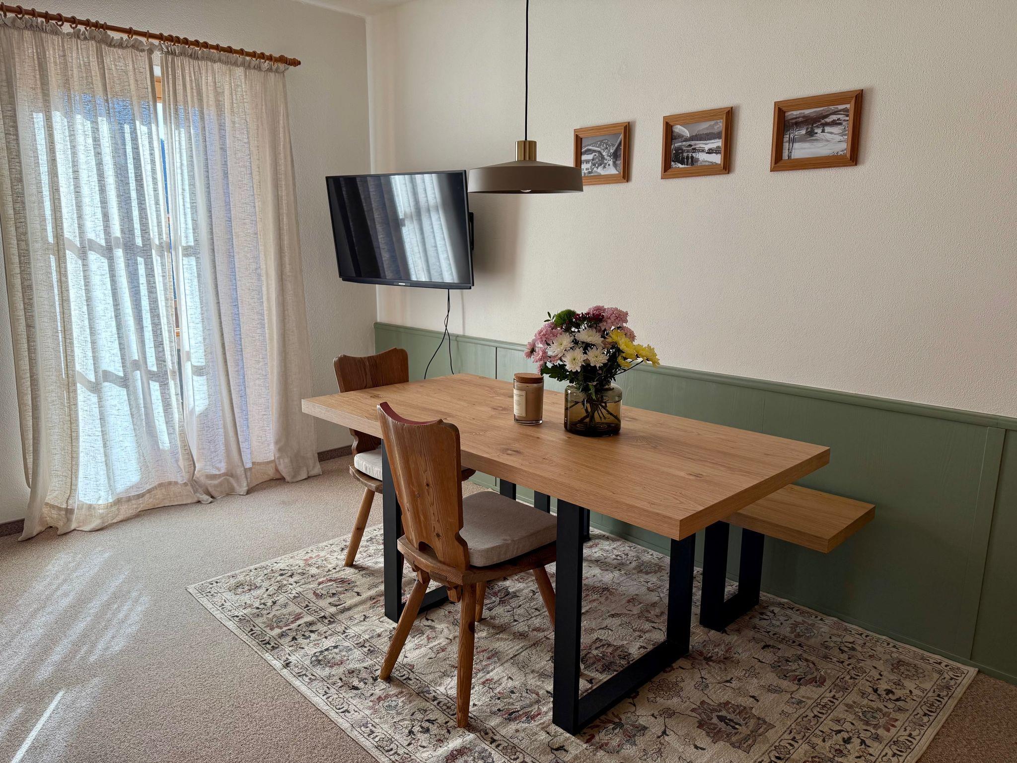 Das Apartment liegt im zweiten Stock, verfügt über einen möblierten Balkon mit Bergblick auf Unterberg, Wilder und Zahmer Kaiser. Es ist ausgelegt für eine Familie mit zwei Kindern oder für vier Personen.