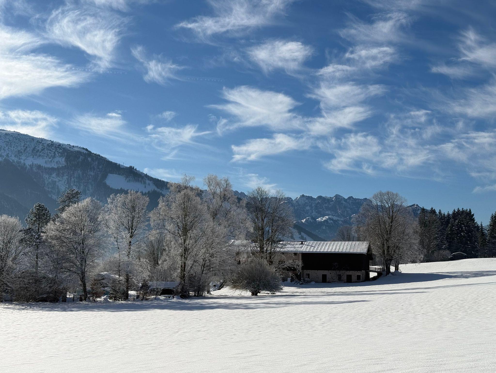 Herrlicher Blick auf die umliegenden verschneiten Berge. Langlaufloipen und gewalzte Winterwanderwege in der Nähe. Täglich kostenloser Bus zur Ortsmitte und in die verschiedenen Ortsteile mit Anschluss zur Winklmoos-Alm.