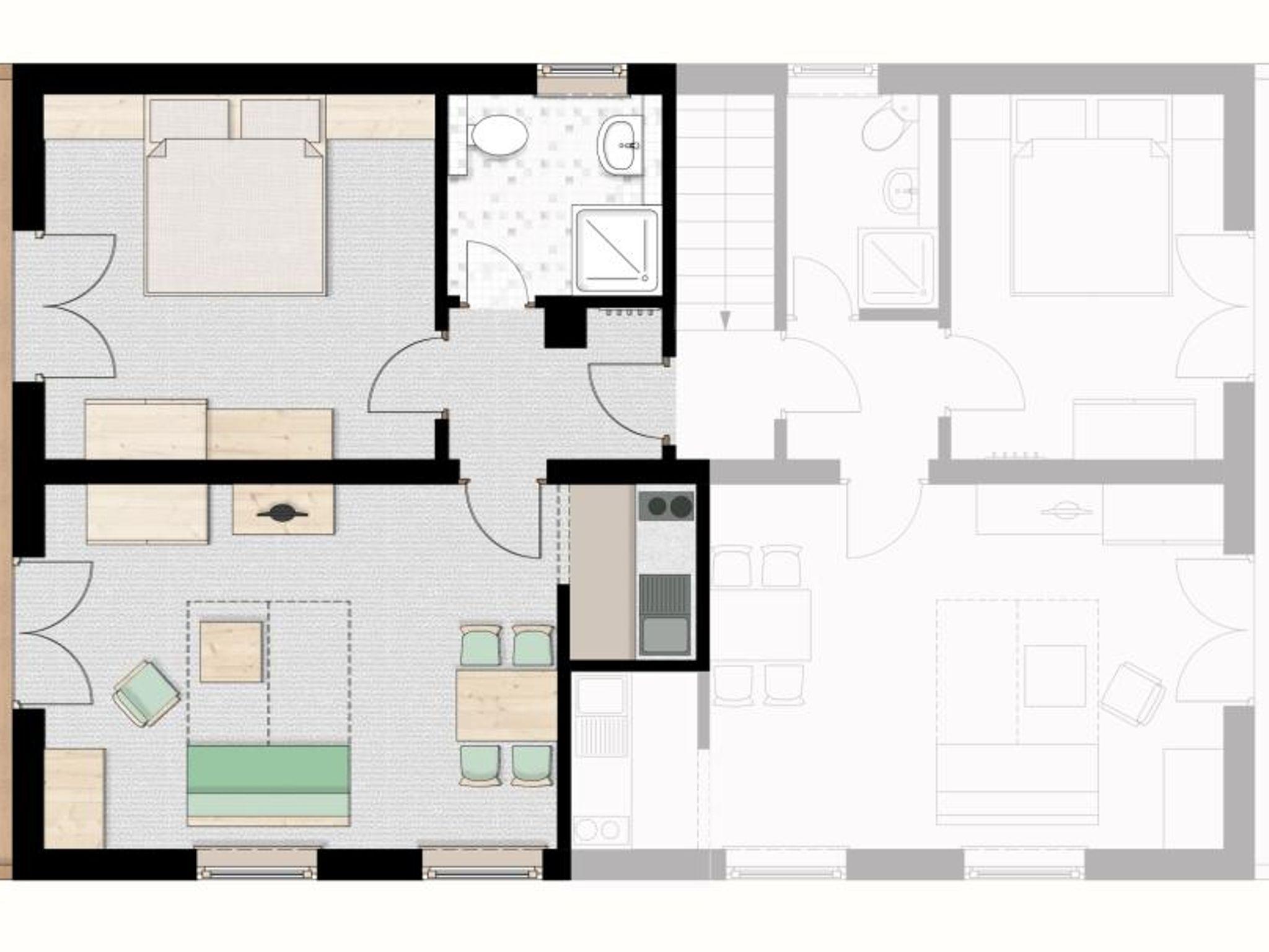 Diese Zwei-Raum Ferienwohnung ist ca. 45 m² groß und hat einen Wohn-/Schlafraum mit kleiner Küche, ein separates Schlafzimmer, ein Bad mit Dusche und einen schönen überdachten Balkon mit Bergblick. Die Wohnung ist komplett ausgestattet und beinhaltet noch einen Fernseher, einen CD-Player und ein Wecker.