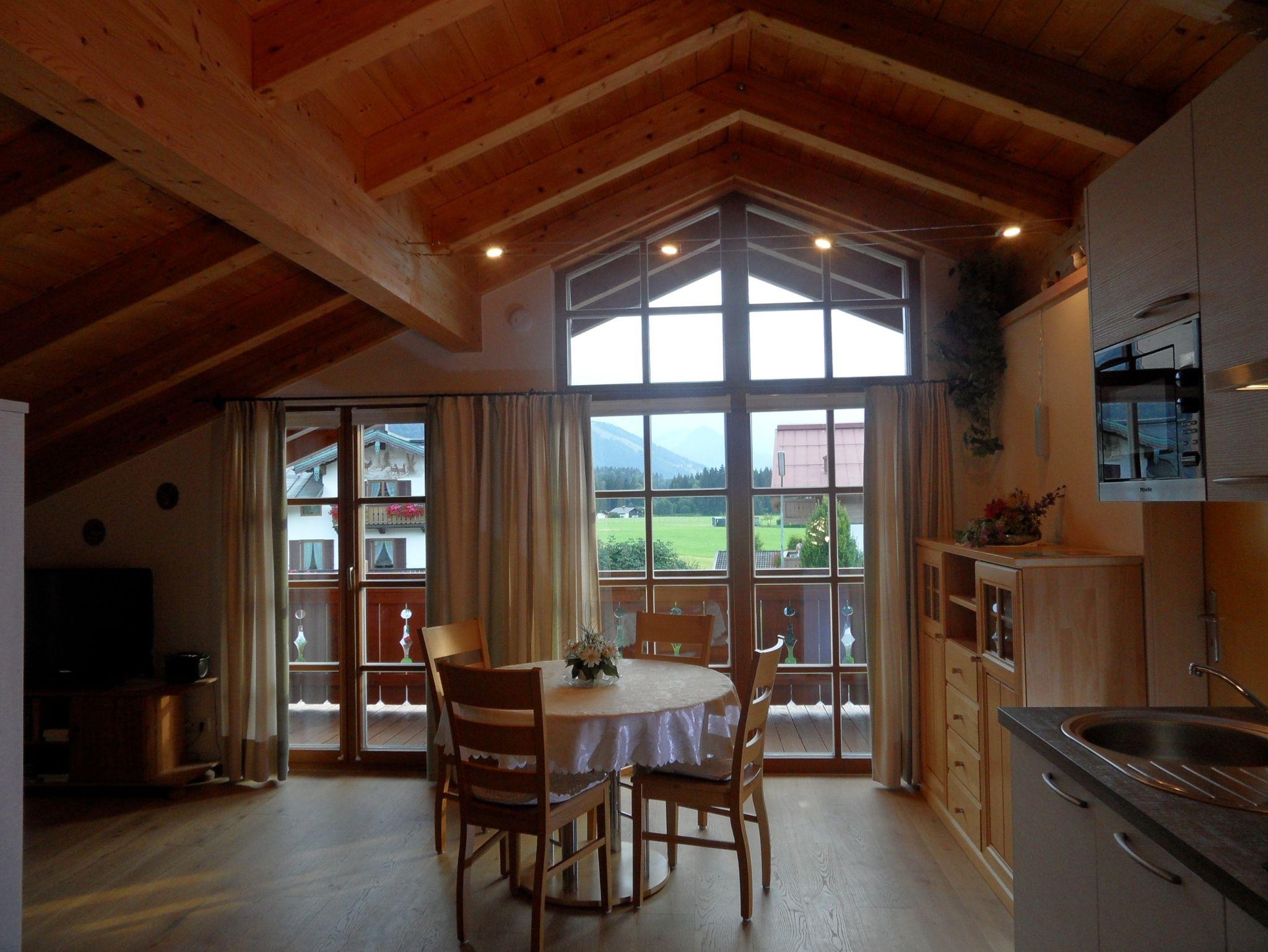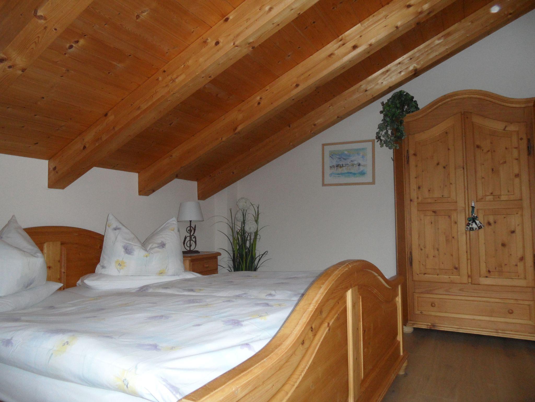 Unsere einzige, großzügig ausgestattete 3 Raum Ferienwohnung mit Westbalkon liegt in sonniger, zentraler Lage. Die ca. 70 qm große Ferienwohnung mit vollverglaster Giebelfront und herrlichem Ausblick auf die umliegenden Berge befindet sich im Dachgeschoss unseres Hauses. Die für max. 4 Personen geeignete Wohnung besteht aus einem Wohnzimmer, zwei separaten Schlafräumen, einem Duschbad mit WC, sowie einem für unsere Gäste nutzbaren Vorraum. Die im Wohnraum eingebaute Küche mit Dunstabzug und gängigen Küchenutensilien wie z.B. Wasserkocher und Kaffeemaschine, ist mit Kühlschrank, Gefrierfach, Mikrowelle, Ceranfeld sowie einem Geschirrspüler ausgestattet. Der Wohnraum verfügt außer dem noch über eine Polstersitzgruppe und einen Essbereich.