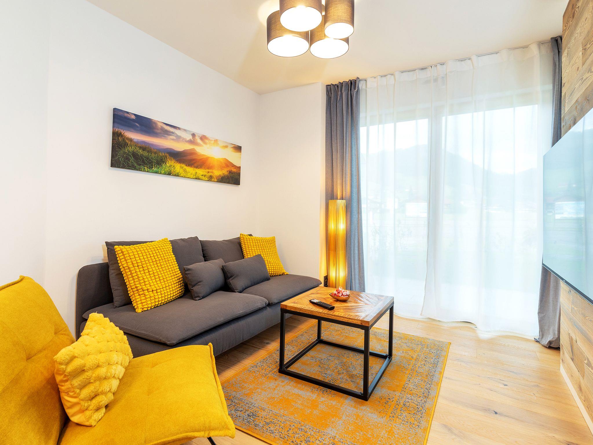 • Gemütliches Wohnzimmer mit Panoramafenster und 57-Zoll-Flachbildfernseher