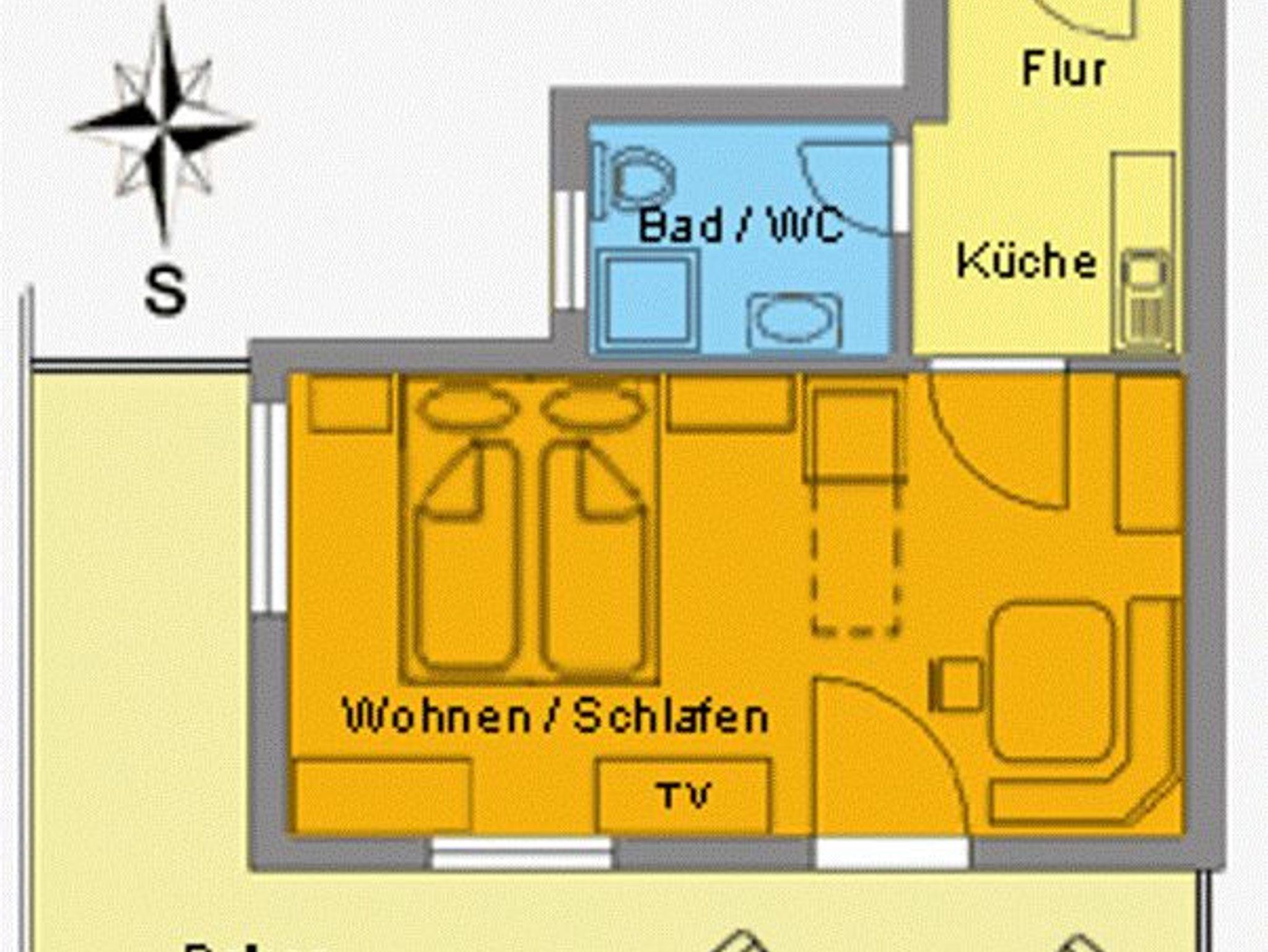 Haus am Schmiedweg, 1-Raum-Wohnung, 35 m², 1-2 Personen, DU/WC, Wohn-Schlafraum, separat Küche, Süd- und West-Balkon