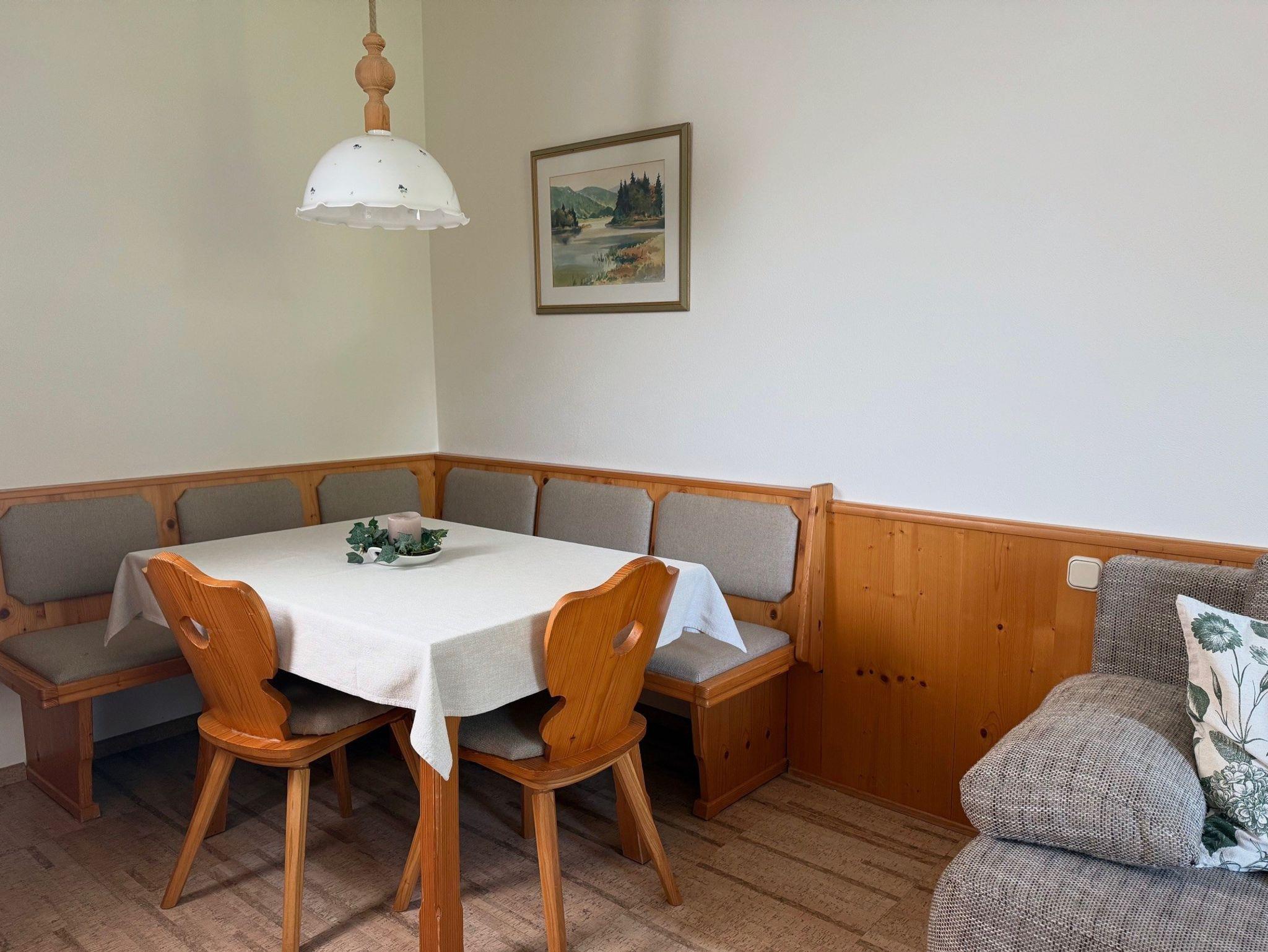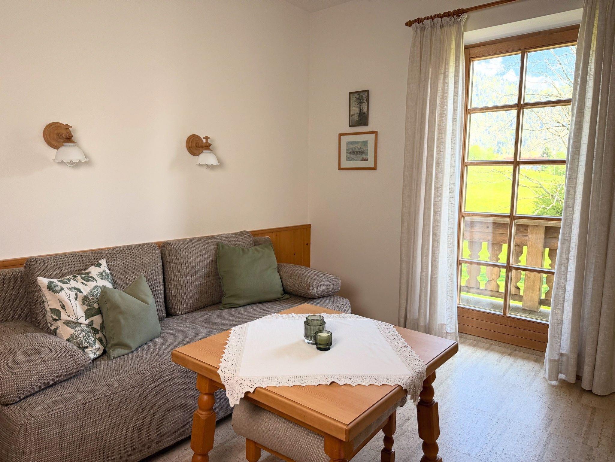 Das Apartment liegt im ersten Stock und verfügt über einen, nach Osten ausgerichteten möblierten Balkon (xx qm) mit Bergblick auf das Wetterkreuz. Es ist für zwei Erwachsene oder eine Familie mit ein/zwei kleinen Kindern ausgelegt.