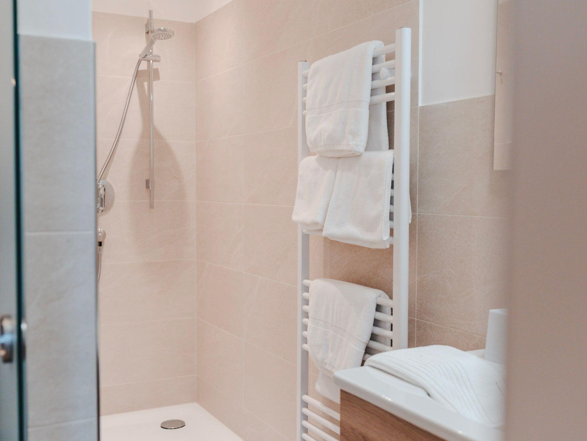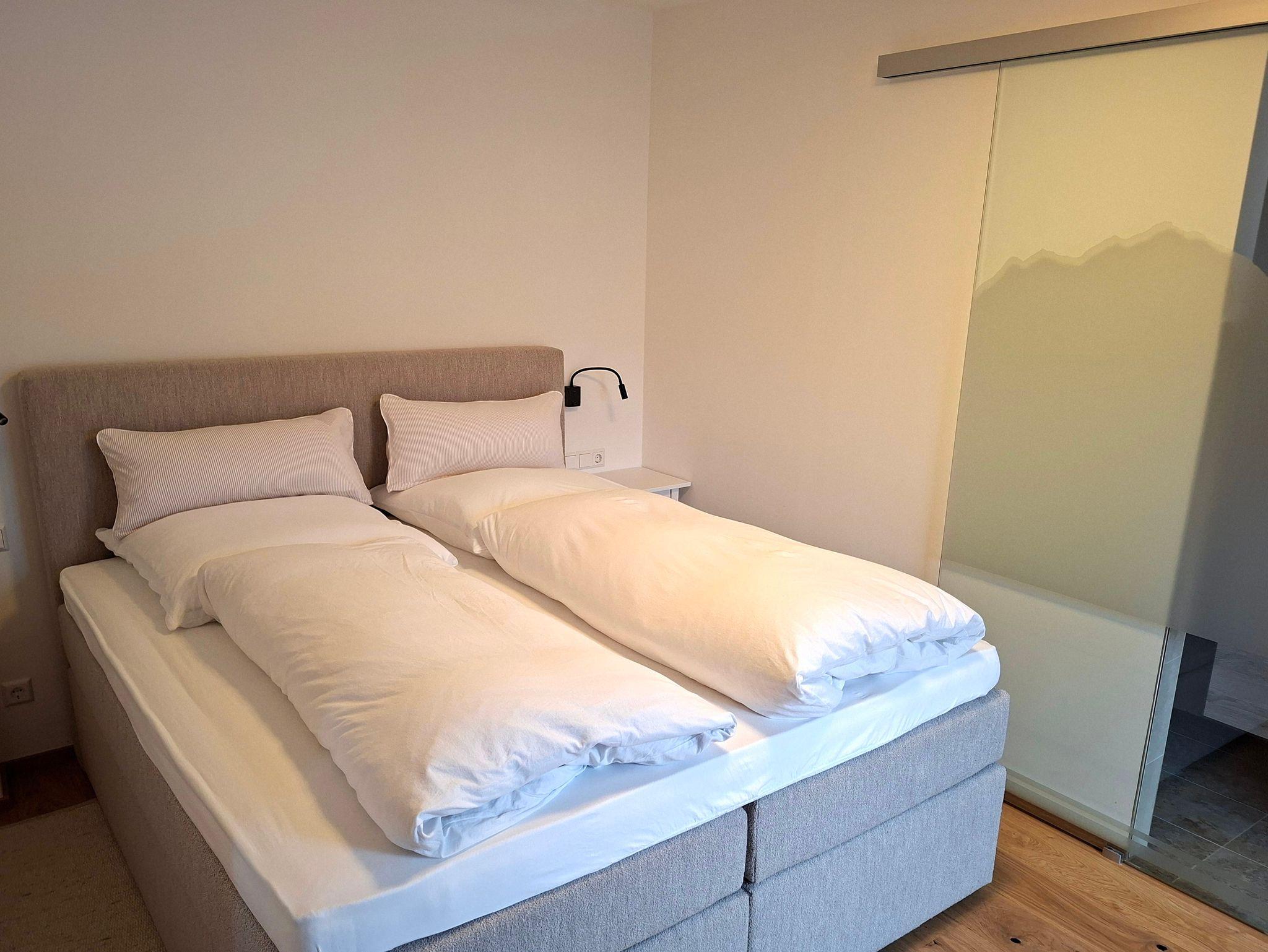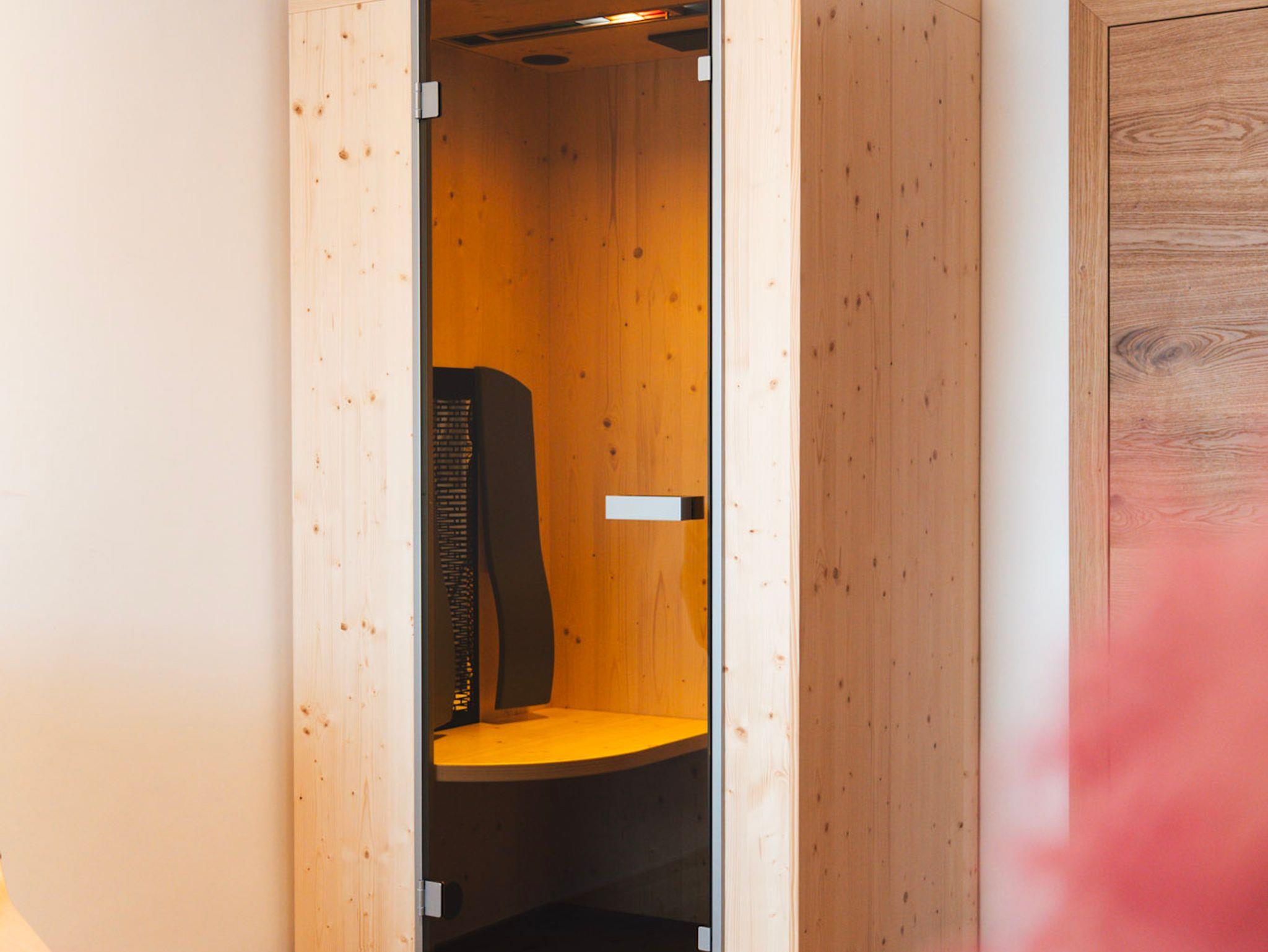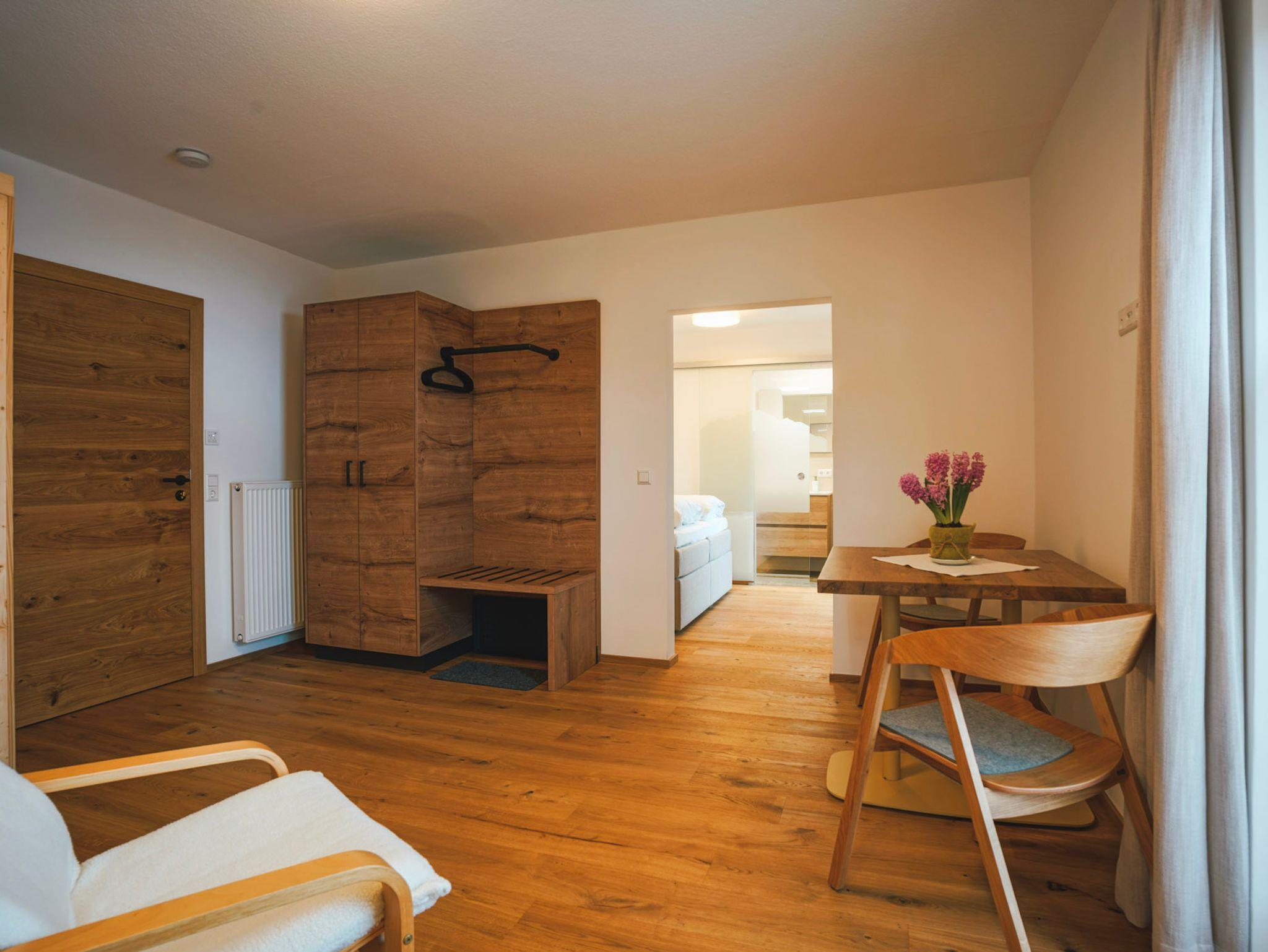 Das Doppelzimmer hat eine Grösse von ca. 35 qm, neben dem Schlafraum befindet sich das Bad (Dusche, Waschbecken und WC) getrennt durch eine Glasschiebetüre mit Sichtschutz. Im Nebenraum befindet sich die Infrarotkabine, Sitzmöglichkeit sowie ein kleiner Küchenservicepunkt mit Kühlschrank und Spüle. Das Zimmer liegt an der Südwestseite.