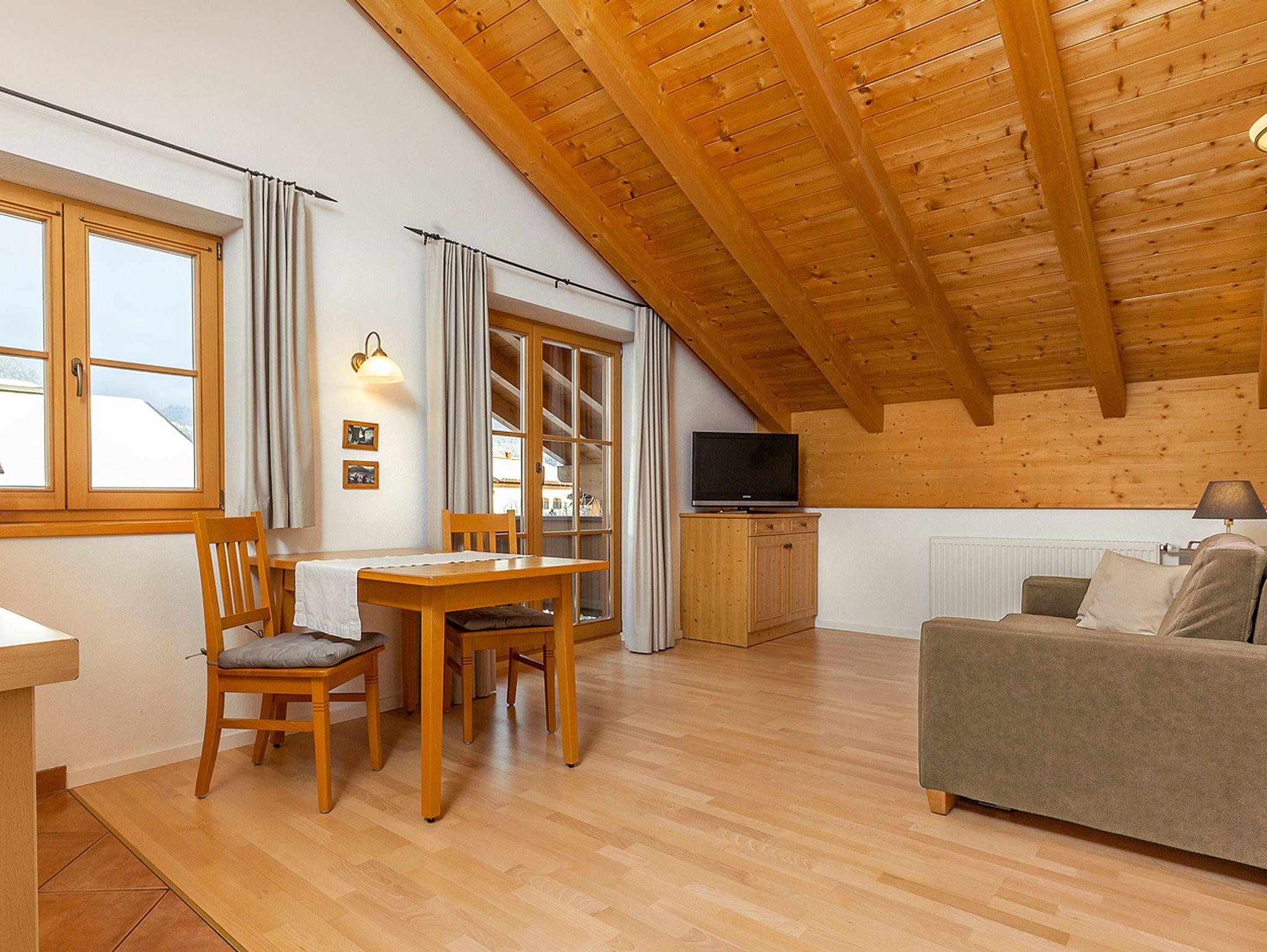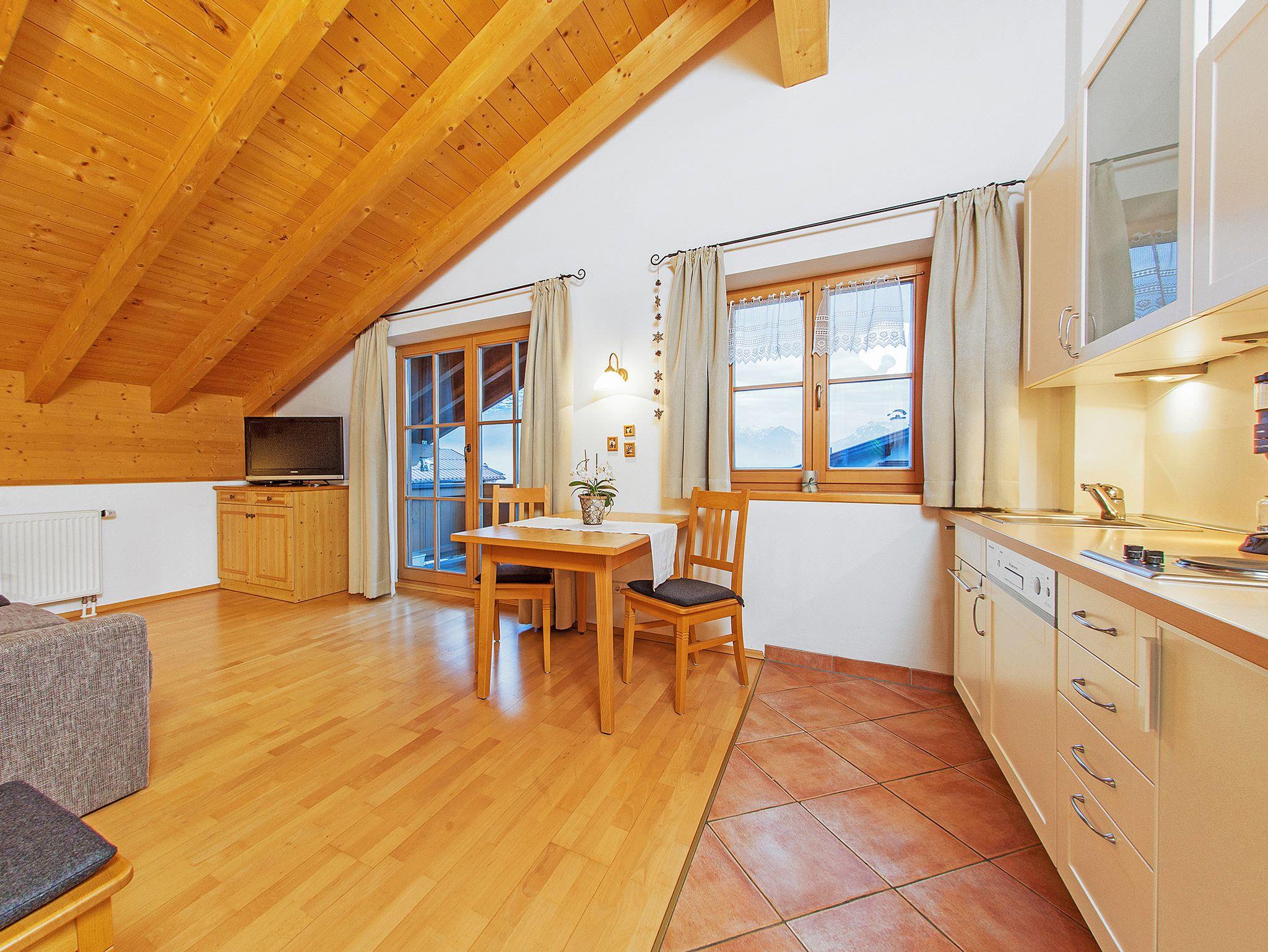 Großzügiges 2-Zimmer-Familien-Appartement im Dachgeschoss, ca. 45 m². Der große Ostbalkon bietet freien Blick ins Dorf und auf den Hausberg. An der gemütlichen Essecke im Wohnraum können Sie die selbst zubereiteten Mahlzeiten genießen. Die Küchenzeile ist mit einem Geschirrspüler sowie einer Mikrowelle ausgestattet. Allergikergerecht wurde in der gesamten Wohnung hochwertiges Echtholz-Parkett verlegt. Im Wohnraum lässt sich das Sofa ausklappen und bietet Platz für eine Person. Bettwäsche und Handtücher sind ausreichend vorhanden und werden nach Ihren Wünschen gewechselt. In unseren Badezimmern bekommen Sie keine kalten Füße! Dafür sorgt die ganzjährig beheizte Fußbodenheizung.