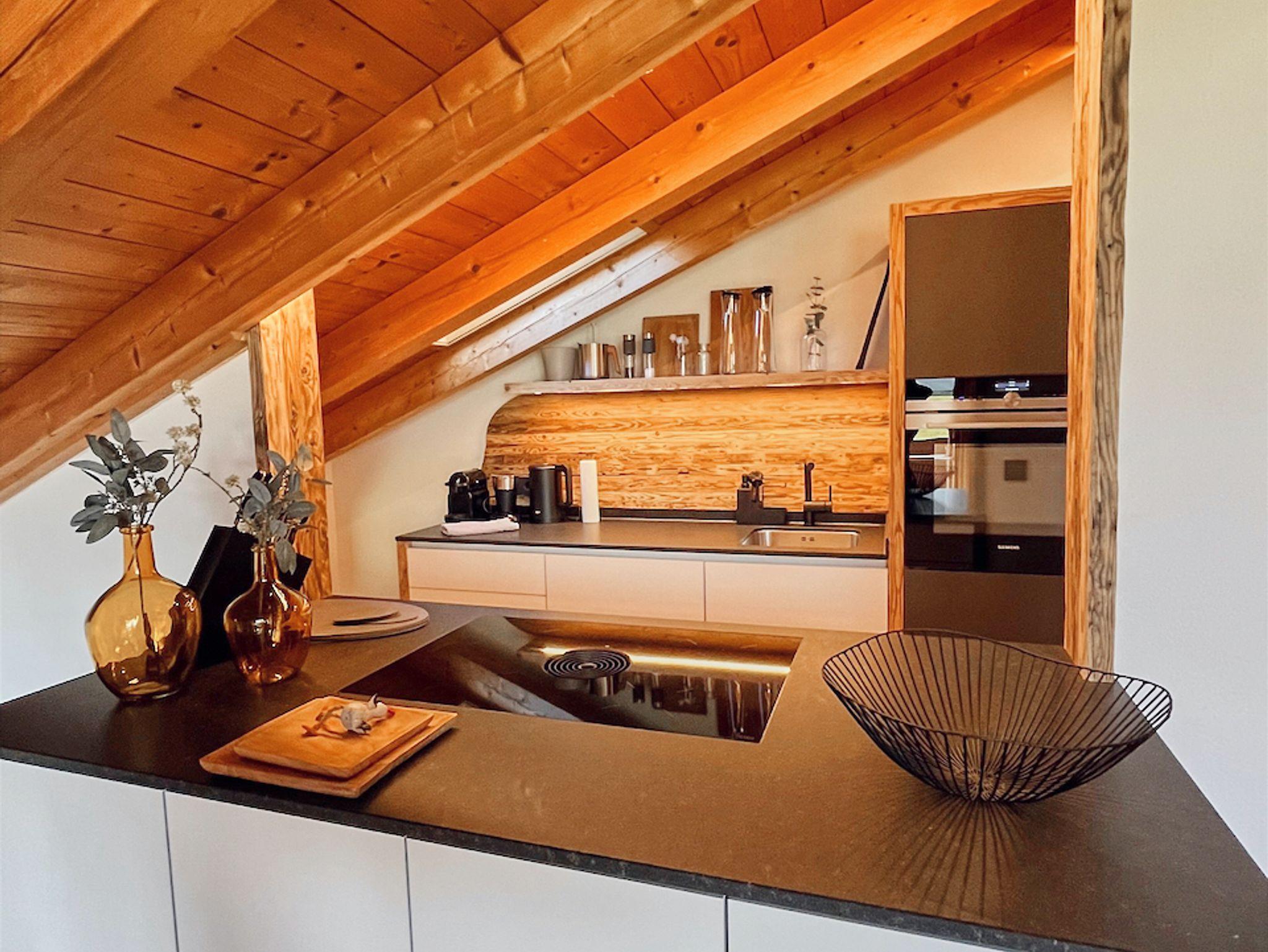 Ihr kocht gerne gemeinsam? Die hochwertig ausgestattete Küche mit einem 4-Platten-Induktionsherd, einem großen Kühlschrank mit Gefrierfach und einer Spülmaschine, lädt gerne dazu ein. Beim Essen sorgen der phänomenale Blick auf den Zahmen Kaiser und ein wohltemperiertes Glas aus dem Weinkühlschrank für einen unvergesslichen Urlaub.