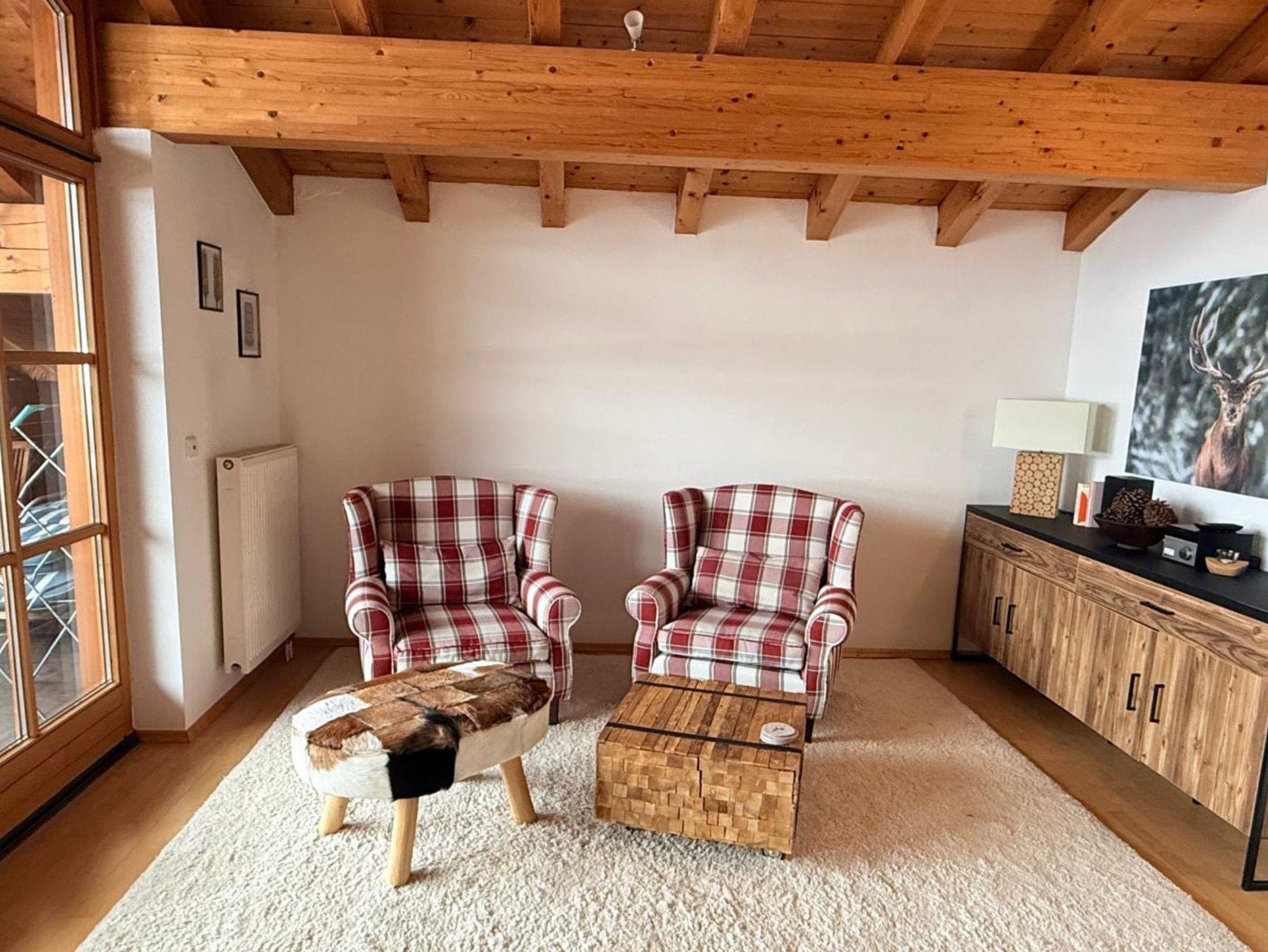 • Wohncharakter: Separates, sonniges Wohnzimmer mit Panorama-Fensterfront und traumhaftem Blick auf die Berge von Reit im Winkl.