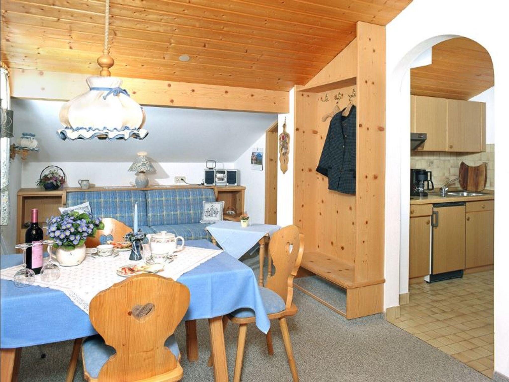 Das Appartement verfügt über einen Wohnraum, eine kleine Küche, einen separaten Schlafraum mit Doppelbett sowie modernem Bad mit Dusche/WC. Die Schlafcouch im Wohnraum bietet zusätzlich Platz für 2 weitere Personen. Die Wohnung ist komplett mit Wäsche und Geschirr ausgestattet und verfügt über 2 Felder- Ceranfeld, Mikrowelle, Toaster, Wasserkocher und Kaffeemaschine. Kabel-TV, Telefon, Stereo- kompaktanlage, Radiowecker, Fön, stehen zu Ihrer Verfügung. Westbalkon mit Bergblick auf den Kaiser.