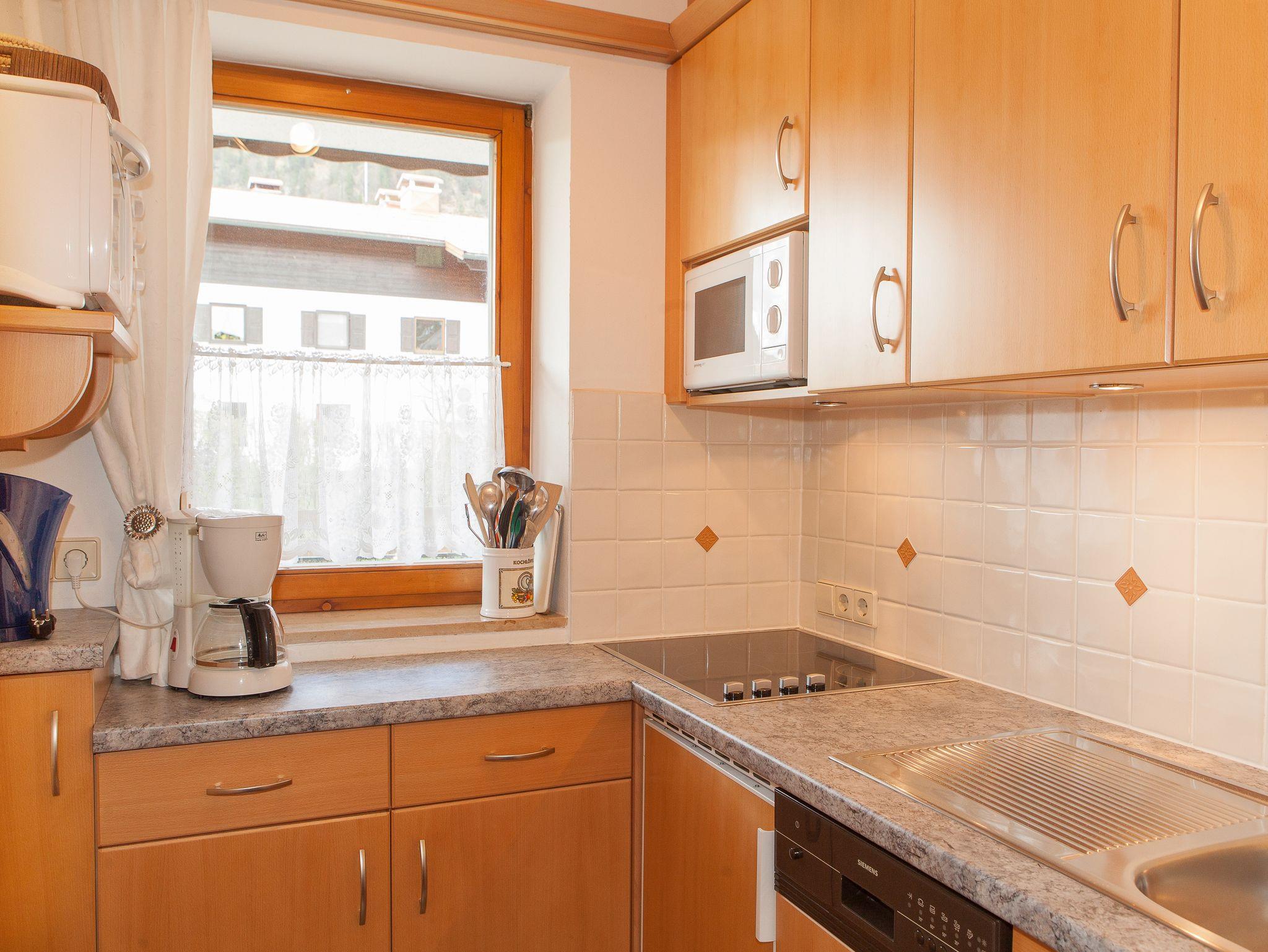 Des Weiteren hat die Wohnung in sämtlichen Räumen Terrakottafliesen-Fußboden mit regelbarer Fußbodenheizung. Die 30 qm Süd und Südwest Terrasse verfügt über einen so genannten Freisitz und eine Liegewiese mit Blick zum Unterberg und das Kaisergebirge.