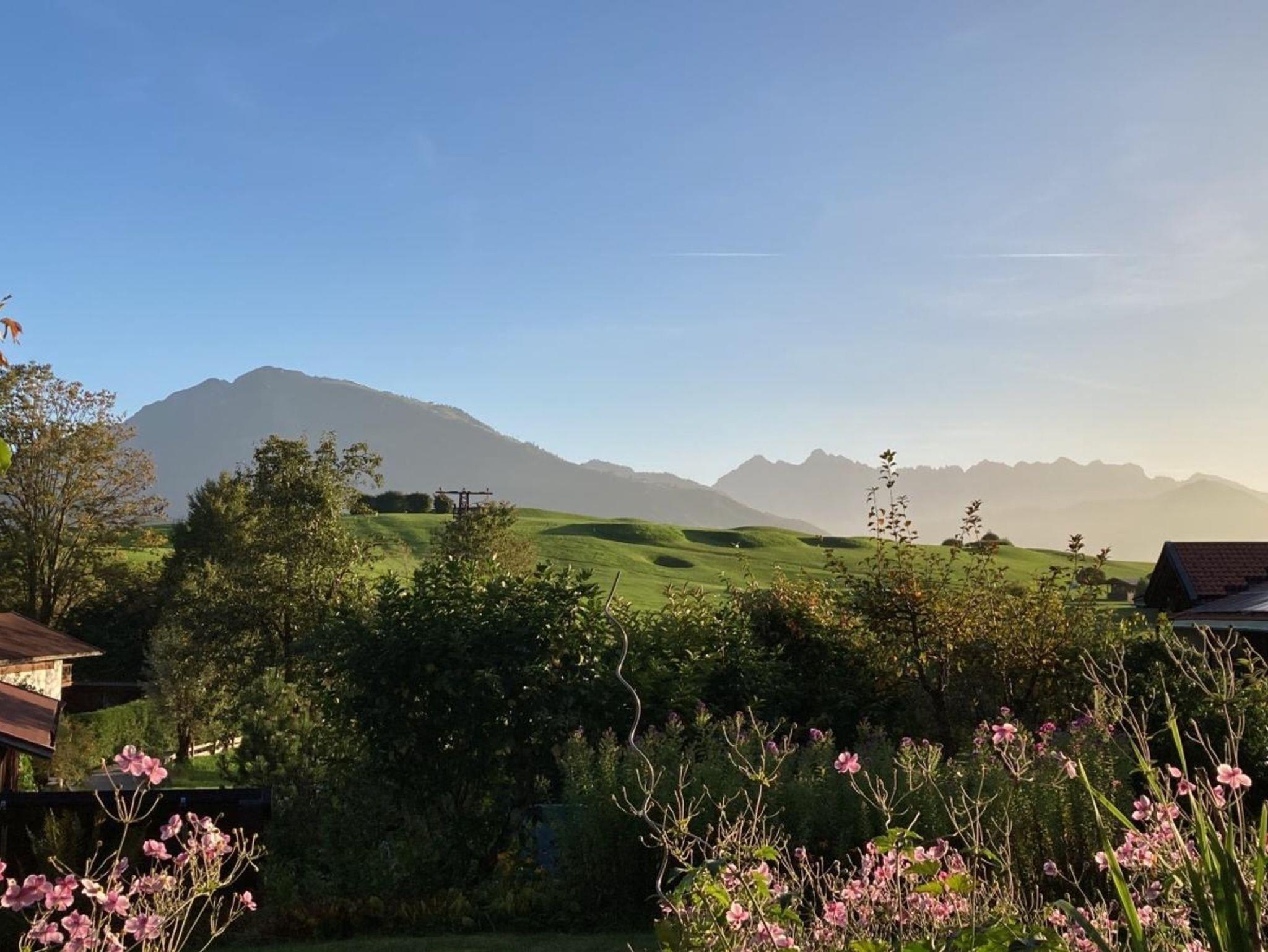 Genießen sie die Ruhe und eine traumhafte Aussicht zum Zahmen und Wilden Kaisergebirge, über den 18-Loch-Golfplatz Reit im Winkl-Kössen und im Winter auf die verschneiten Spazierwege Reit im Winkls. Ein Ausgangspunkt für erholsame Wanderungen.