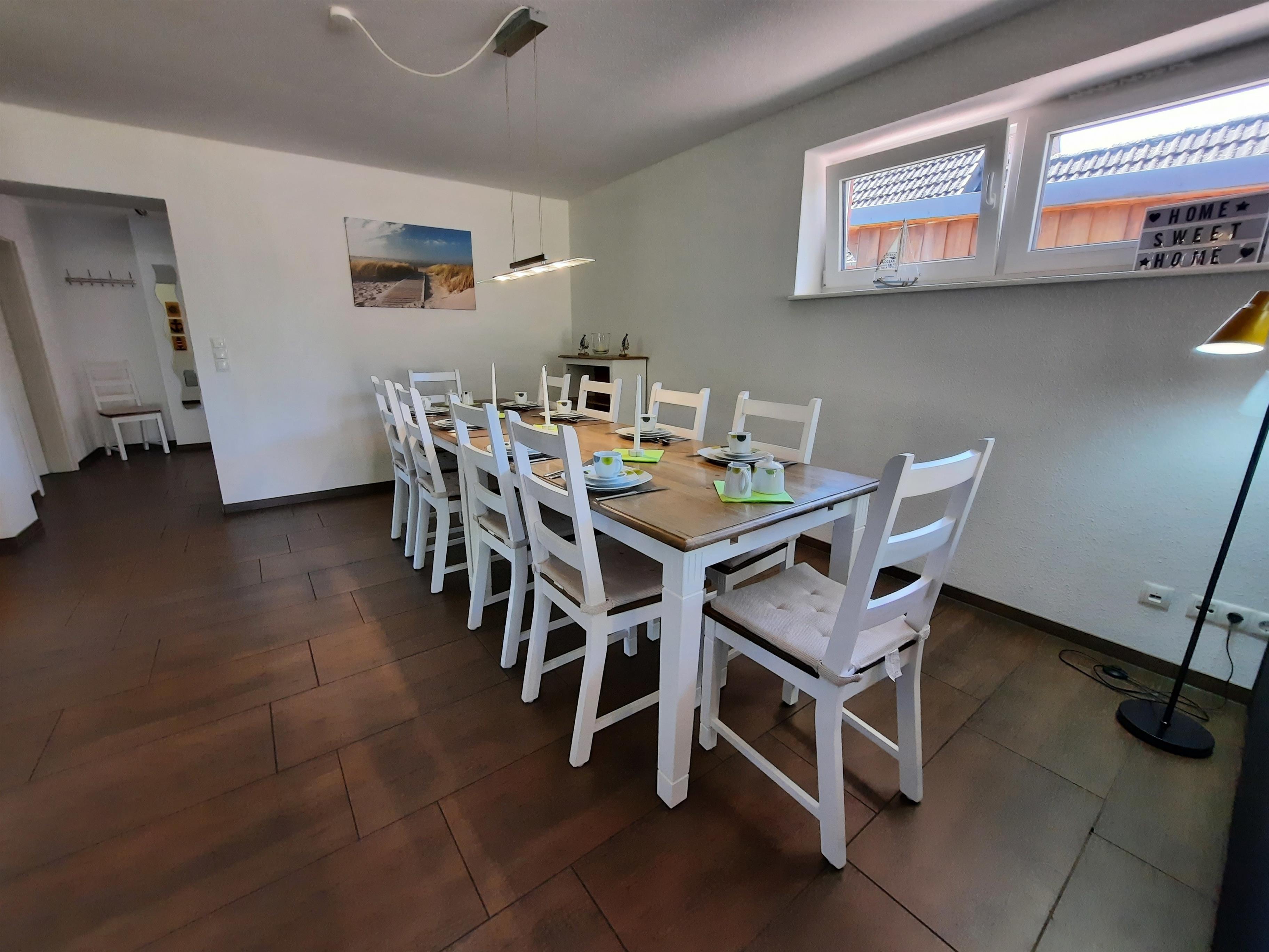 Zur Ausstattung des Hauses gehört eine moderne Einbauküche mit Herd, Backofen, Geschirrspüler, Mikrowelle und zusätzlicher Kühl-Gefrierkombination. Für längere Aufenthalte stehen auch eine Waschmaschine und ein Trockner zur Verfügung. Der offene Ess- und Wohnbereich bietet viel Platz für gemeinsame Mahlzeiten und entspannte Abende. Jedes Schlafzimmer ist mit einem eigenen Fernseher ausgestattet. WLAN steht im gesamten Haus kostenlos zur Verfügung. Ein überdachter Carport bietet Schutz für Autos, Fahrräder oder Motorräder.