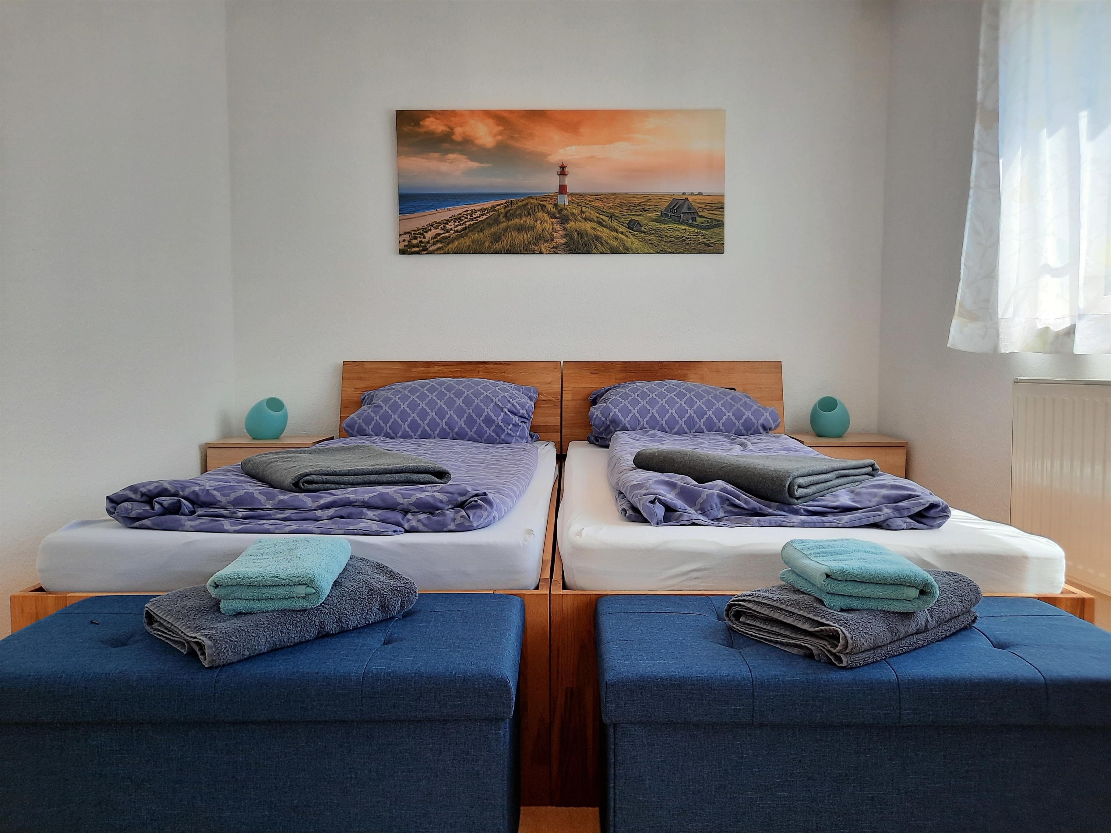 Das Ferienhaus verfügt über vier Schlafzimmer und zwei voll ausgestattete Badezimmer. Im Erdgeschoss befindet sich ein Schlafzimmer für zwei Personen, das wahlweise mit einem Doppelbett oder zwei Einzelbetten eingerichtet werden kann. Ebenso befindet sich im Erdgeschoss ein barrierearmes Duschbad, das auch für Gäste mit eingeschränkter Mobilität geeignet ist. Im Obergeschoss liegen drei weitere Schlafzimmer. Ein Zimmer ist für zwei Personen vorgesehen, zwei weitere Zimmer bieten Platz für jeweils drei Personen. Alle Betten können je nach Wunsch als Einzel- oder Doppelbetten gestellt werden. Die gewünschte Konfiguration kann im Vorfeld mit dem Gastgeber abgestimmt werden.