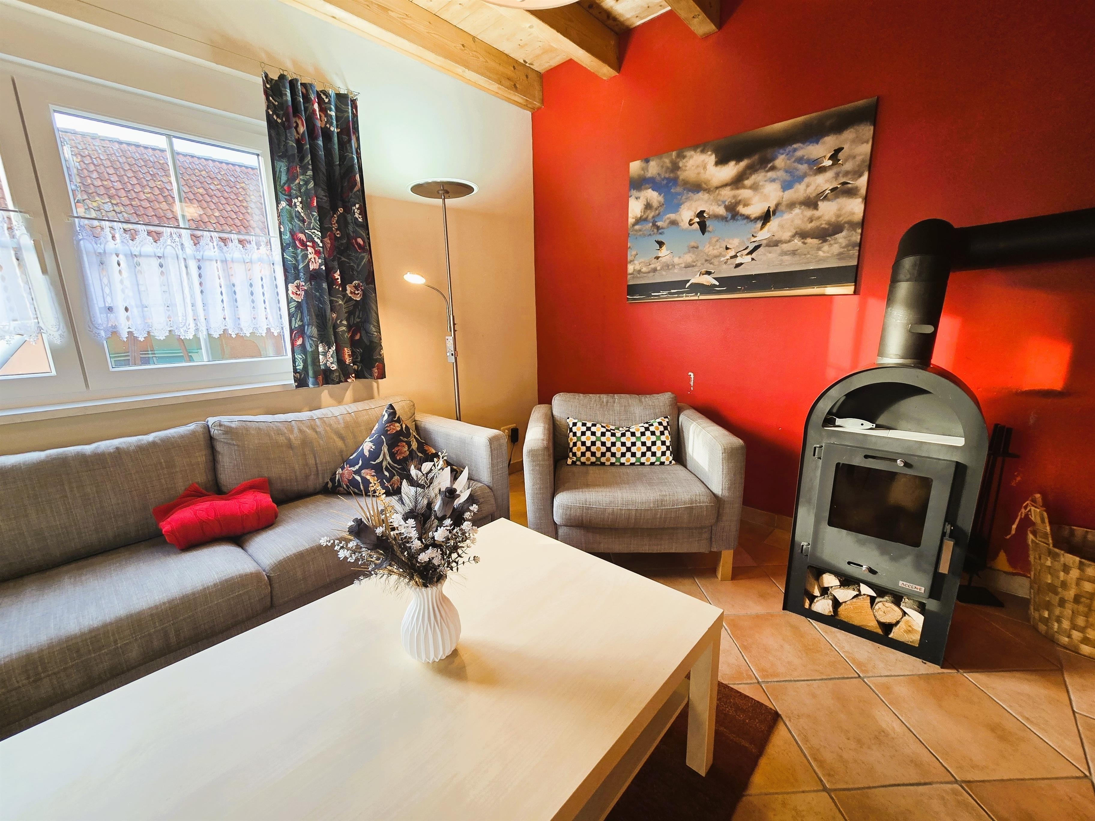 gemütlich eingerichtetes modernes Ferienhaus mit einer großen Couchecke am Kamin.