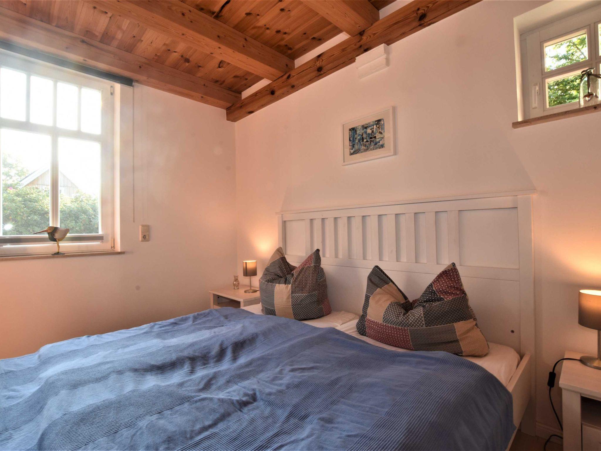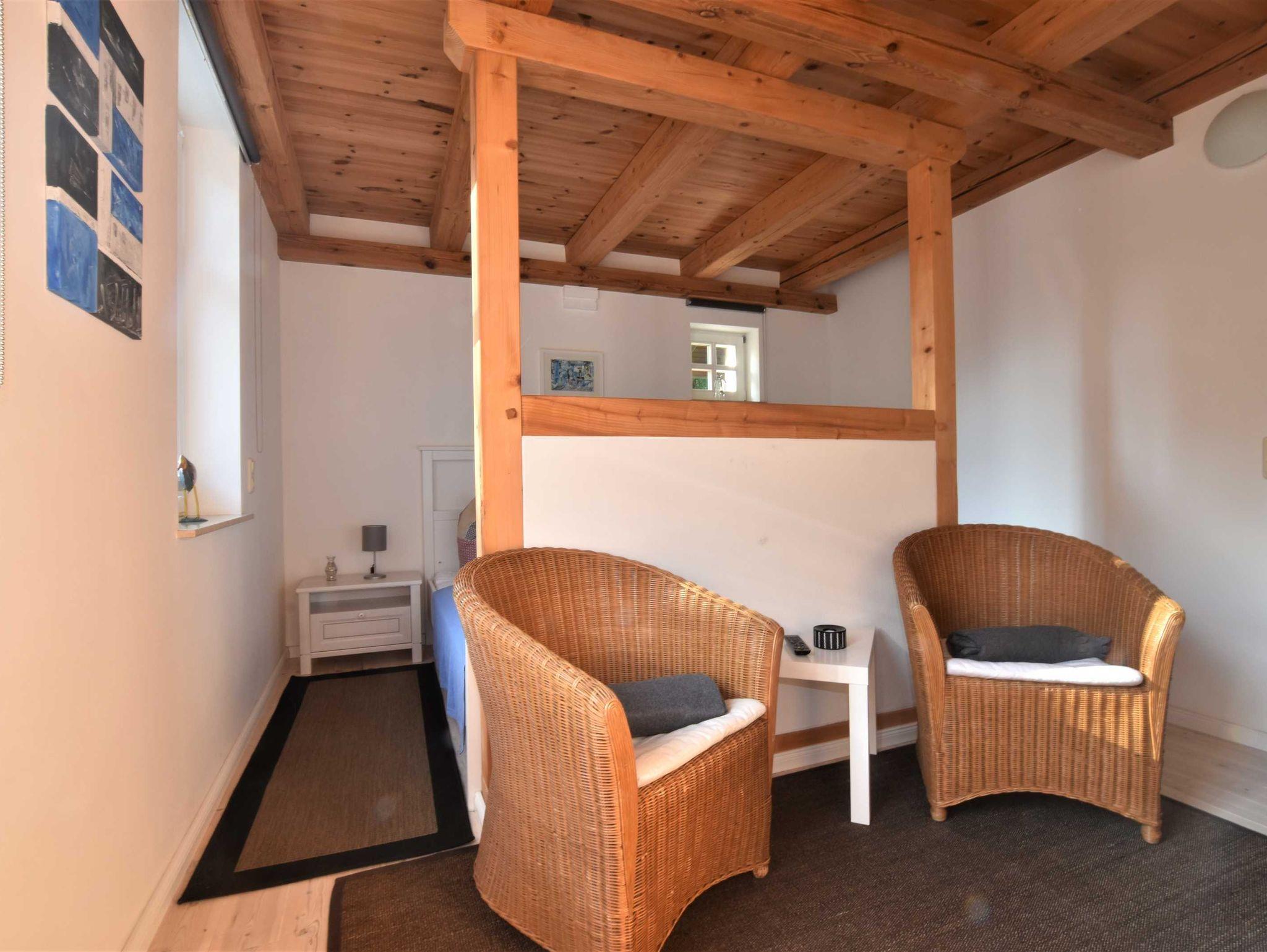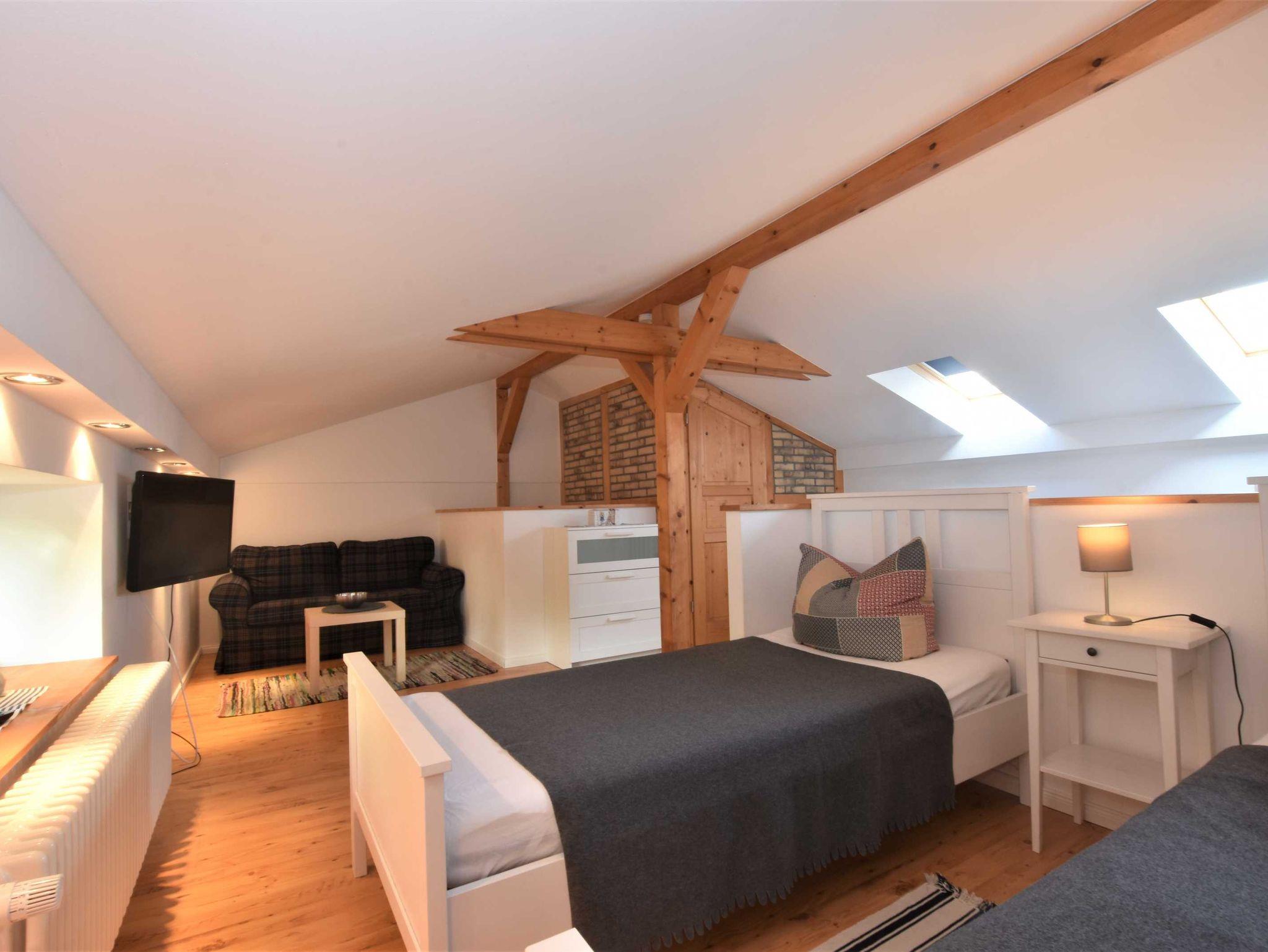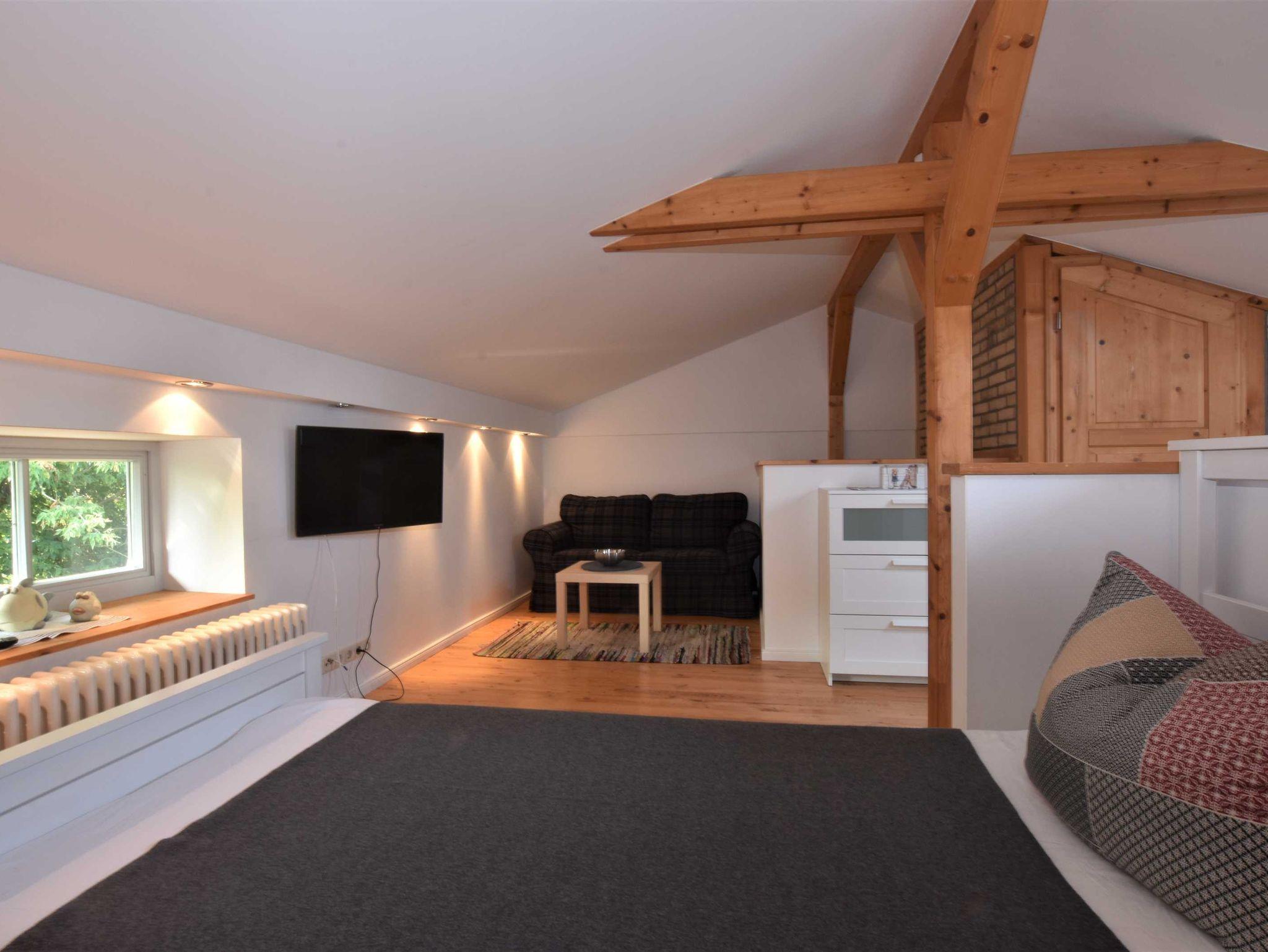 Im Obergeschoss: Die zweite Etage ist über eine stabile große Treppe erreichbar. Schlafzimmer 2 mit 2 Einzelbetten (0,90 x 2m, auch als Doppelbett zusammen stellbar), Kleiderschrank, Couchecke, TV und Gäste-WC.