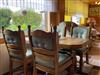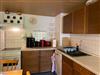Küche mit Kühlschrank mit Gefrierfach, Mikrowelle, Toaster, Herd, Backofen, Kaffeemaschine, Geschirrspüler, Wasserkocher und Essecke.