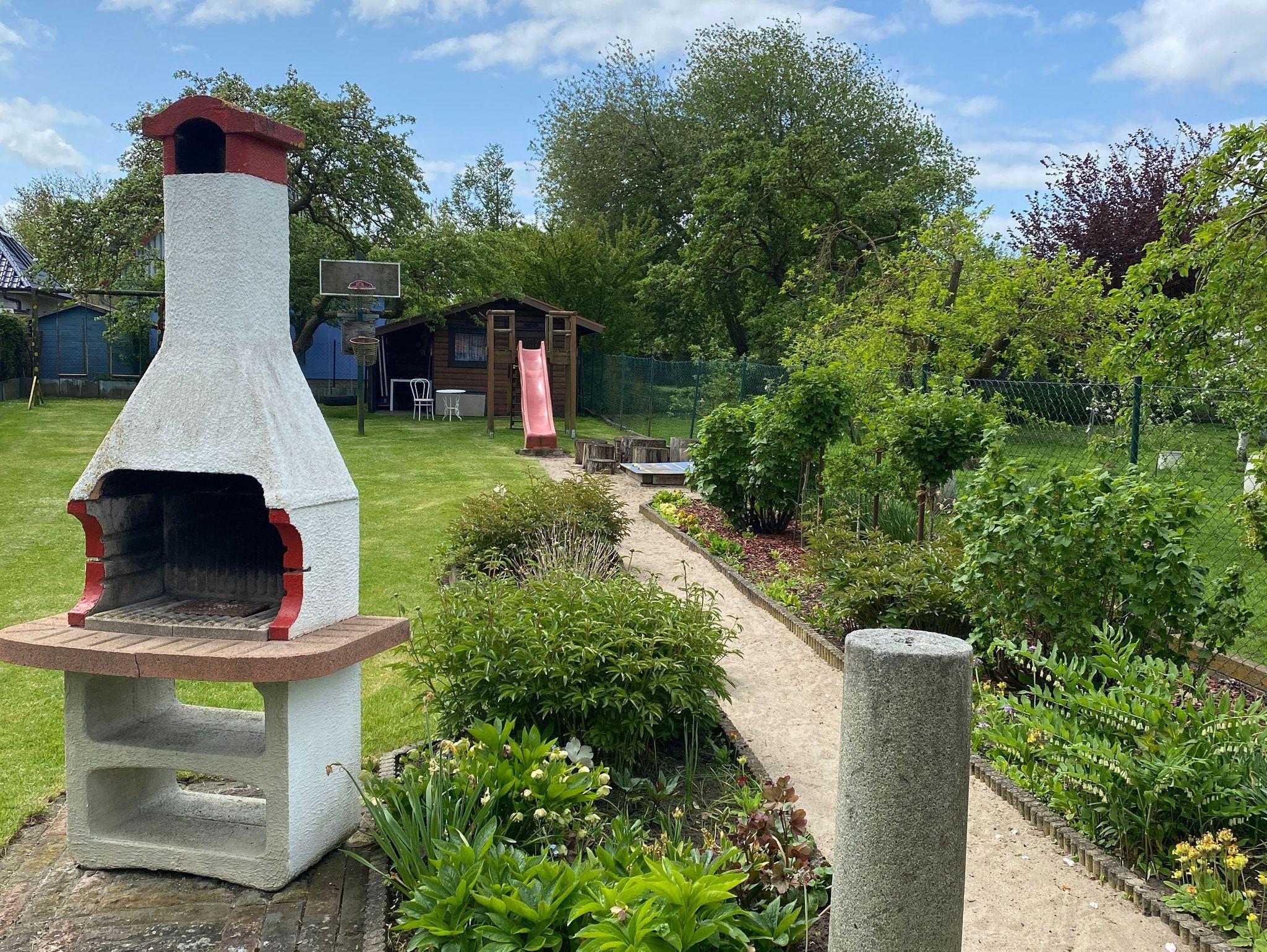 Am Haus: Gepflegter, eingezäunter Garten. Überdachte Terrasse mit Grillkamin, Räucherofen und Gartenmöbel. Kleiner Spielplatz im Garten für Kinder.