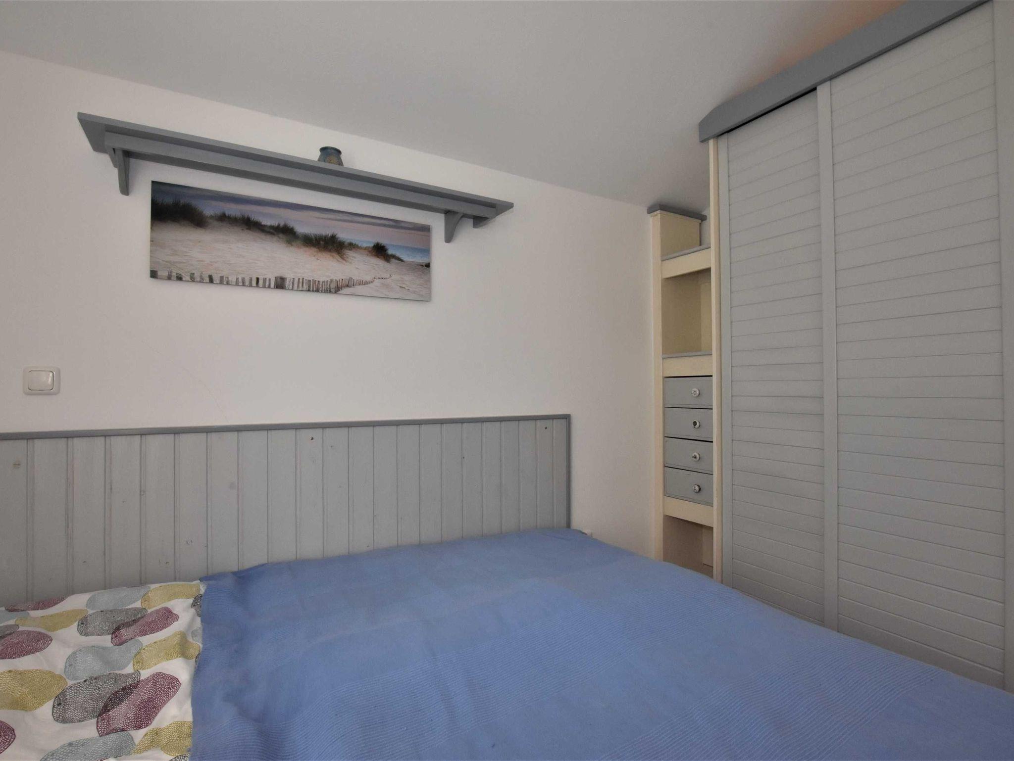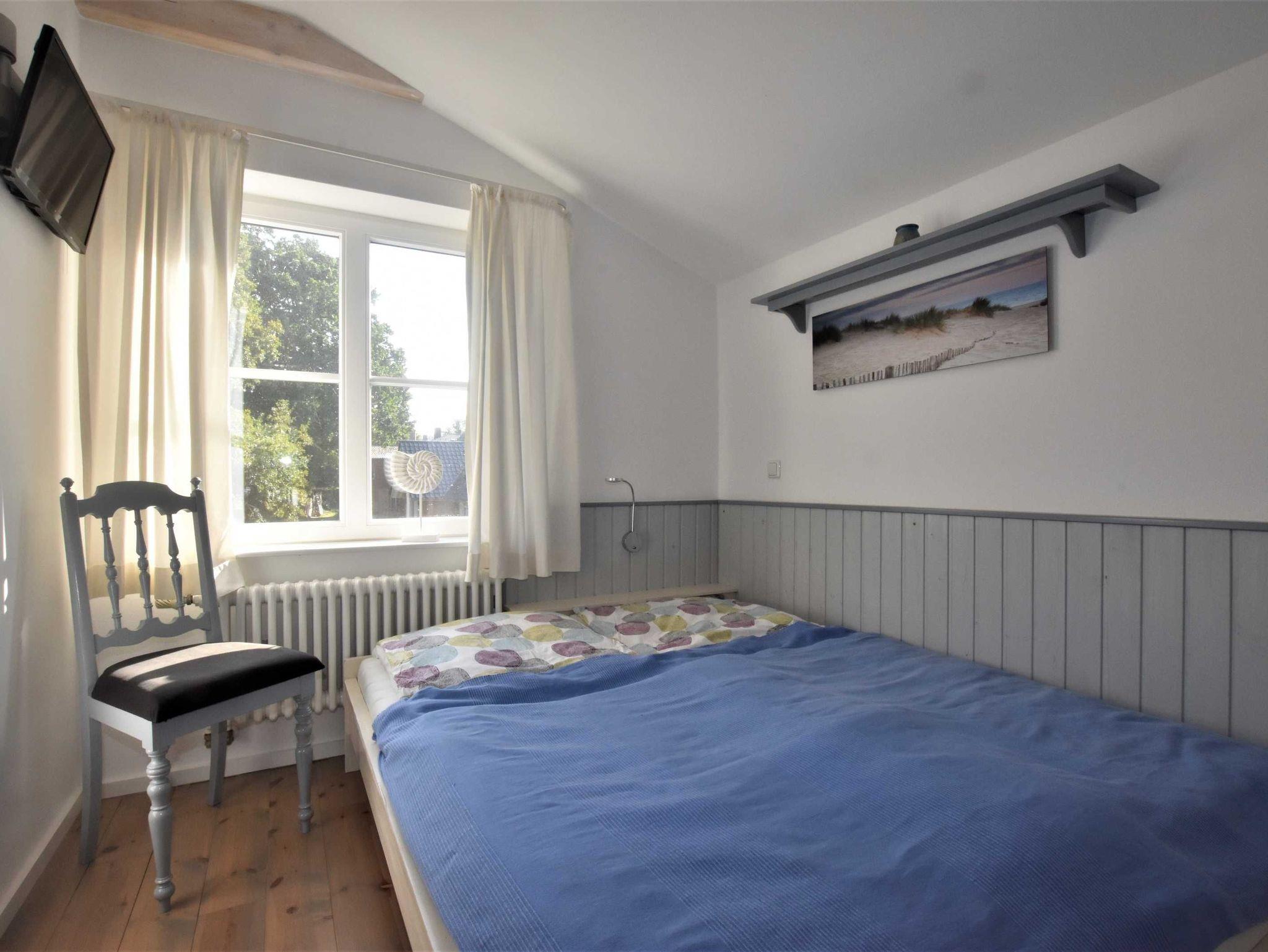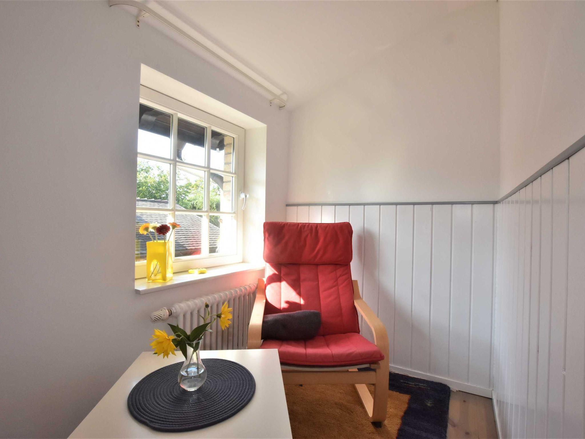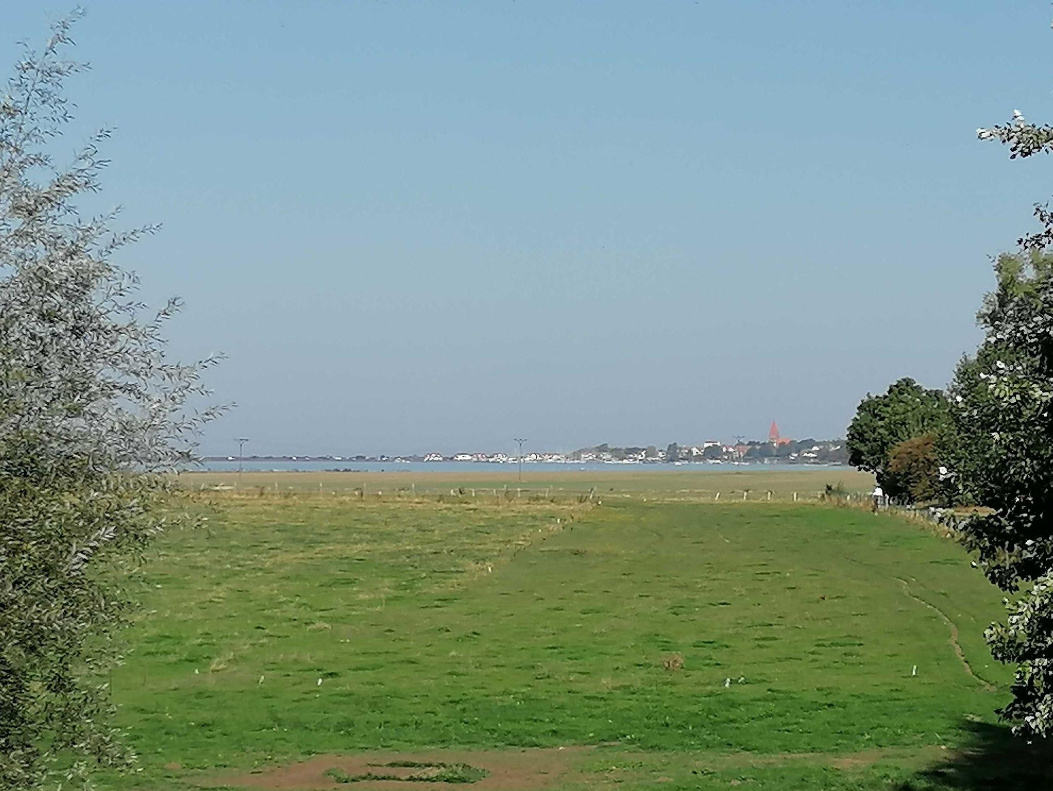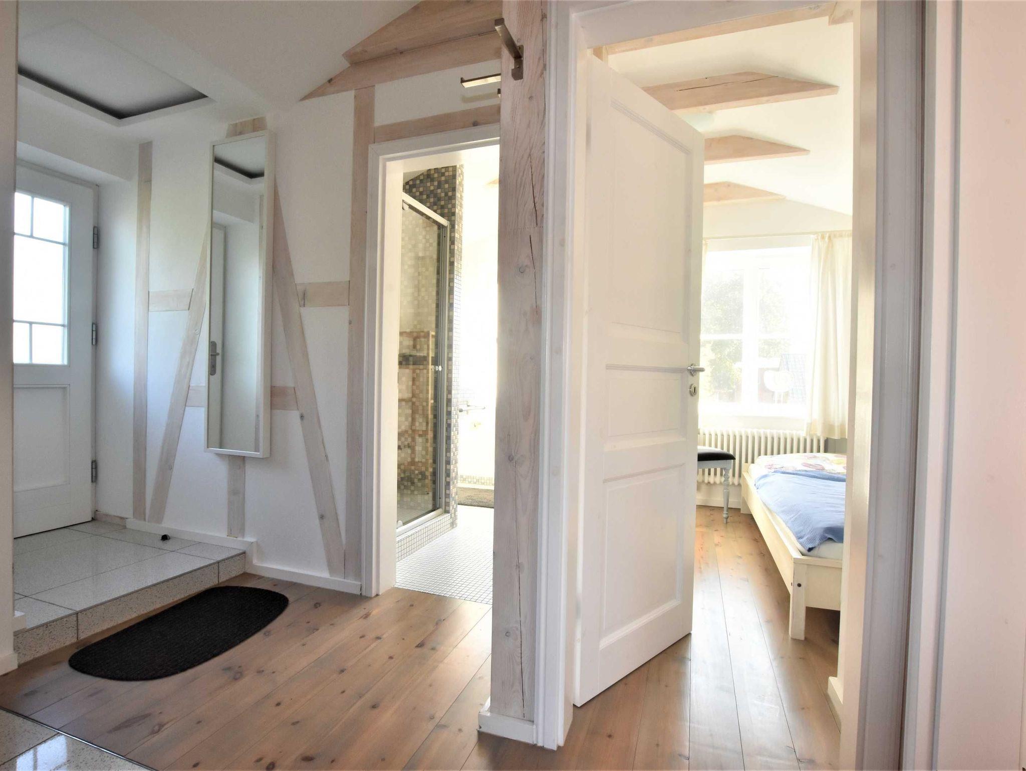 Die Ferienwohnung für zwei Gäste befindet sich im Obergeschoss des Hauses und ist über einen separaten Eingang zu erreichen. Schon am Eingang können die Gäste den Blick auf die Ostseebucht Salzhaff schweifen lassen.