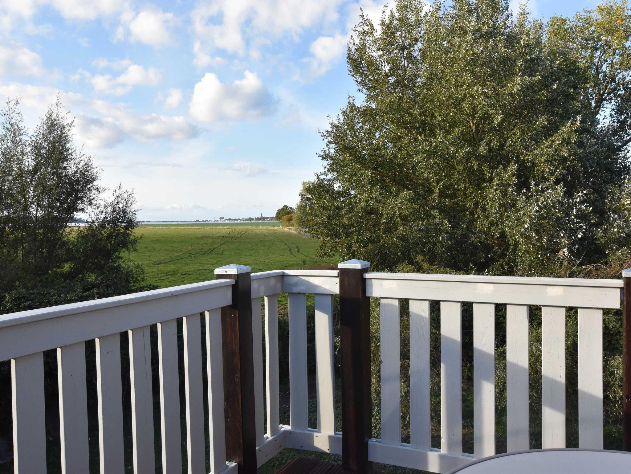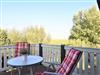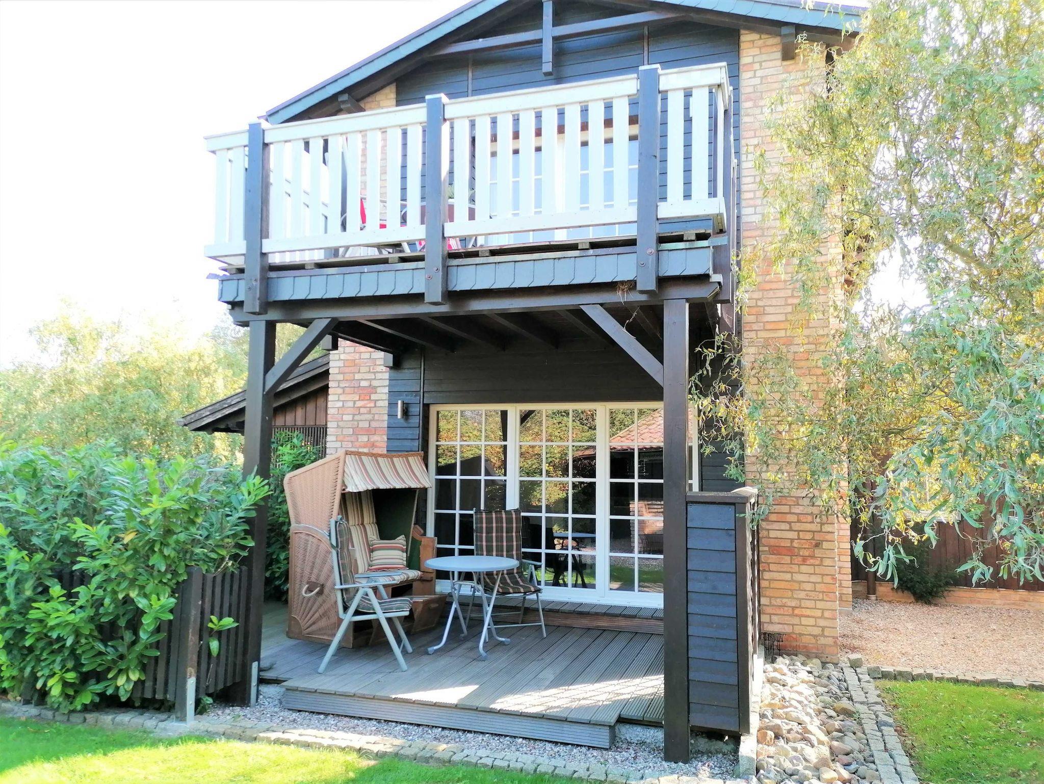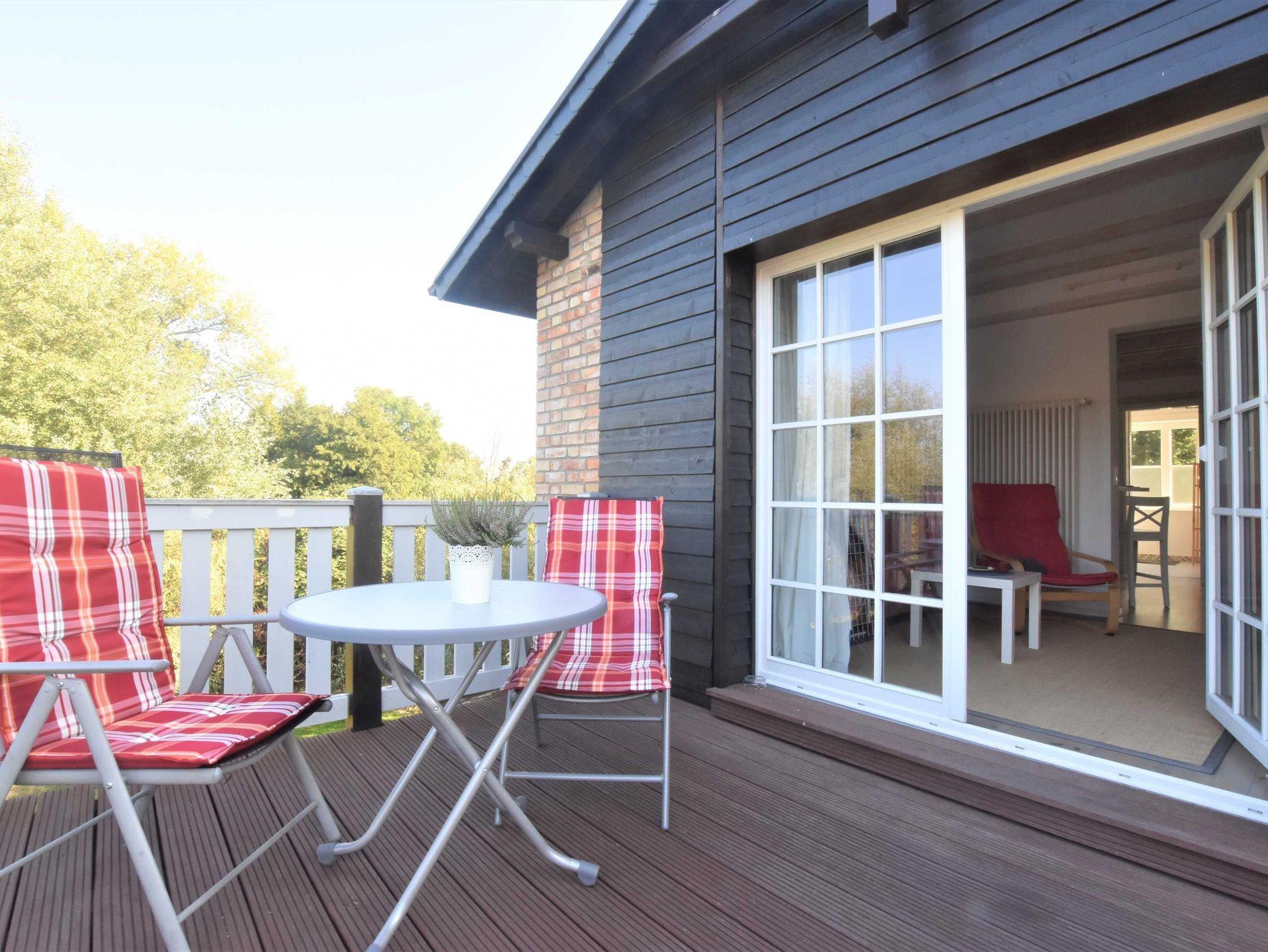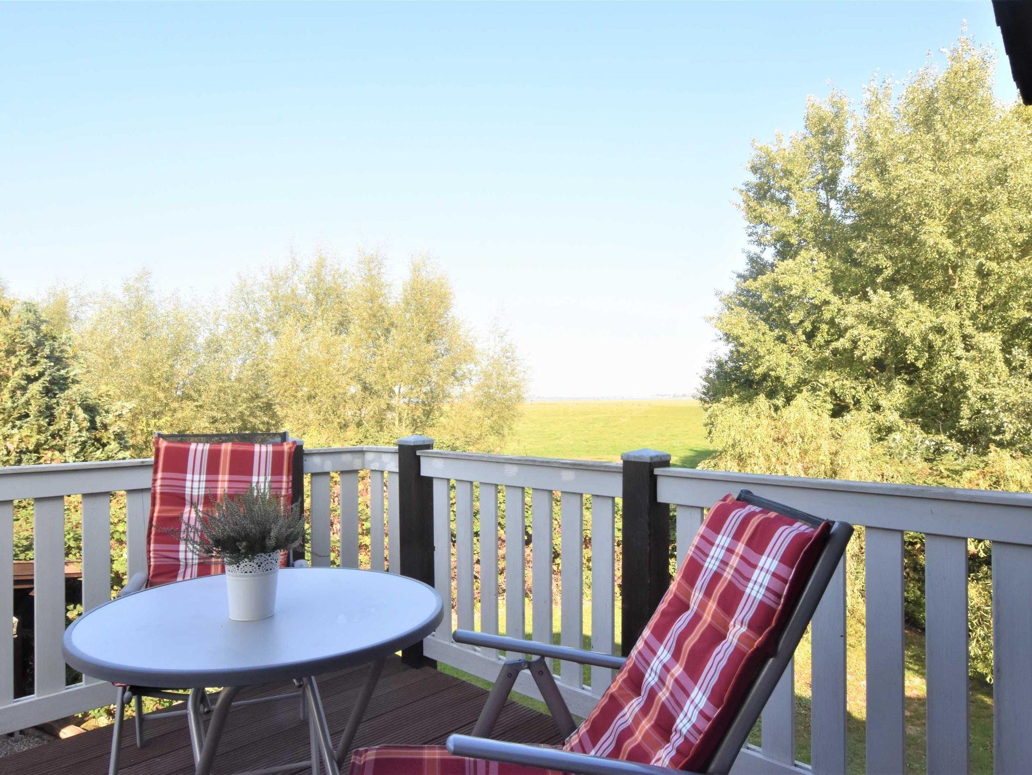 Vom Wohnbereich erreichen die Gäste den großzügigen und überdachten Balkon mit herrlichem Blick auf das Salzhaff und die umliegende Ostseelandschaft. Ein Grill steht zur gemeinsamen Nutzung im Garten bereit.