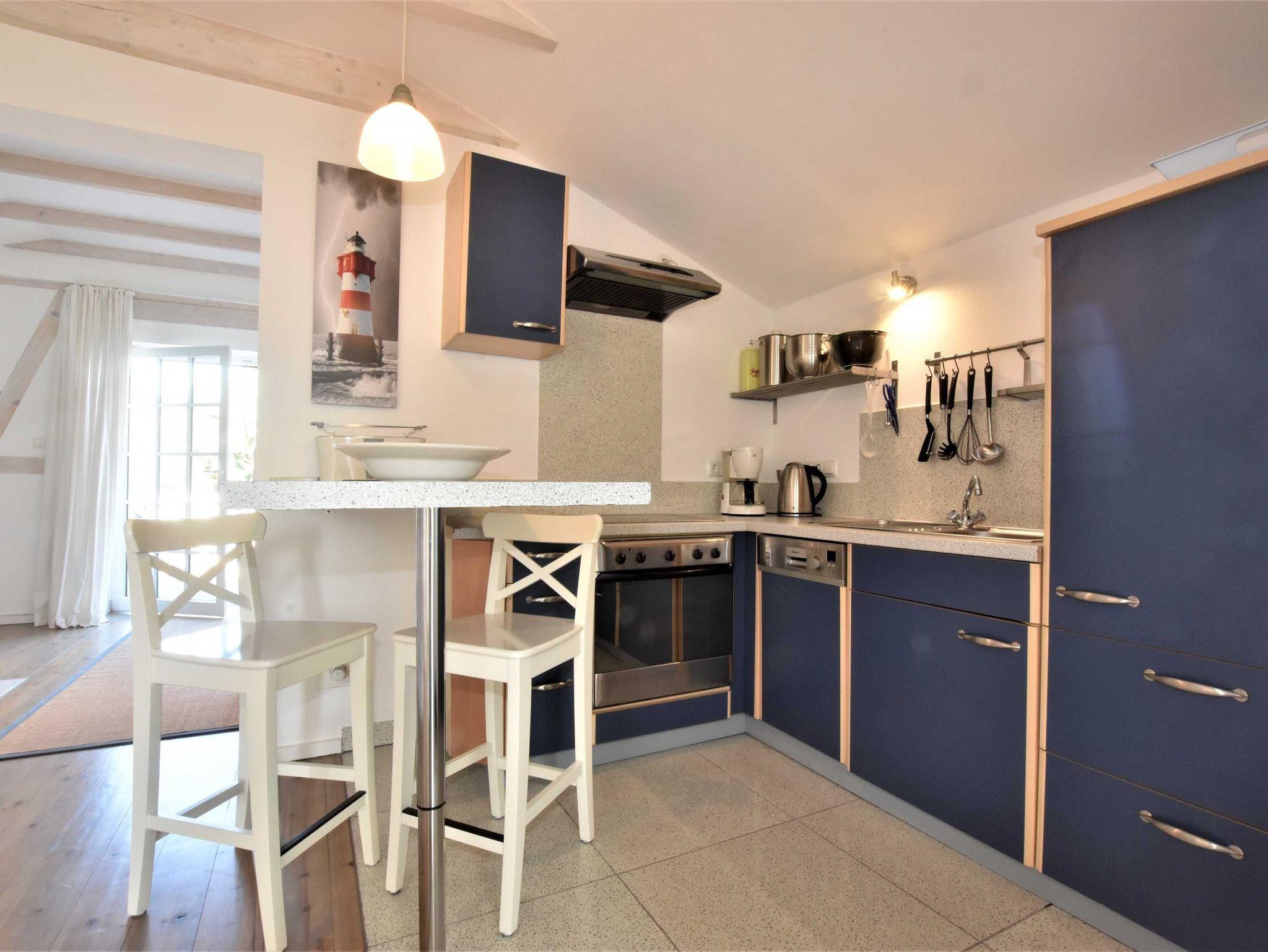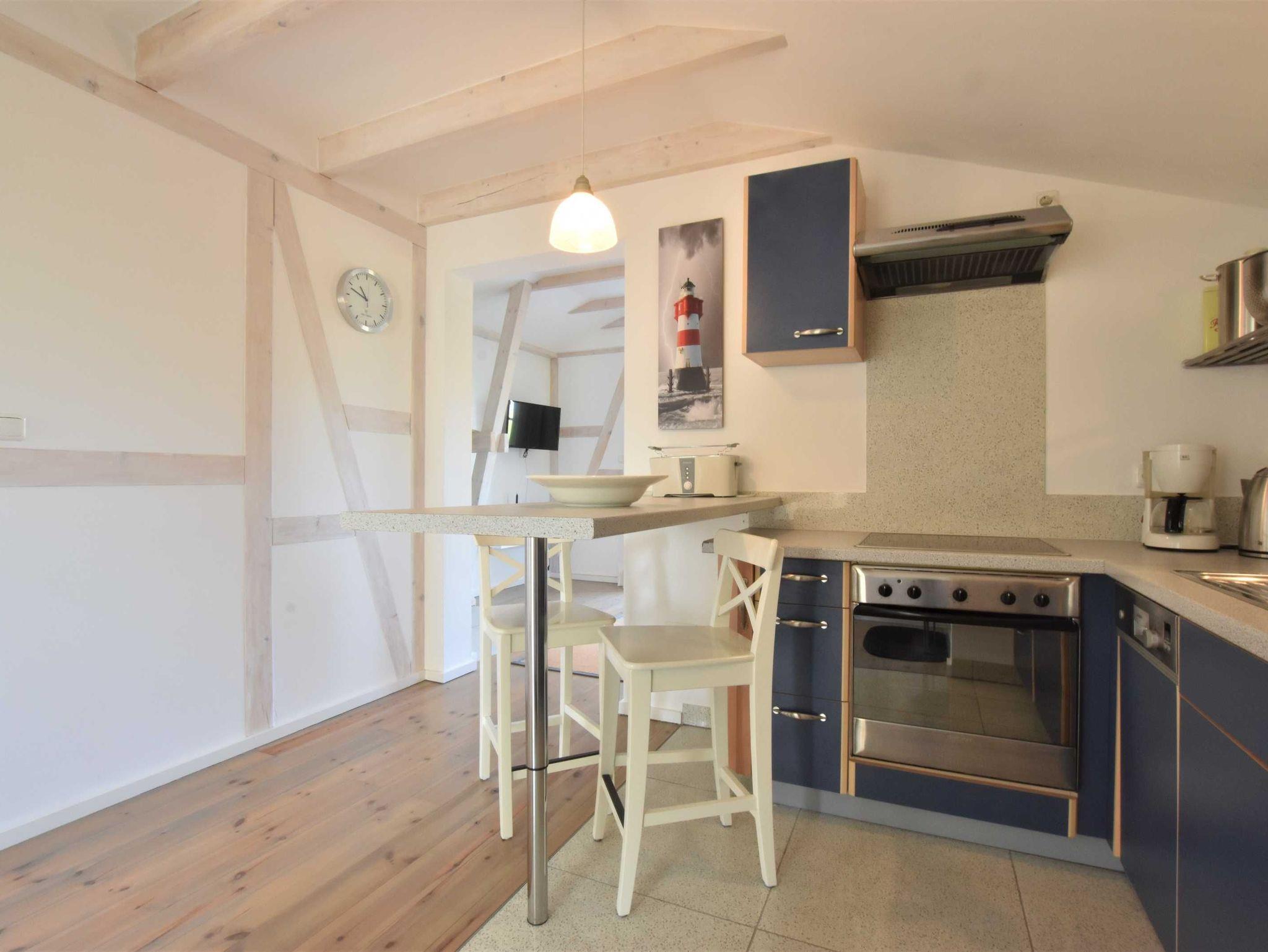 Die Wohnung verfügt über eine umfangreich ausgestattete Küche mit 4- Platten- Herd, Backofen, Kühlschrank, Kaffeemaschine, Toaster und Spülmaschine sowie einen Tresenbereich. Im angeschlossenen gemütlichen Wohn- Essbereich gibt es eine eine Sofaecke mit TV und lauschigem Kamin. Schlafzimmer mit Doppelbett, Kleiderschrank und TV, Bad mit Du/WC. Es steht ein weiteres kleines Lese- und Entspannungszimmer bereit. Hier kann auf Wunsch die Möglichkeit geschaffen werden, dass die max. zwei Gäste getrennt schlafen.