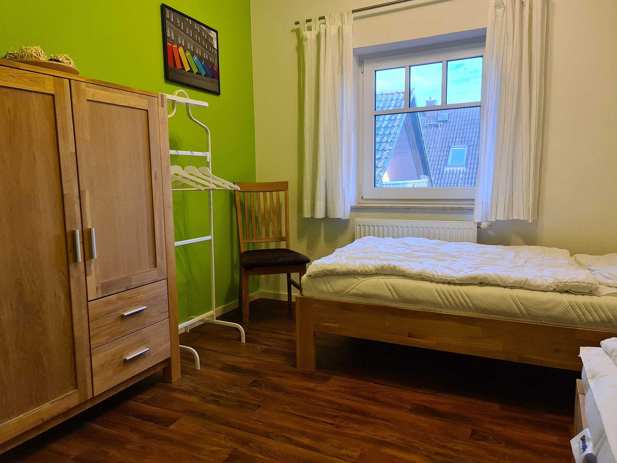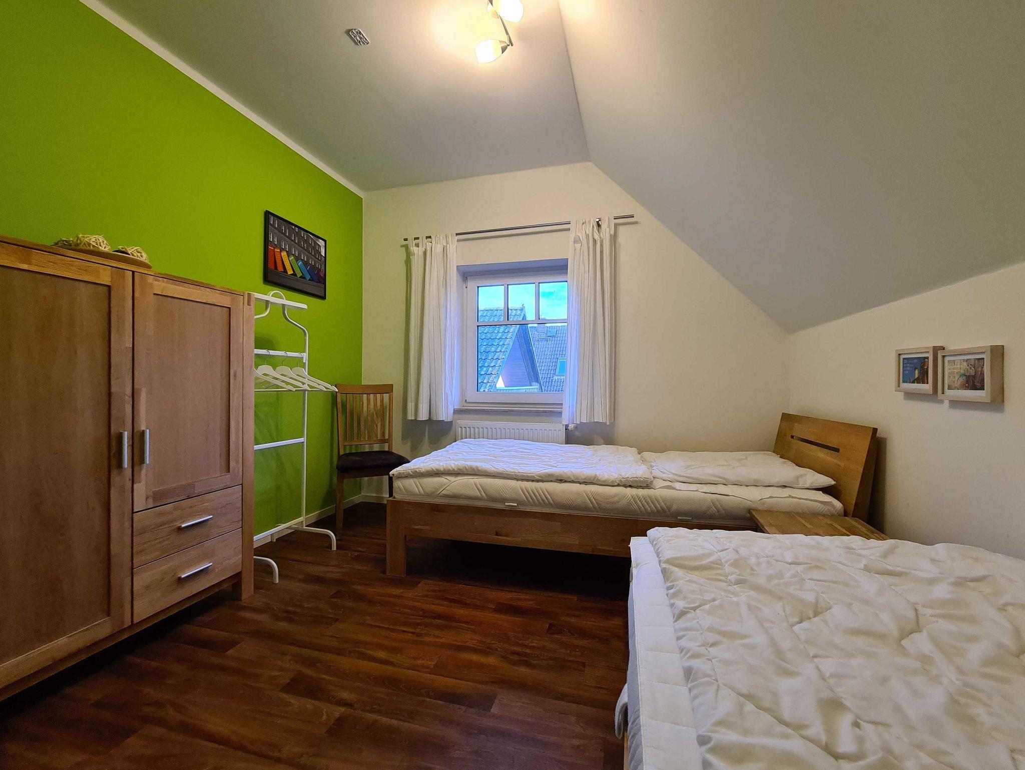 2 Schlafräume: Schlafraum Nr. 1 mit Doppelbett (1,80 x 2 m mit getrennten Matratzen, verstellbare Lattenroste), Schlafraum Nr. 2 mit zwei Einzelbetten (auch zusammenstellbar), Bad mit Badewanne und WC.