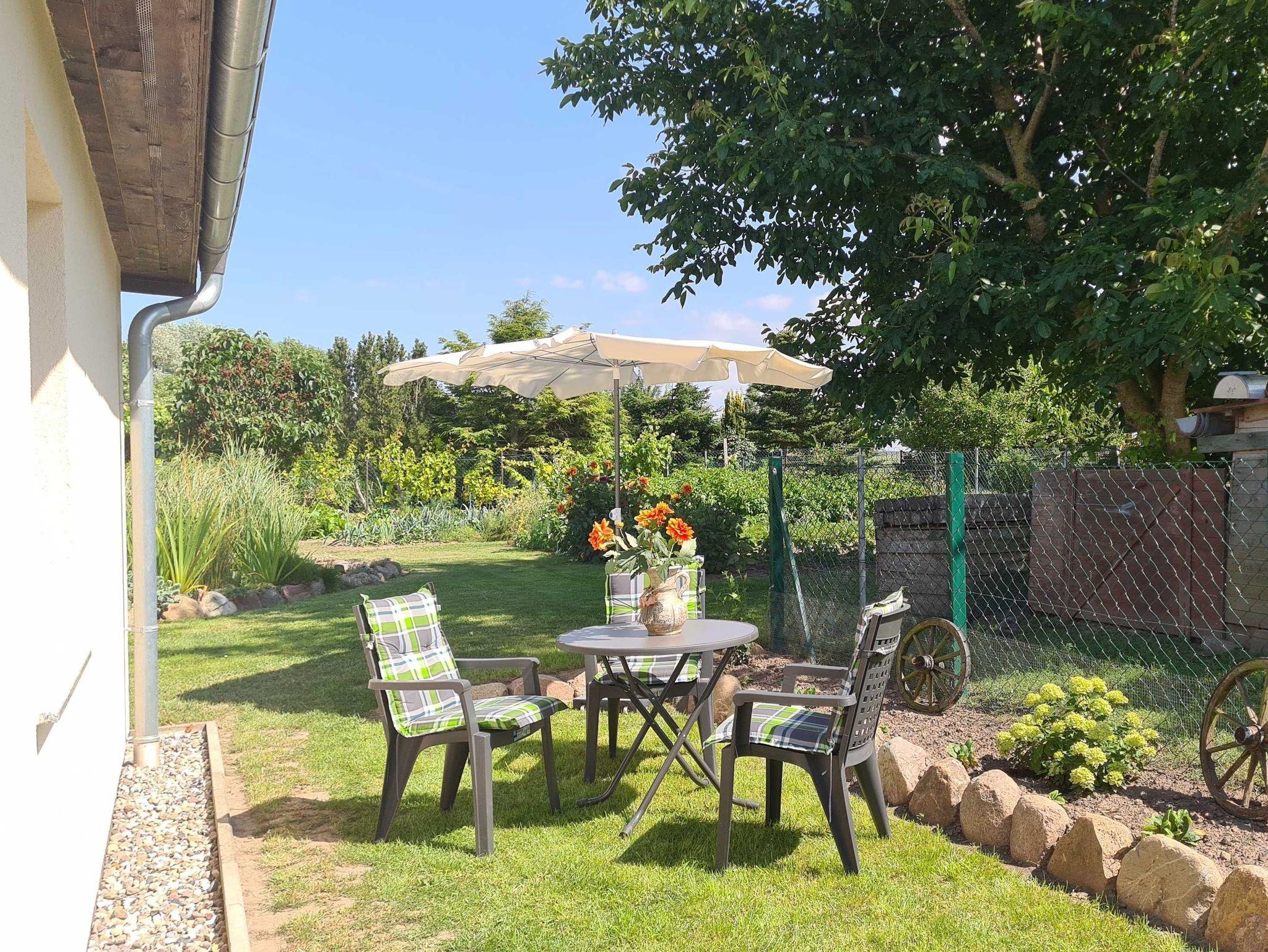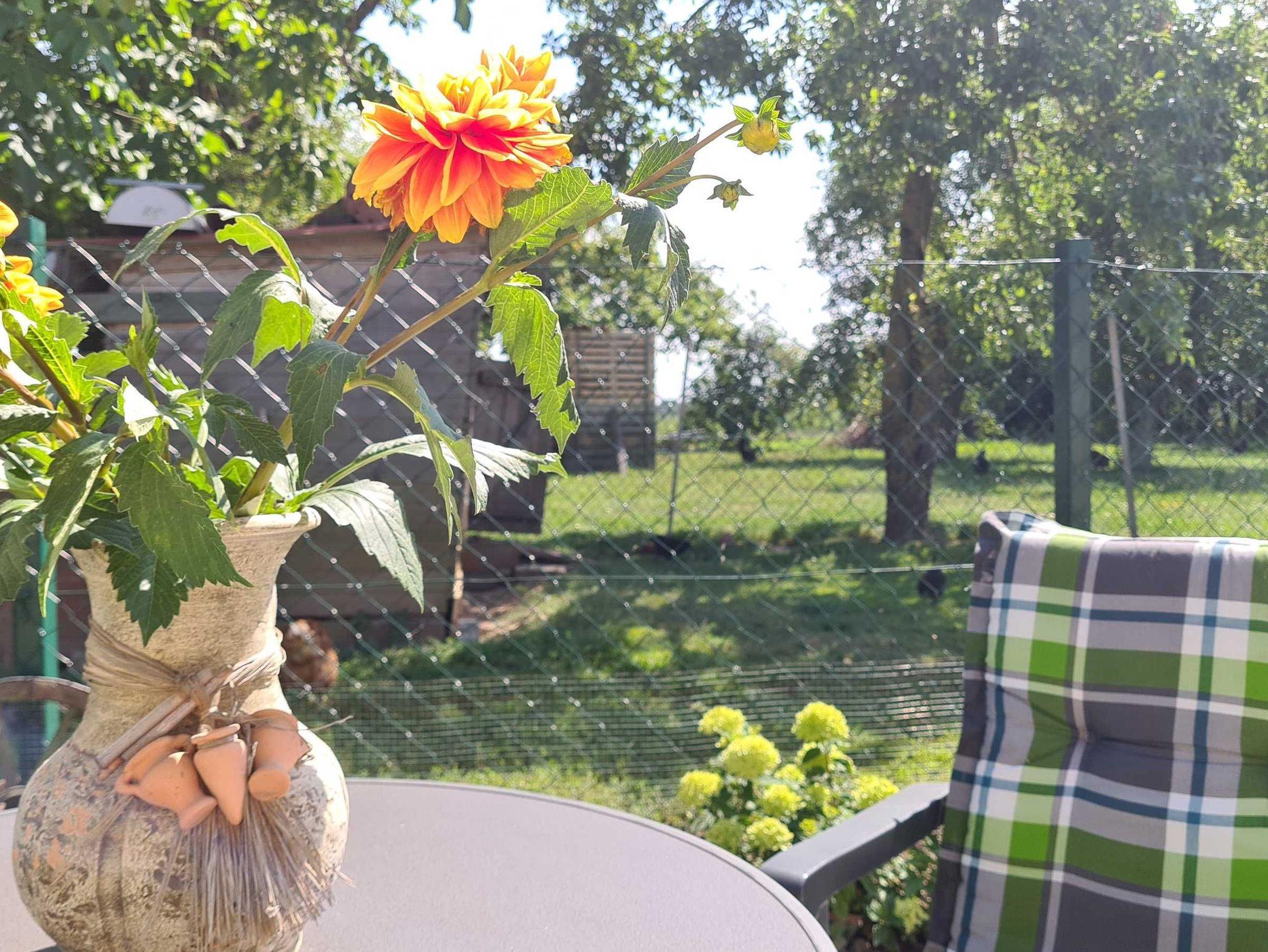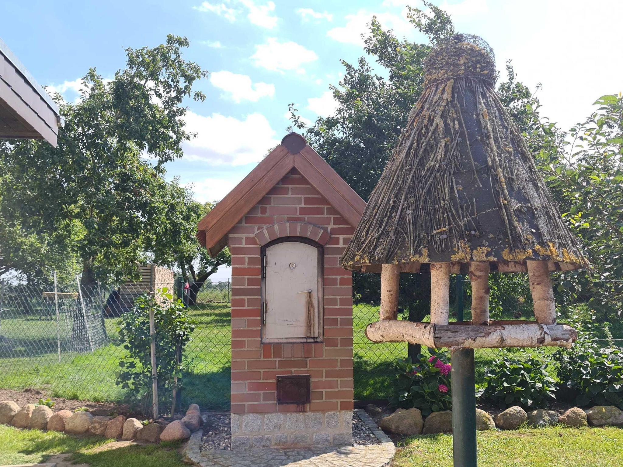Auf 3000m² großem umzäuntem Grundstück stehen das Wohnhaus der Gastgeber, die abschließbare Garage mit Fahrradabstellplatz, das Ferienhaus, der Gartenteich, der große Obst- und Gemüsegarten und der Hühnerhof. Frische Landeier sind bei Verfügbarkeit beim Gastgeber erhältlich.