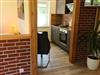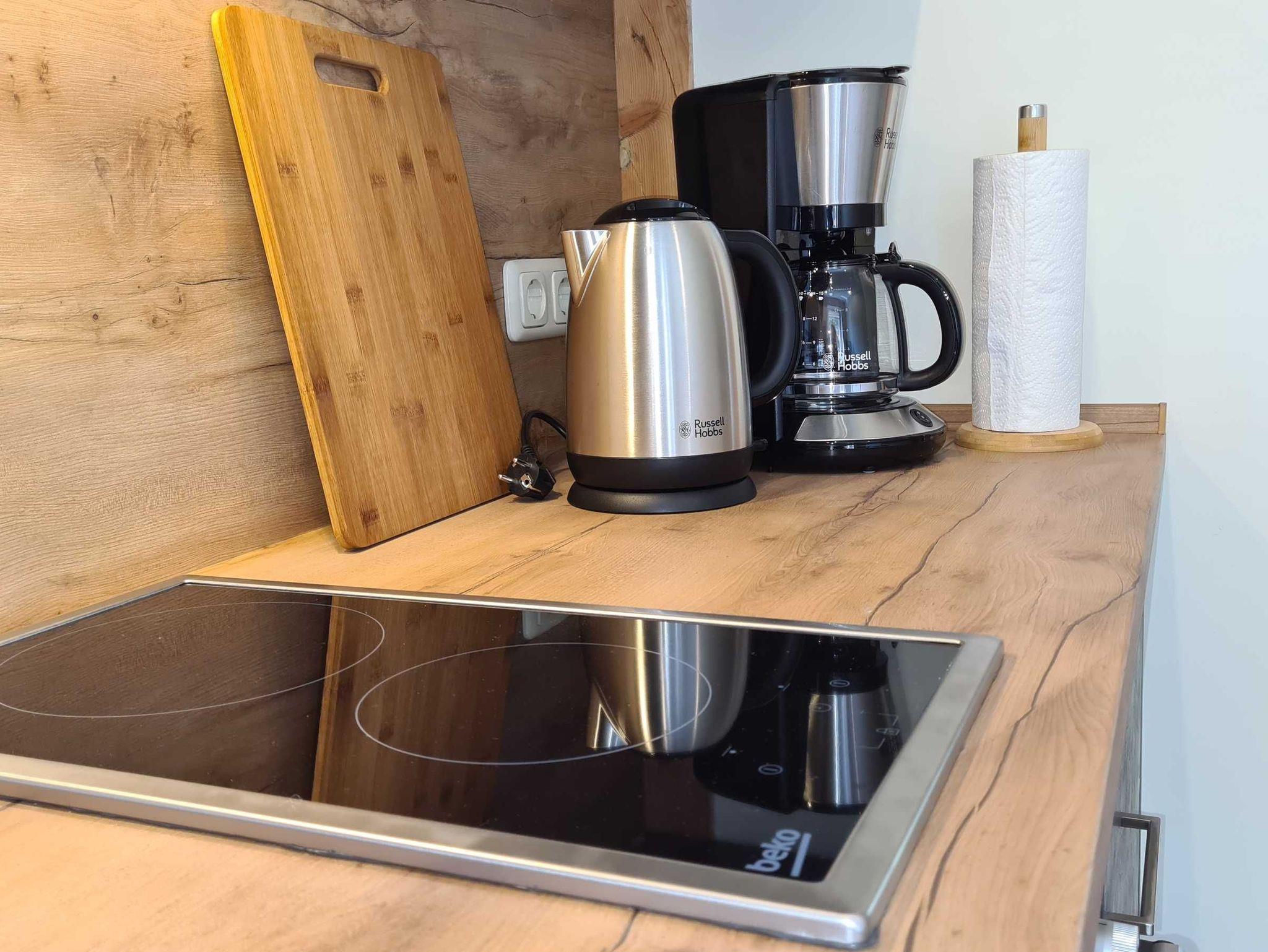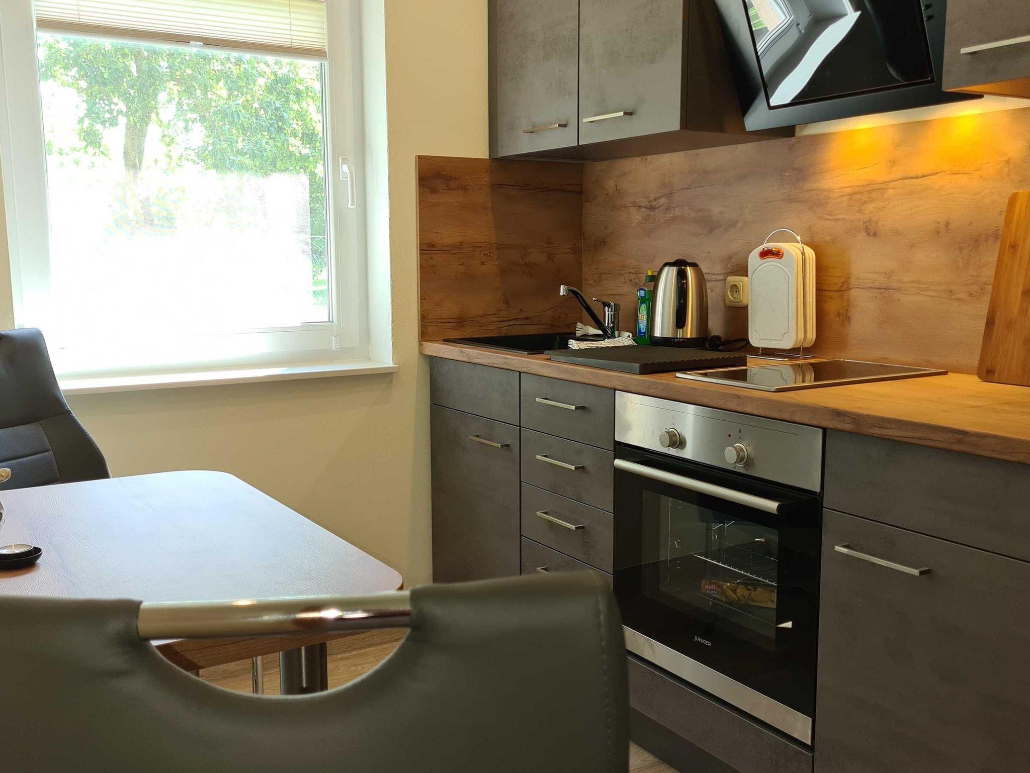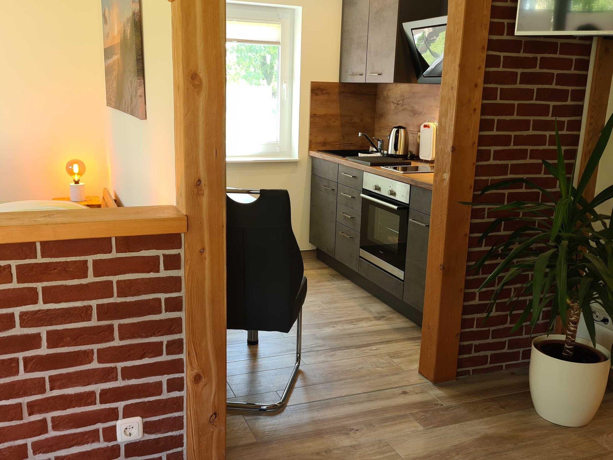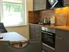 • Küchenecke mit 2-Ceran-Kochplattenherd, Kühlschrank, Backofen, Esstisch