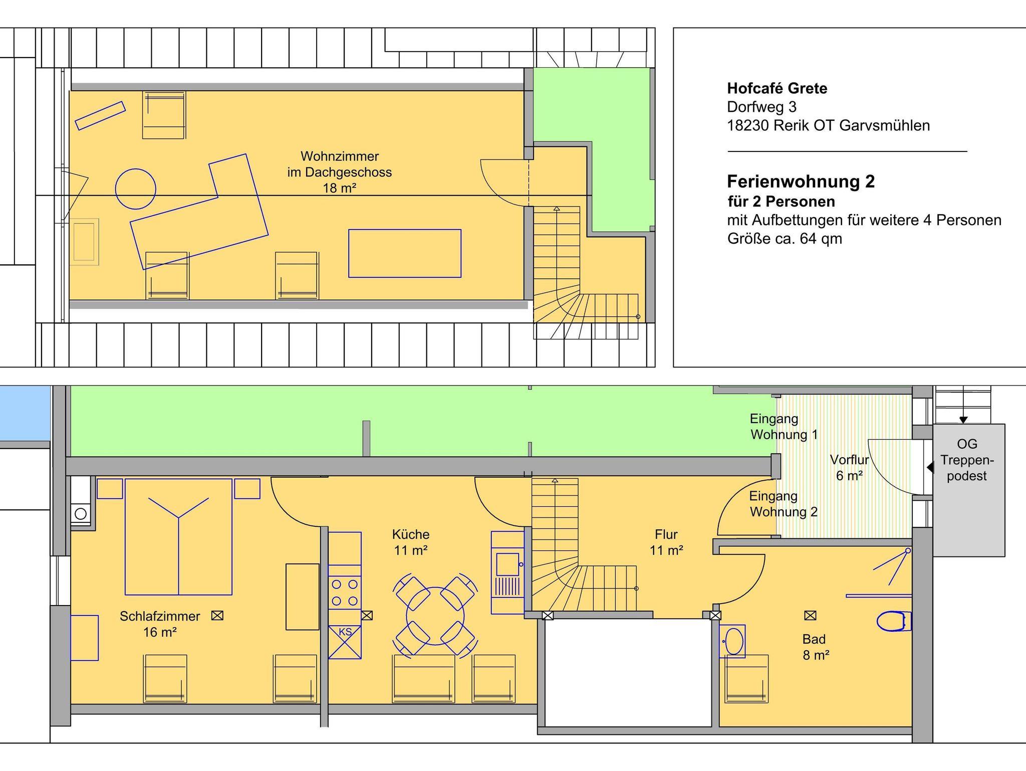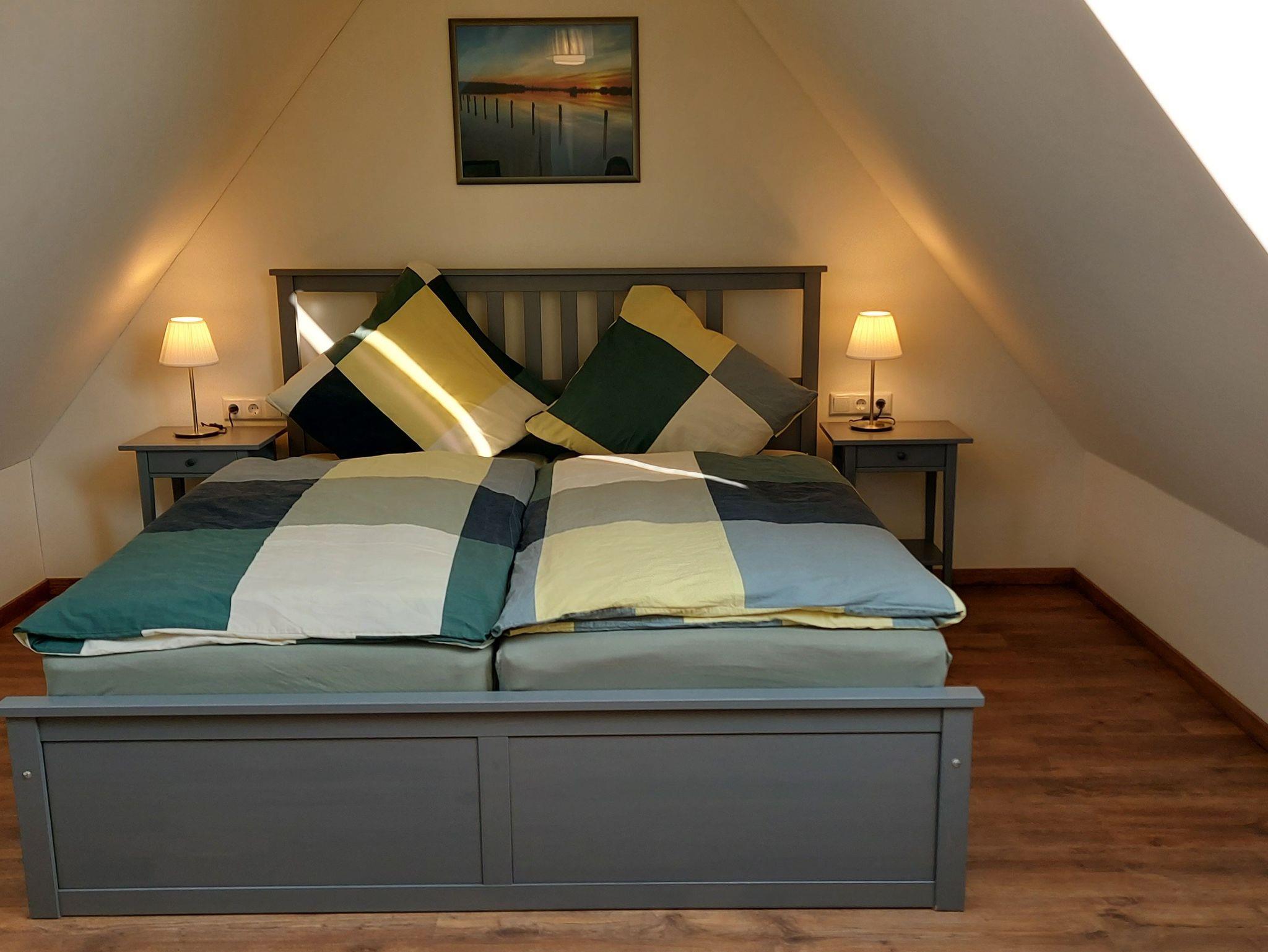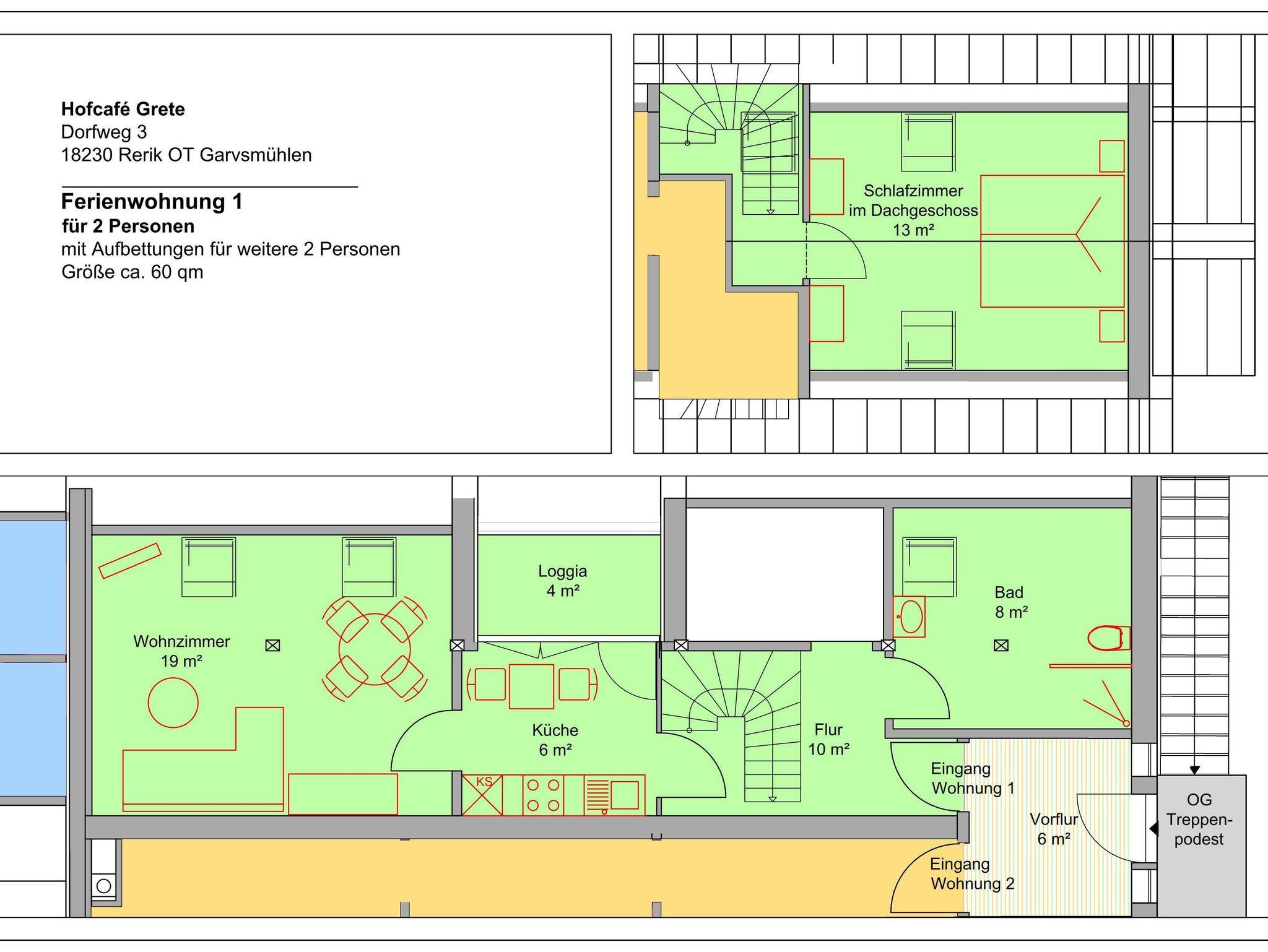 Im 2.OG: befindet sich ein weiterer Schlafraum mit Doppelbett (2 x 0,90 m x 2 m), sowie ein Wohn-/ Schlafraum mit einer Schlafcouch (1,80 m x 2 m) + 2 Einzelbetten (je 0,9 m x 2 m) und TV.