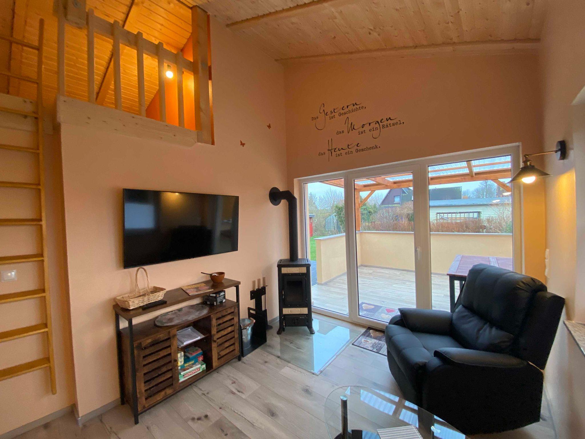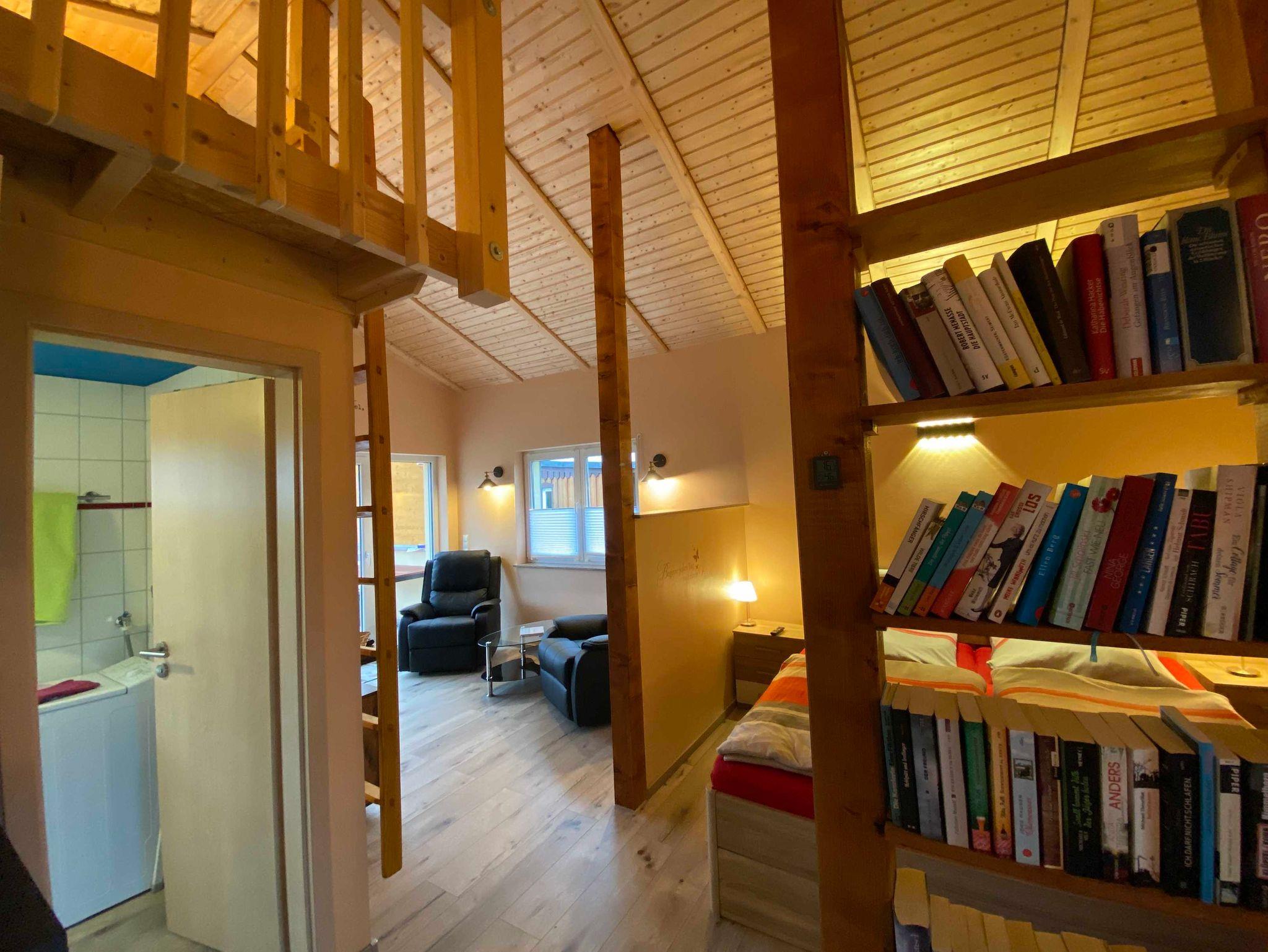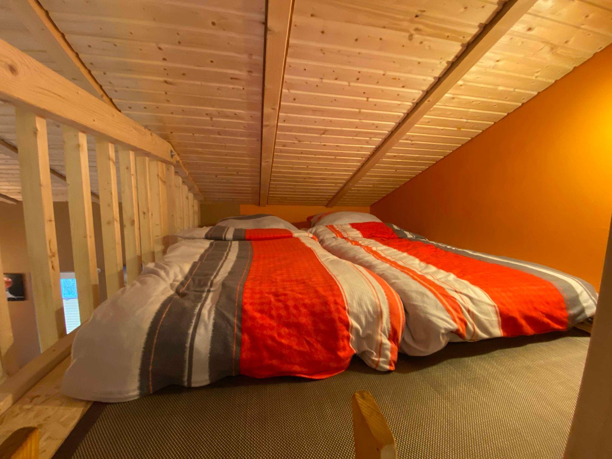 Über der Küche haben wir für unsere kleinen Gäste eine Schlafkoje mit 2 Matratzen eingerichtet (offene Galerie und niedrige Deckenhöhe). Im Schlafzimmer befindet sich ein Doppelbett 180x200 cm mit Bettkasten, Kleiderbügel, ein Fernseher sowie eine Bibliothek. Im Wohnbereich stehen 2 gemütliche Sessel mit Couchtisch und ein weiterer Fernseher zur Verfügung. Das Haus verfügt über eine Fussbodenheizung und einen Kaminofen und wird daher ganzjährig vermietet.