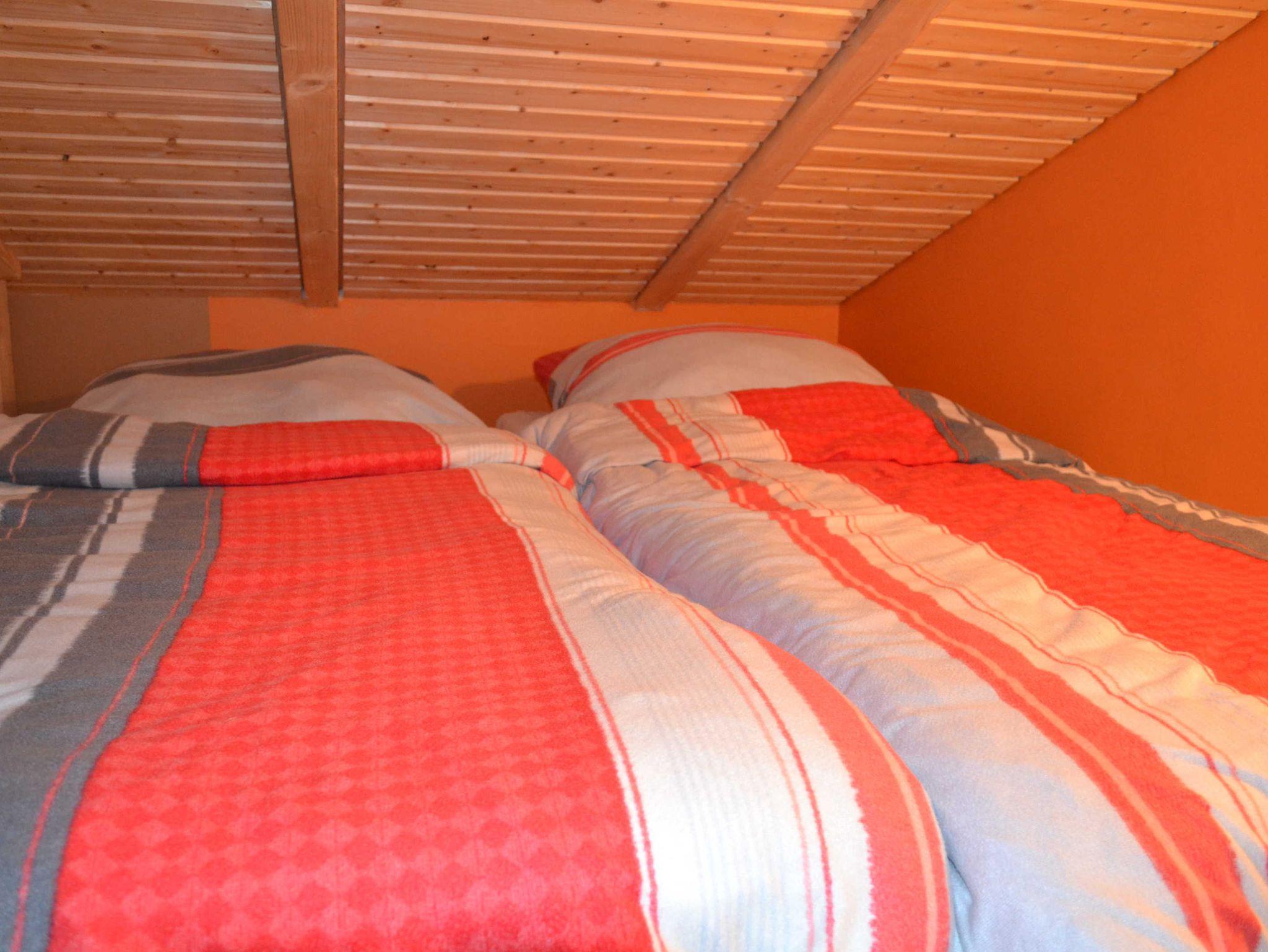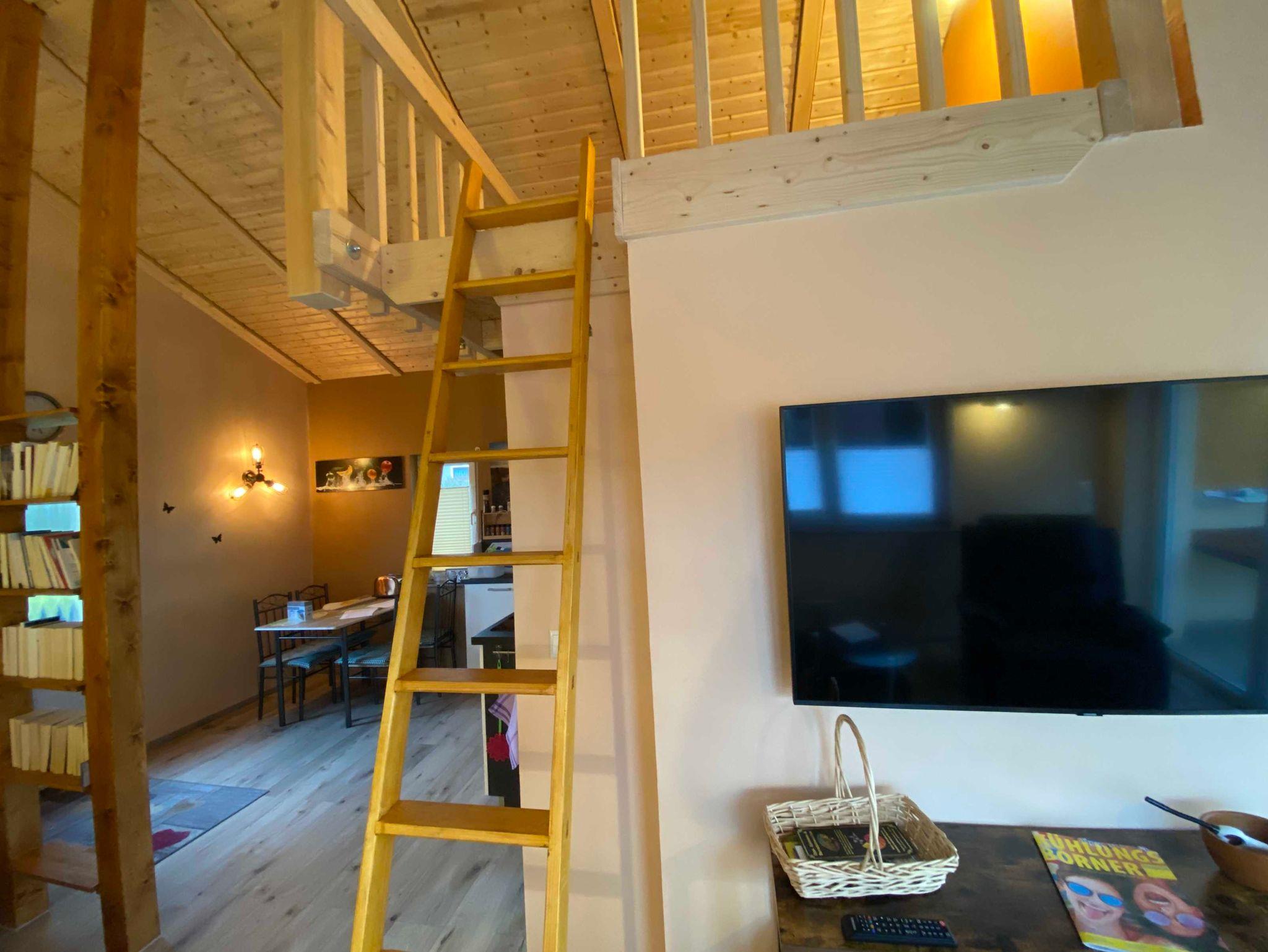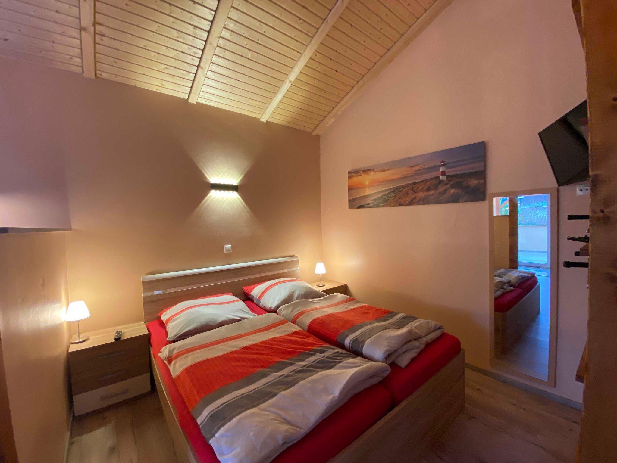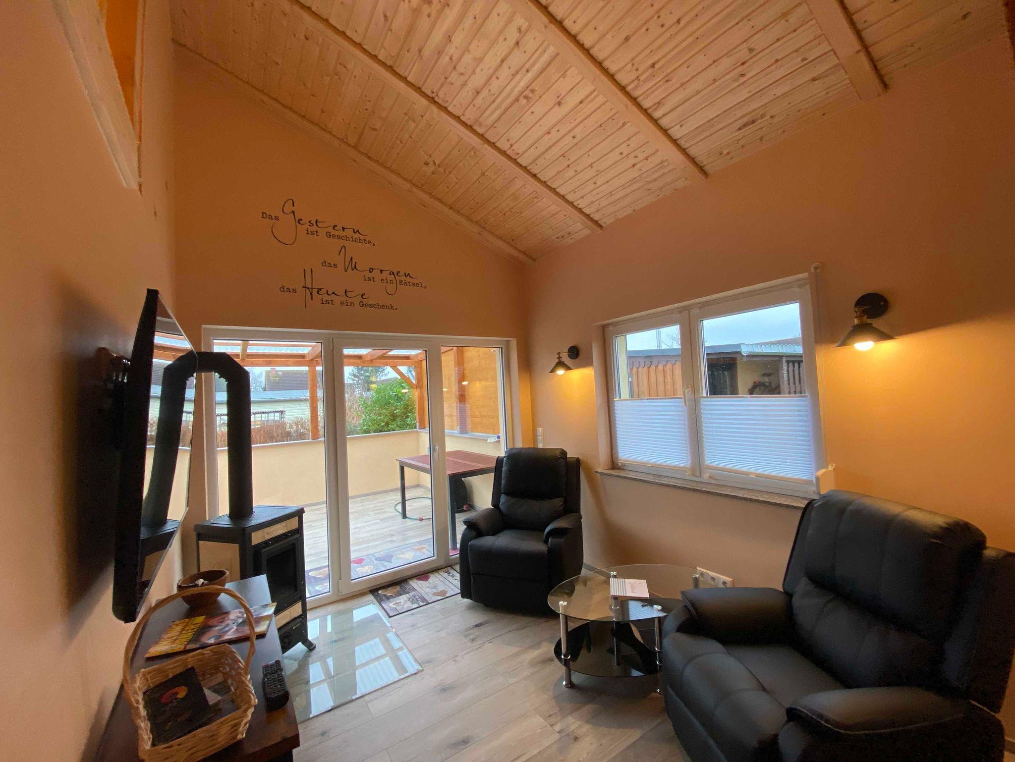 Über der Küche haben wir für unsere kleinen Gäste eine Schlafkoje mit 2 Matratzen eingerichtet (offene Galerie und niedrige Deckenhöhe). Im Schlafzimmer befindet sich ein Doppelbett 180x200 cm mit Bettkasten, Kleiderbügel, ein Fernseher sowie eine Bibliothek. Im Wohnbereich stehen 2 gemütliche Sessel mit Couchtisch und ein weiterer Fernseher zur Verfügung. Das Haus verfügt über eine Fussbodenheizung und einen Kaminofen und wird daher ganzjährig vermietet.
