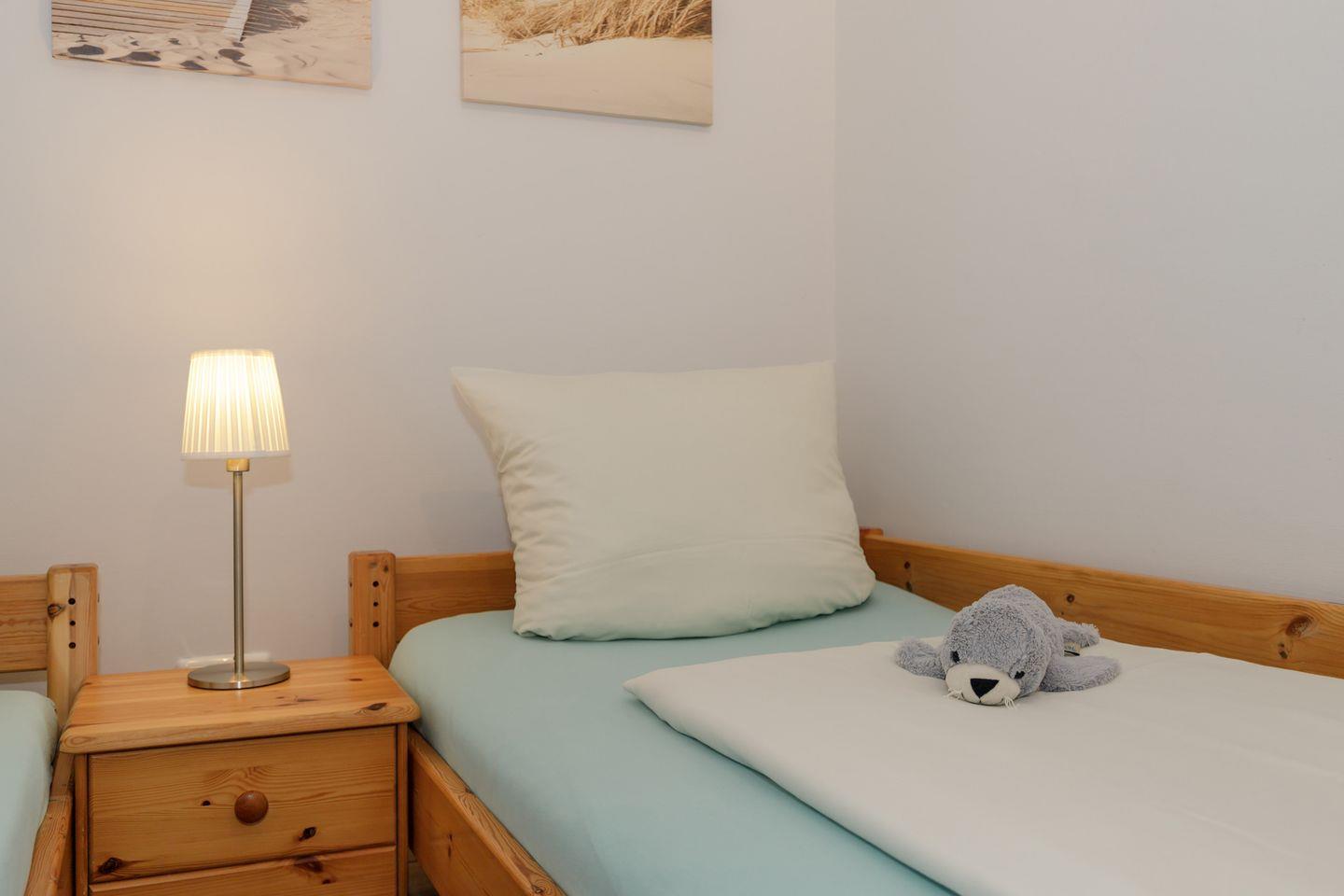 Das große Schlafzimmer hat ein Doppelbett (180x200), hier ist auch Platz für ein Reisekinderbettchen. Im kleinen Schlafzimmer stehen 2 Einzelbetten (90x200) . Bettwäsche ist bereits im Mietpreis enthalten.