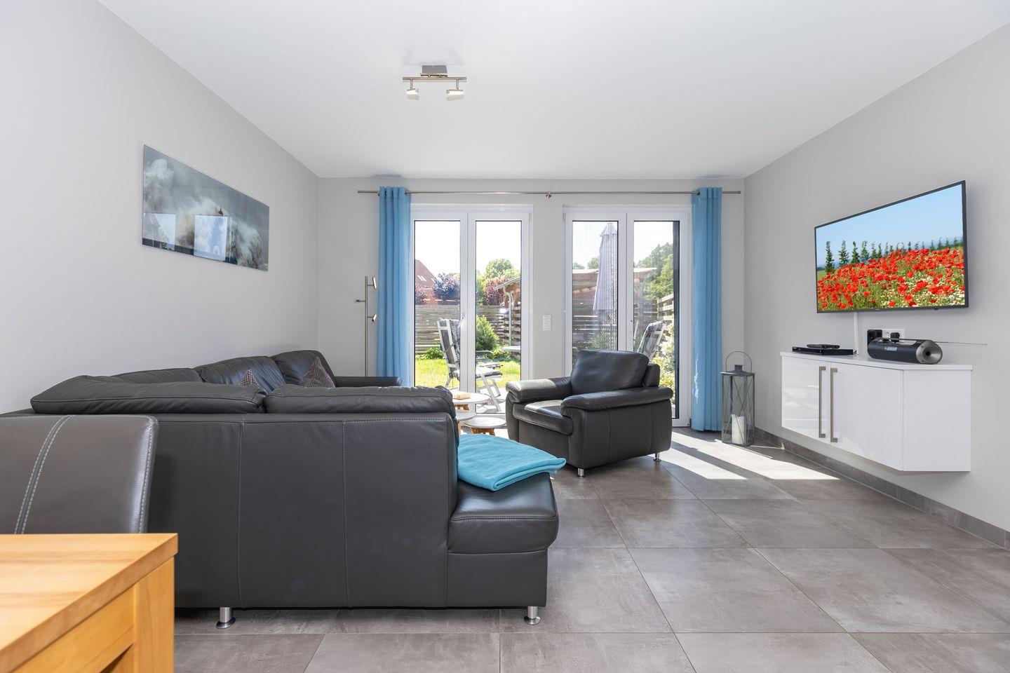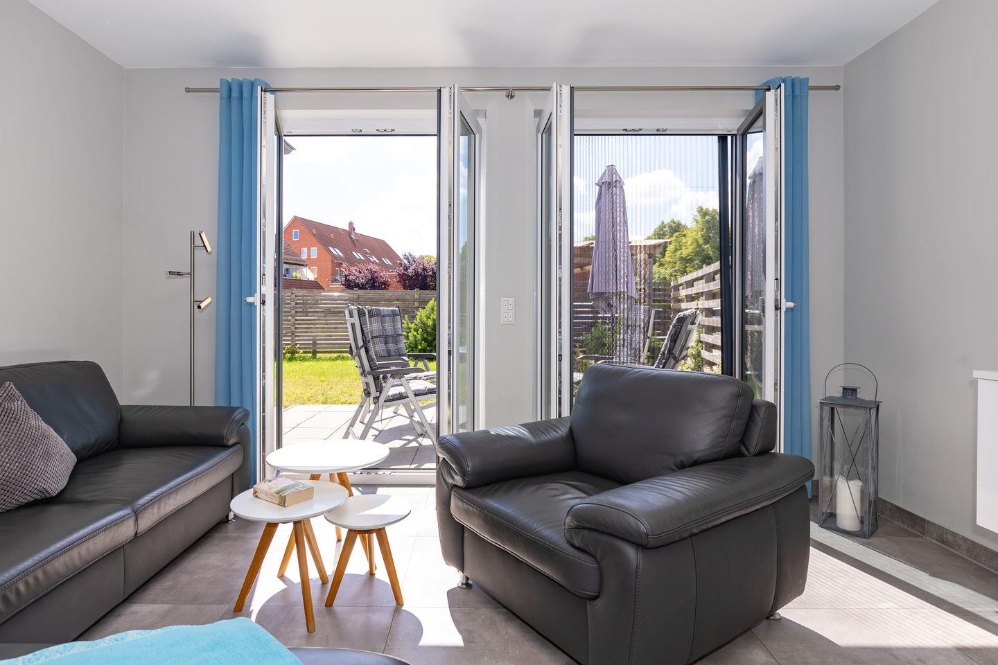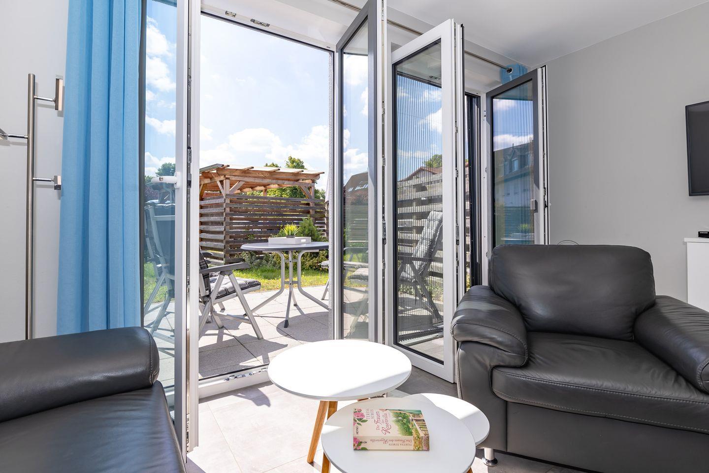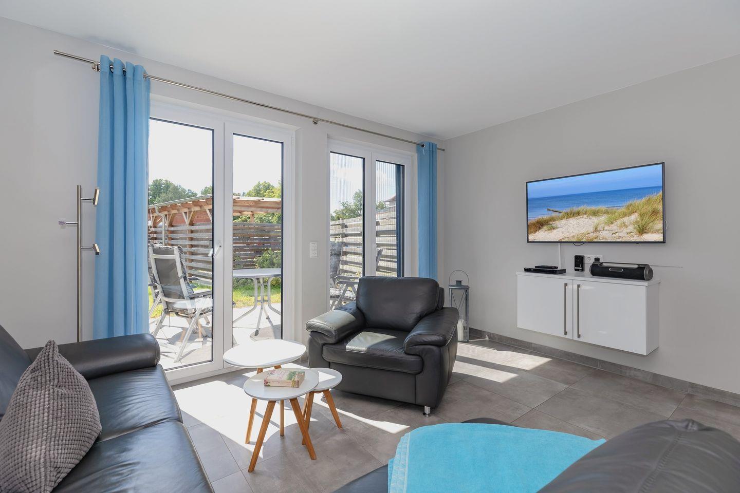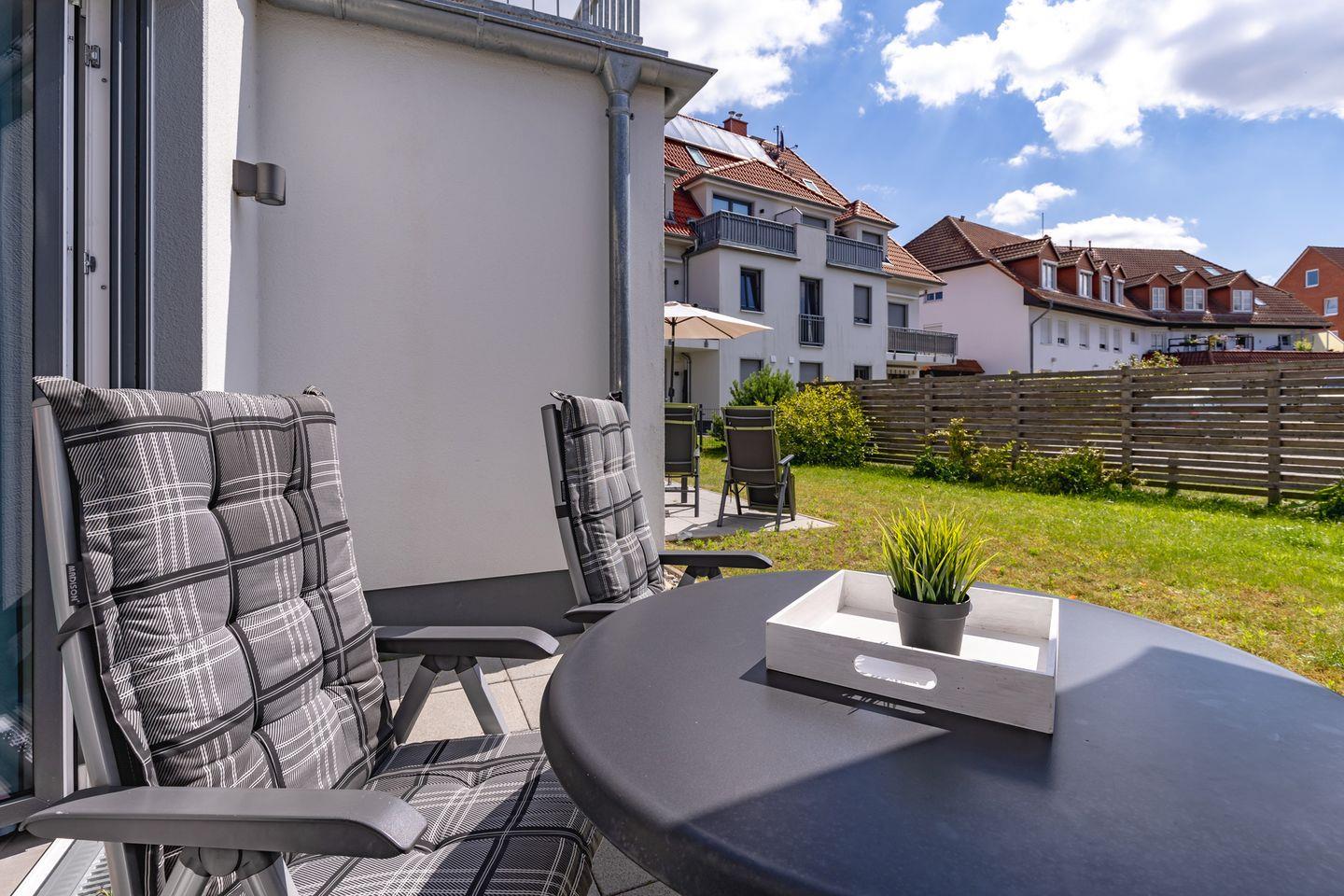 Im Außenbereich erwartet Sie: eine einladende Terrasse mit Gartenmöbeln und Sonnenschirm. Sie laden dazu ein, den Tag im sanften Ostseewind ausklingen zu lassen.