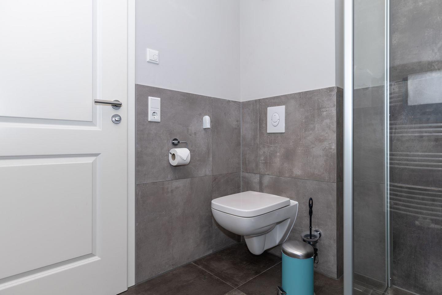 Das Badezimmer: Bodengleiche Dusche, WC, Waschbecken, Spiegel und Haartrockner – stilvoll, praktisch und immer bereit für den Alltag.