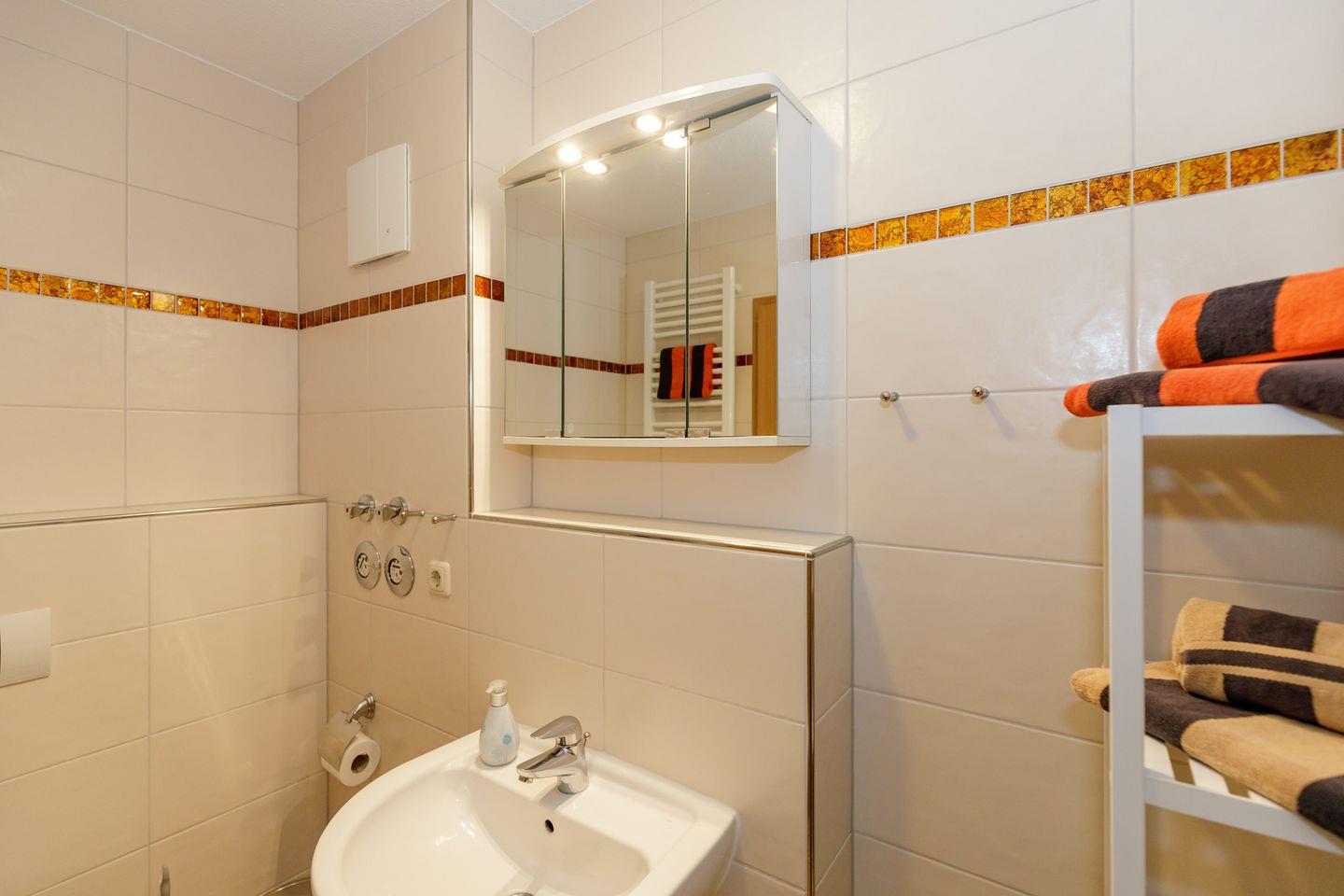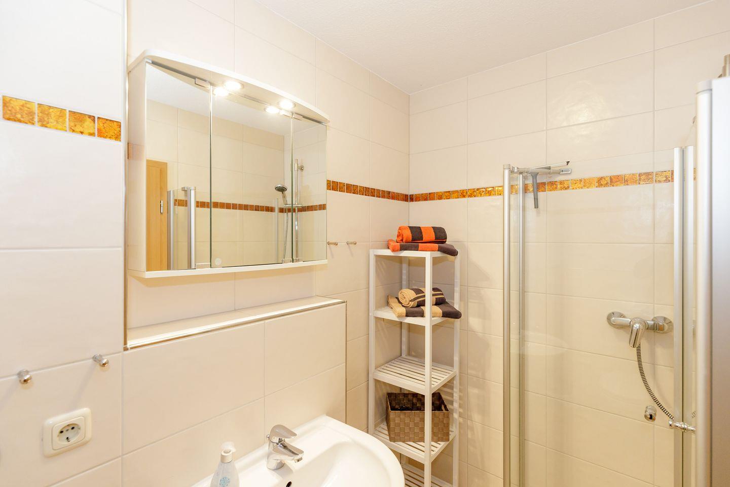 Das Badezimmer ist mit einer Dusche, einem Waschbecken, WC, Spiegel und einem Haartrockner ausgestattet – hier können Sie sich nach einem Tag am Strand frisch machen. Ein Wäscheständer ist ebenfalls vorhanden, sodass Sie auch nach längeren Aufenthalten ausreichend Flexibilität haben.