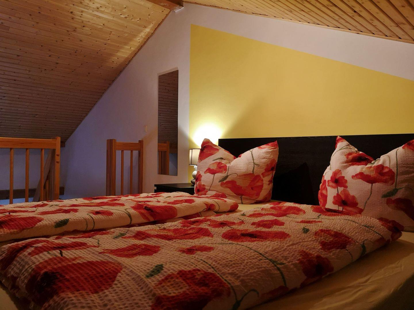 Über eine Holztreppe gelangen Sie nach oben in den gemütlichen Schlafbereich mit großem Bett (180x200), Kleiderschrank, Sideboard und Flachbildfernseher.