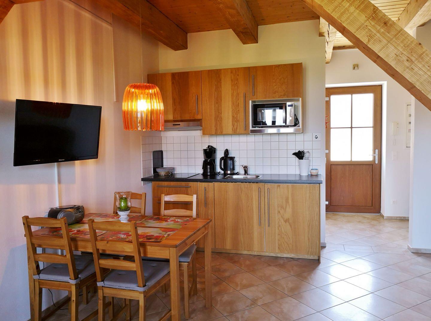 Im Erdgeschoss erwartet Sie ein gemütlicher Wohn-Essbereich mit Schlafcouch (140x200) und Flachbildfernseher, dazu eine vollausgestattete Küche und ein Bad.