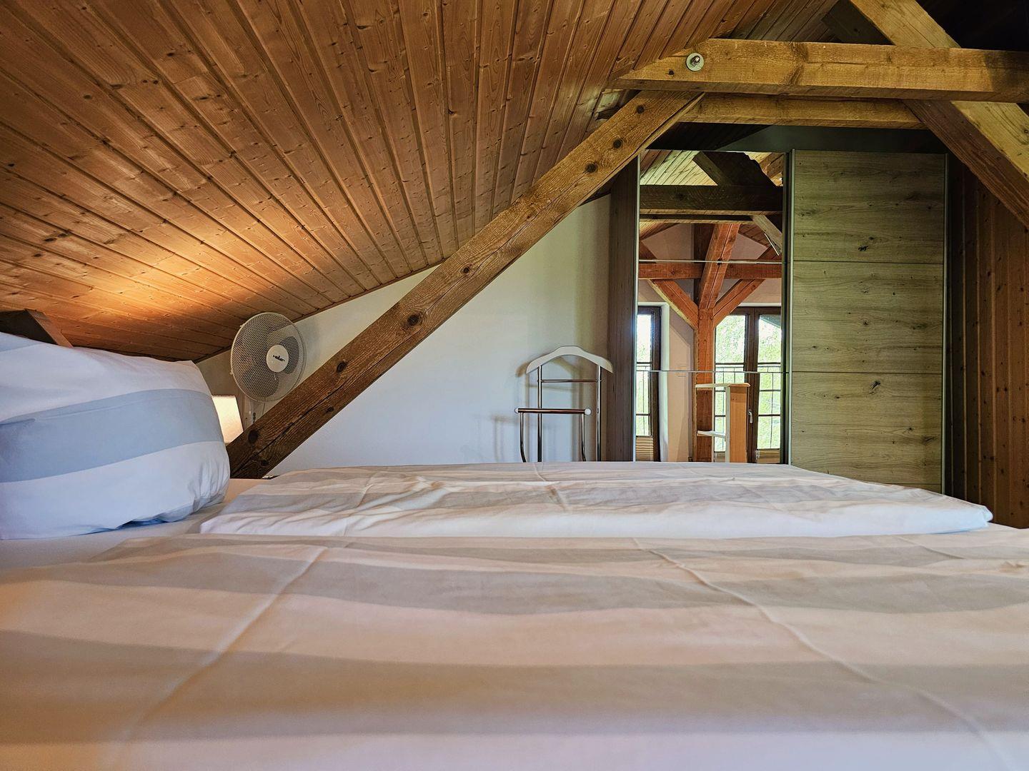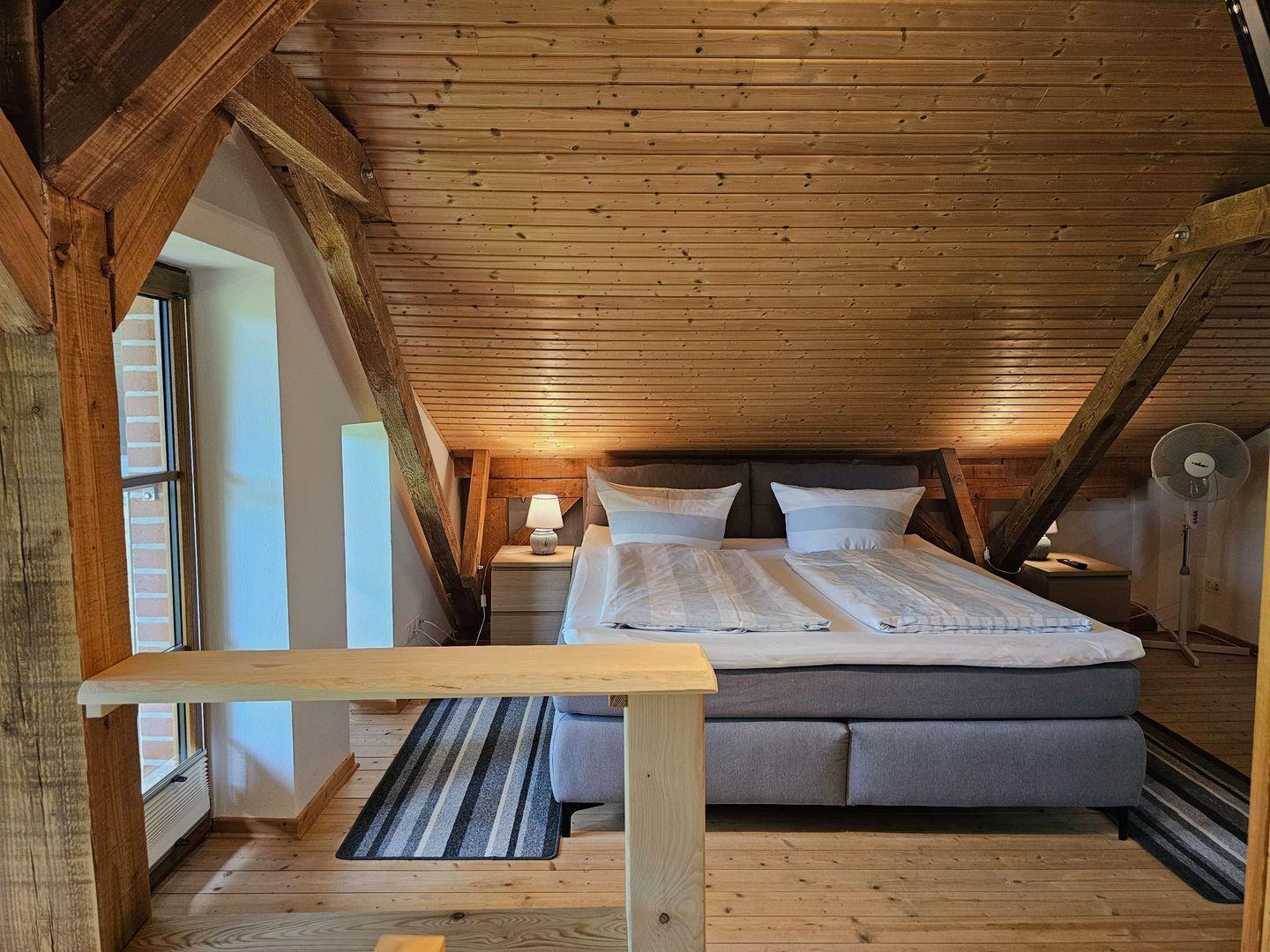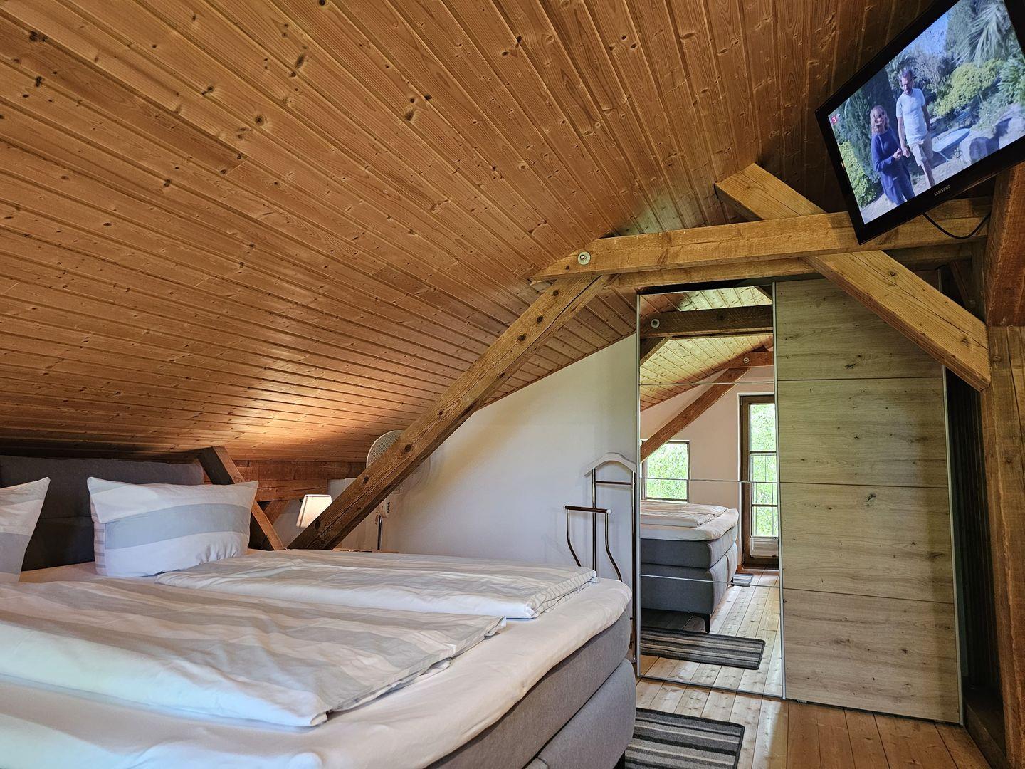 Über eine Holztreppe gelangen Sie nach oben in den Schlafbereich mit einem gemütlichen Boxspringbett (180x200), Kleiderschrank, Sideboard und Flachbildfernseher.