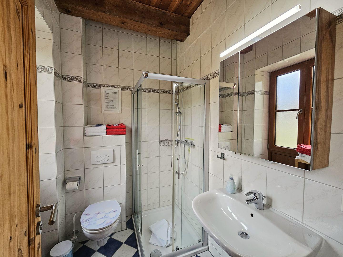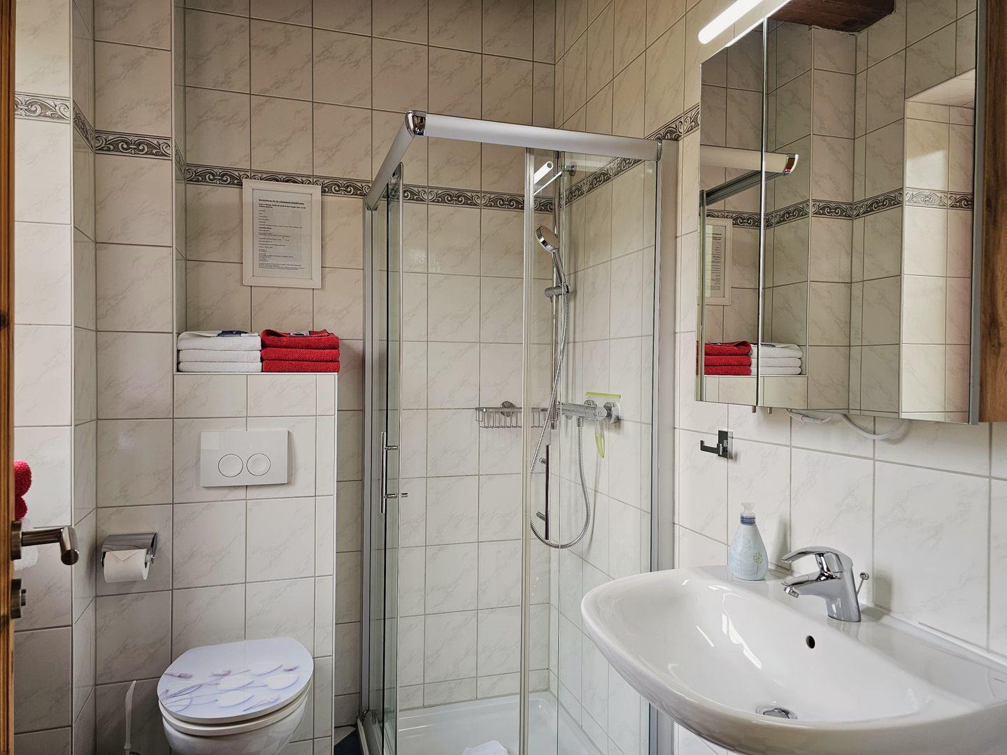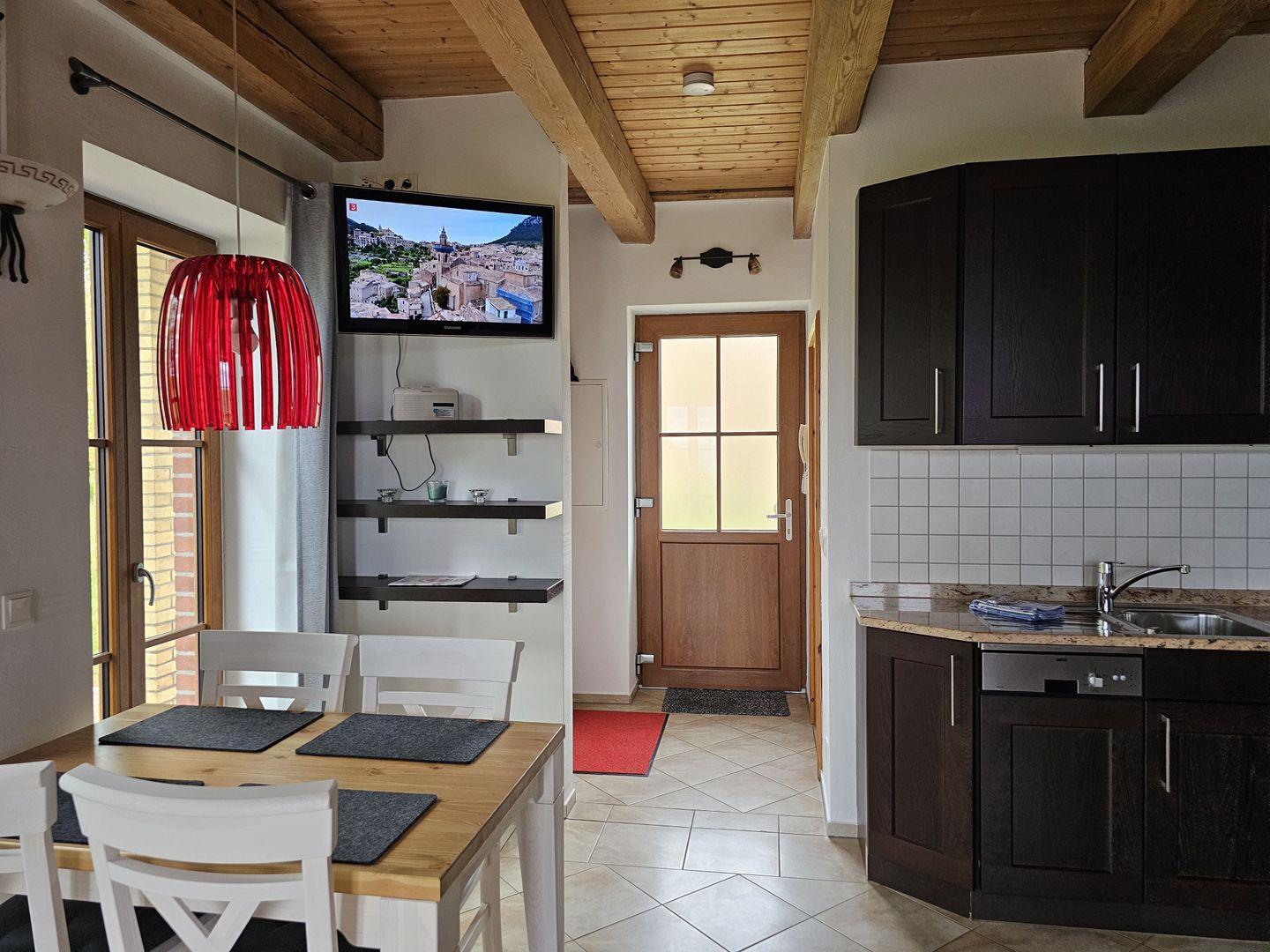 Im Erdgeschoss erwartet Sie ein gemütlicher Wohn-Essbereich mit großer Eckcouch mit Schlaffunktion (180x200) und Flachbildfernseher, dazu eine vollausgestattete Küche und ein Bad mit Dusche.