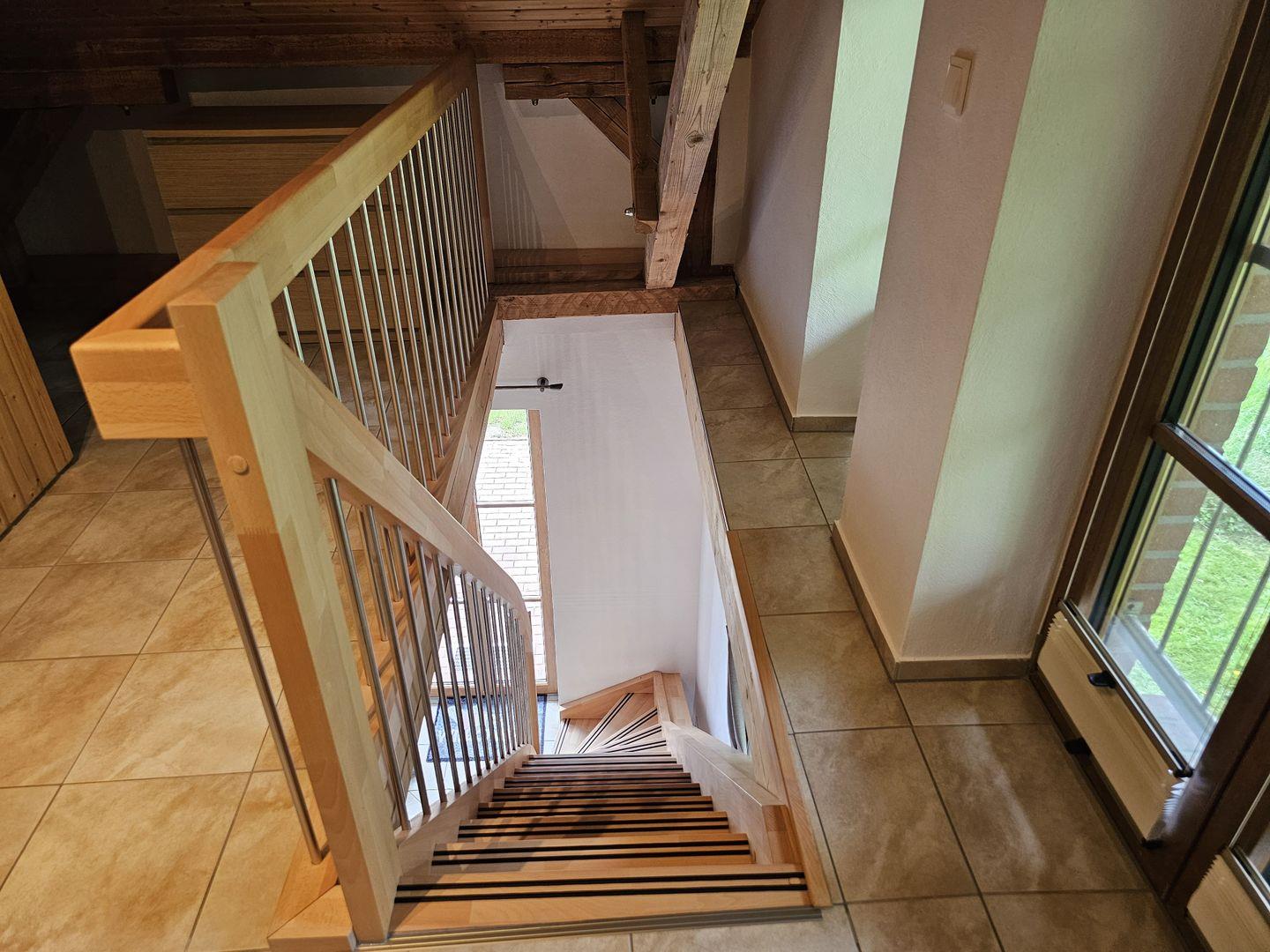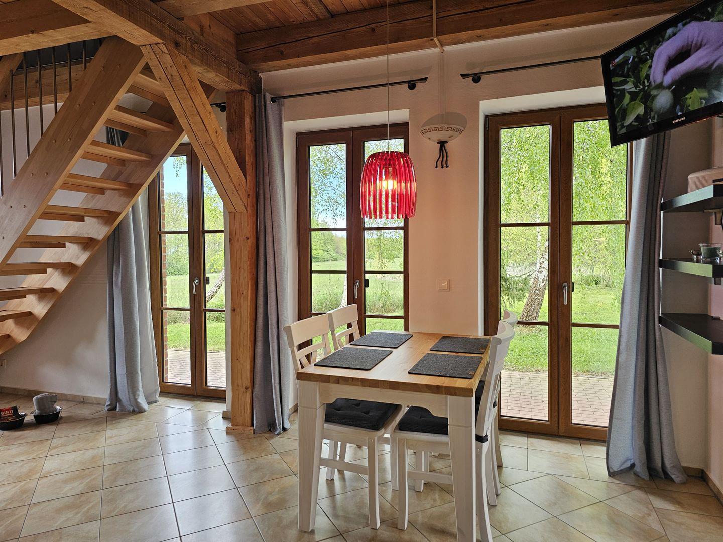Im Erdgeschoss erwartet Sie der Wohn-Essbereich mit einer Eckcouch und Flachbildfernseher, eine vollausgestattete Küche und ein Bad mit Dusche. Über eine Holztreppe gelangen Sie nach oben in den Schlafbereich mit großem Boxspringbett (180x200), Kleiderschrank und einem 2. TV.