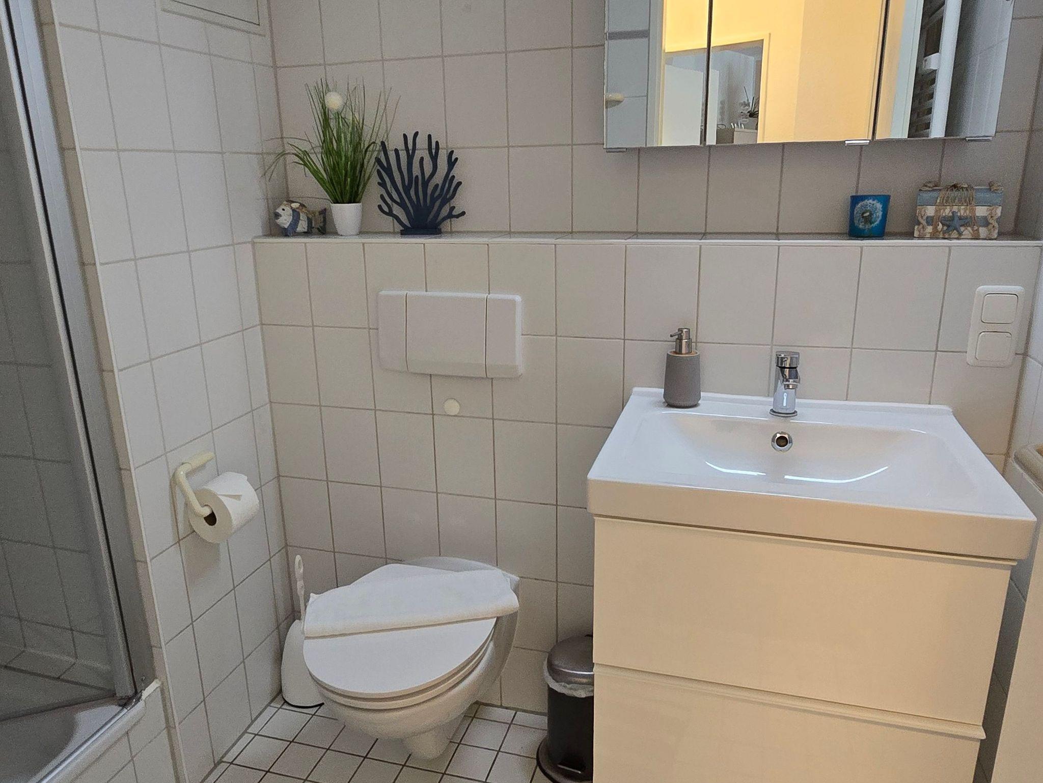Das Badezimmer verfügt über eine Dusche mit einem WC.