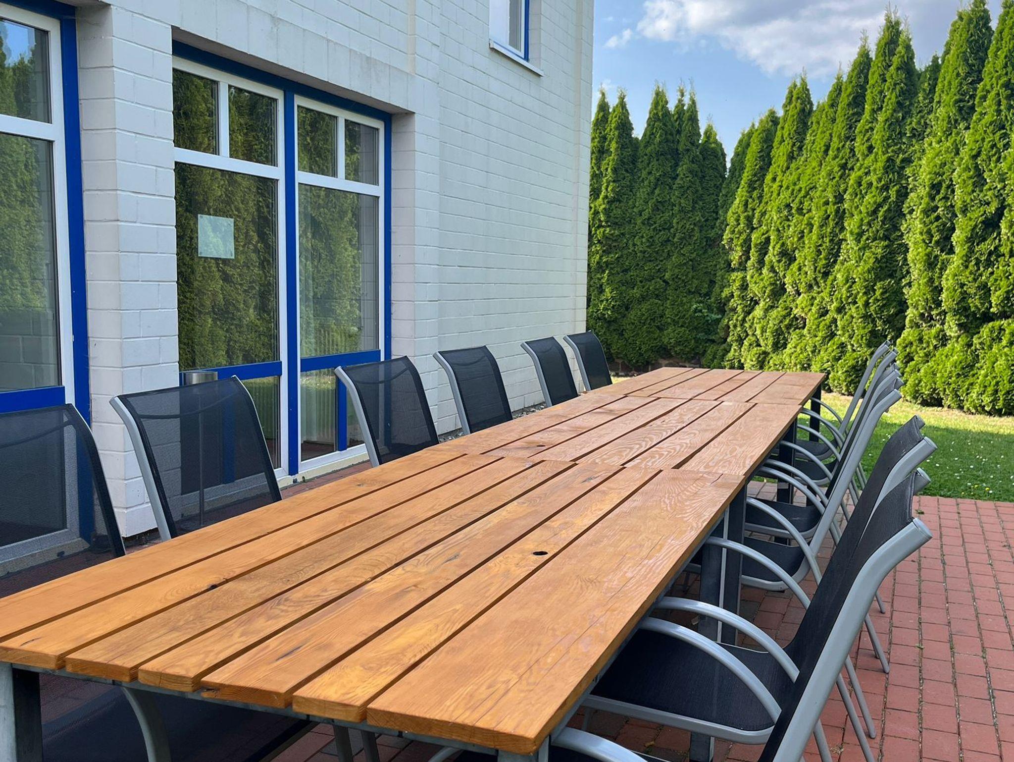 Einfache, praktische Ausstattung, Terrasse mit Morgensonne und Sonnenterrassen mit Hecken rund ums Haus. Gemeinsame Indoor-Spielhalle mit Tischkicker, Tischtennis, Billard.